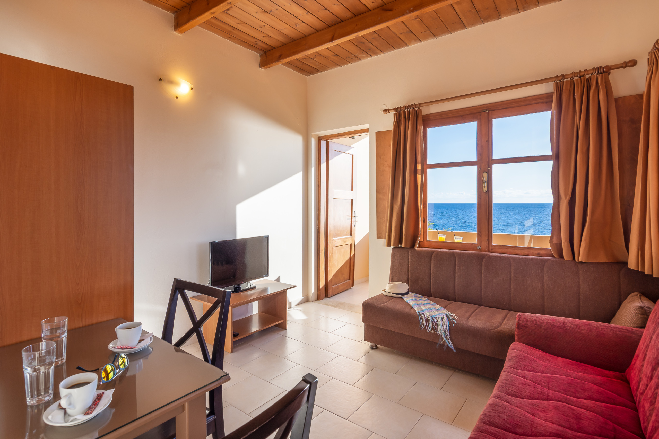 The apartment features a comfortable double bedroom, a living room, a bathroom, and a balcony with table and chairs—perfect for soaking in the view with your morning coffee or evening drink.