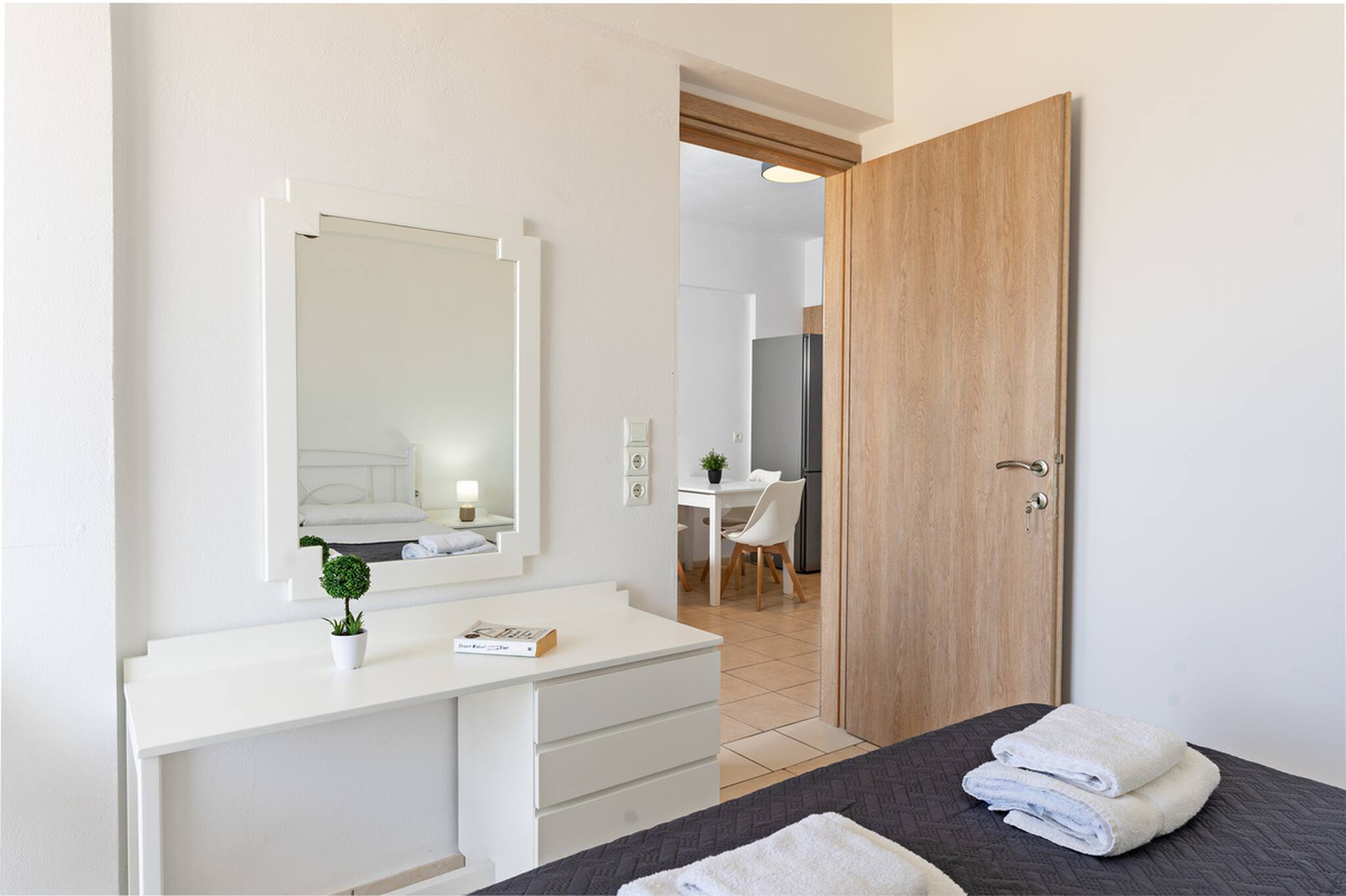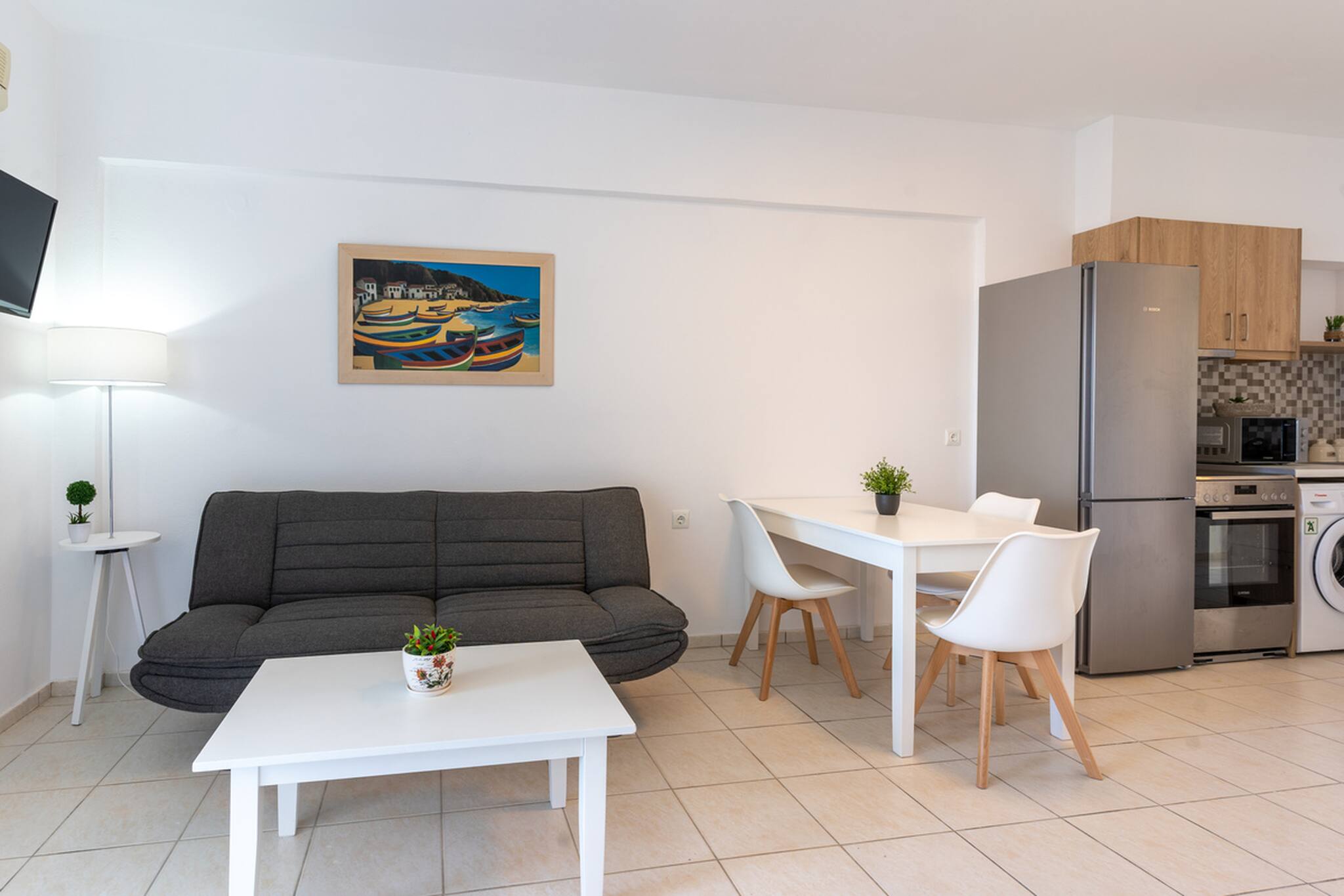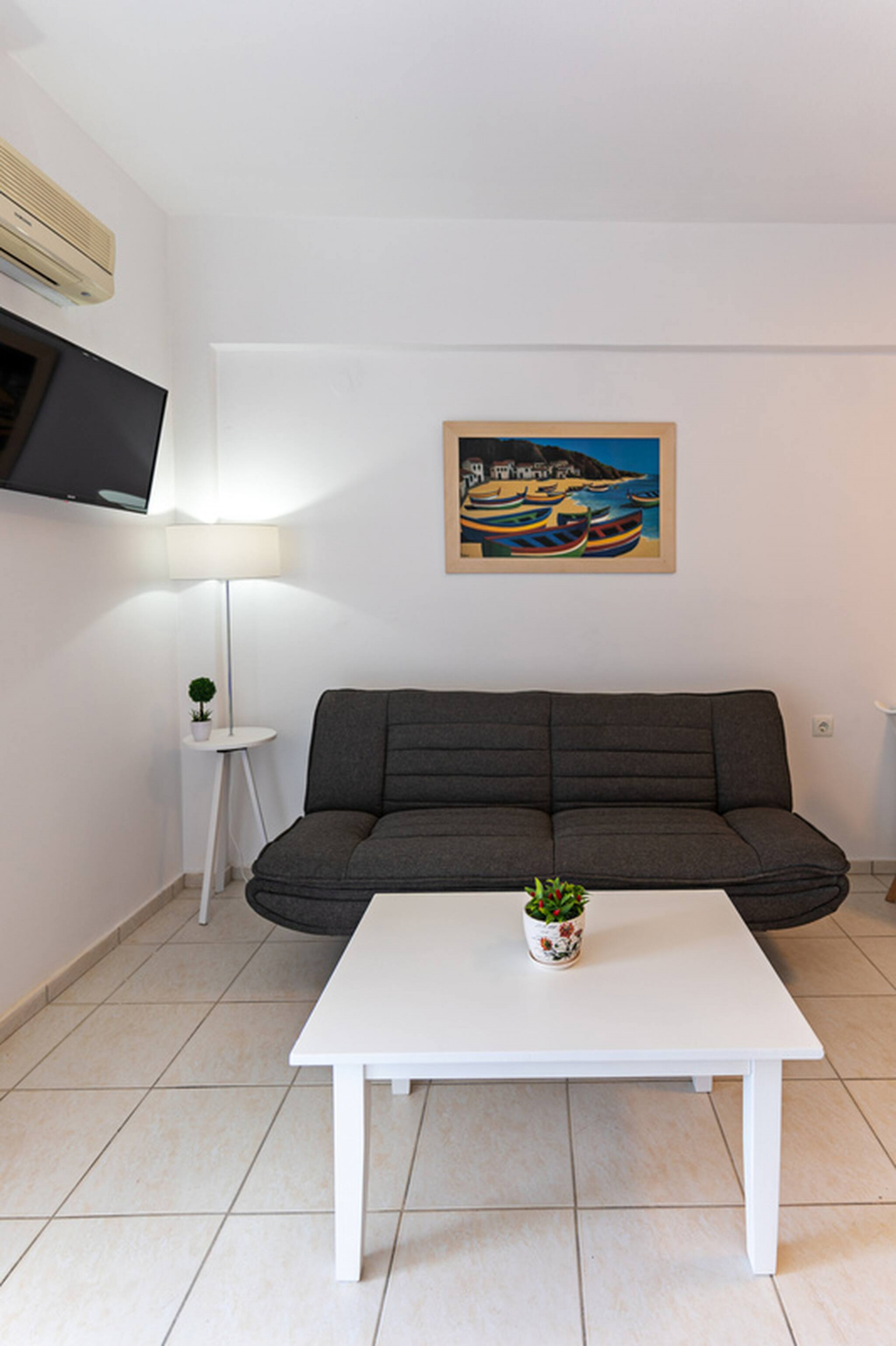 The rocky public beach in front of the complex is natural and not maintained, while a sandy beach is just a few meters away. The property is in a pleasant residential area, within walking distance of shops, tavernas, cafés, and a bus stop to Rethymno city — an ideal base for a relaxing seaside holiday in Crete.