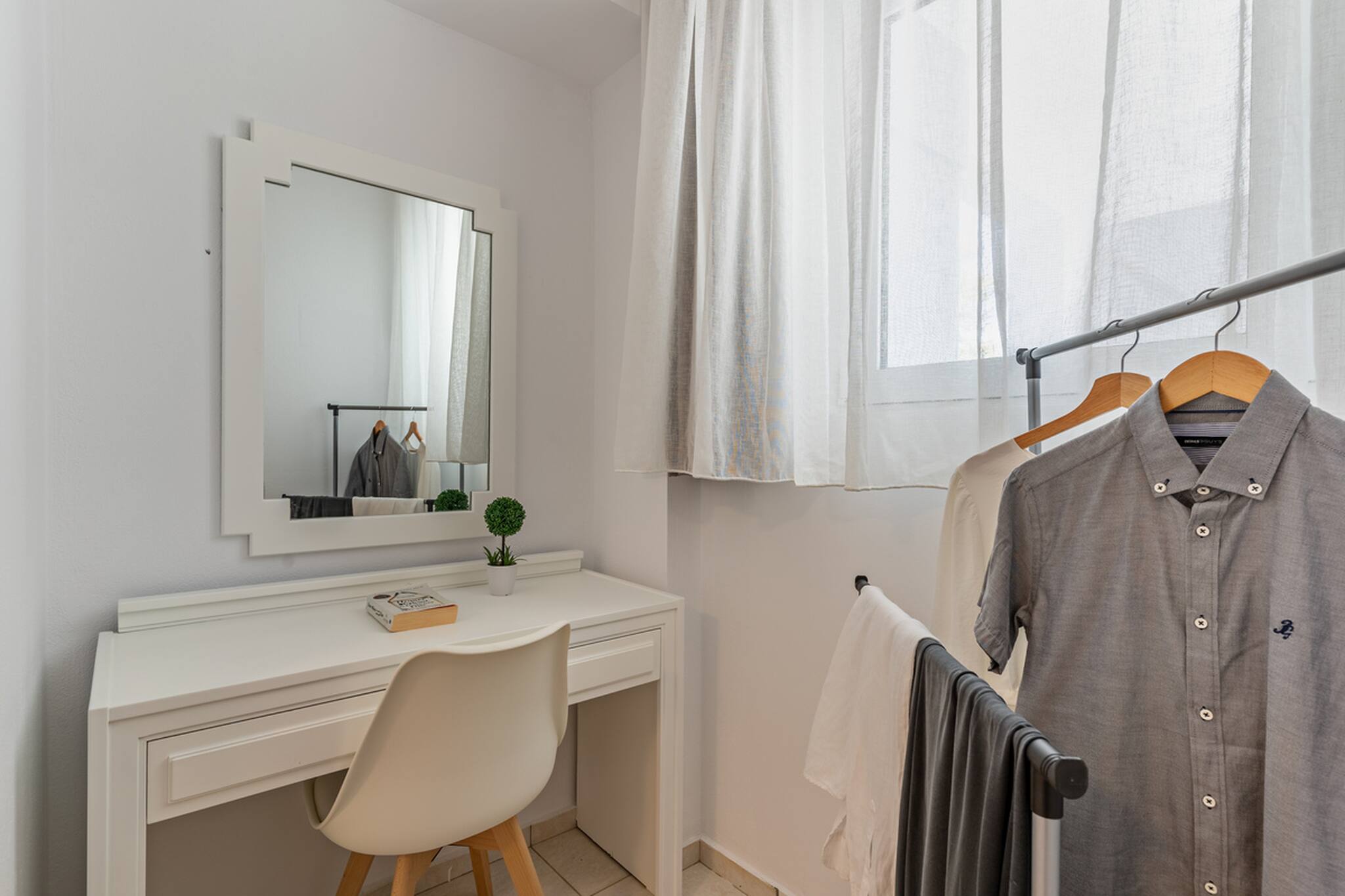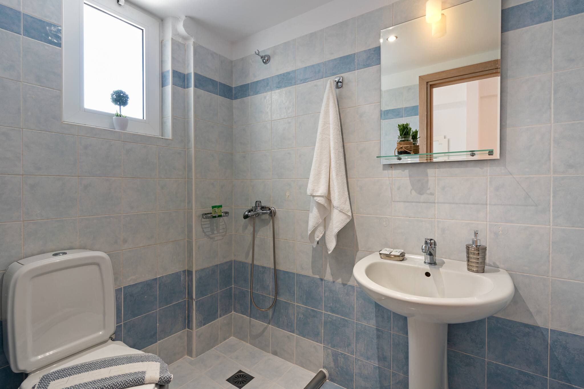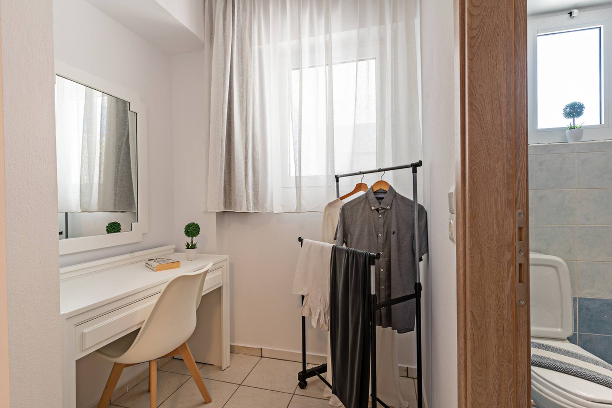 The rocky public beach in front of the complex is natural and not maintained, while a sandy beach is just a few meters away. The property is in a pleasant residential area, within walking distance of shops, tavernas, cafés, and a bus stop to Rethymno city — an ideal base for a relaxing seaside holiday in Crete.