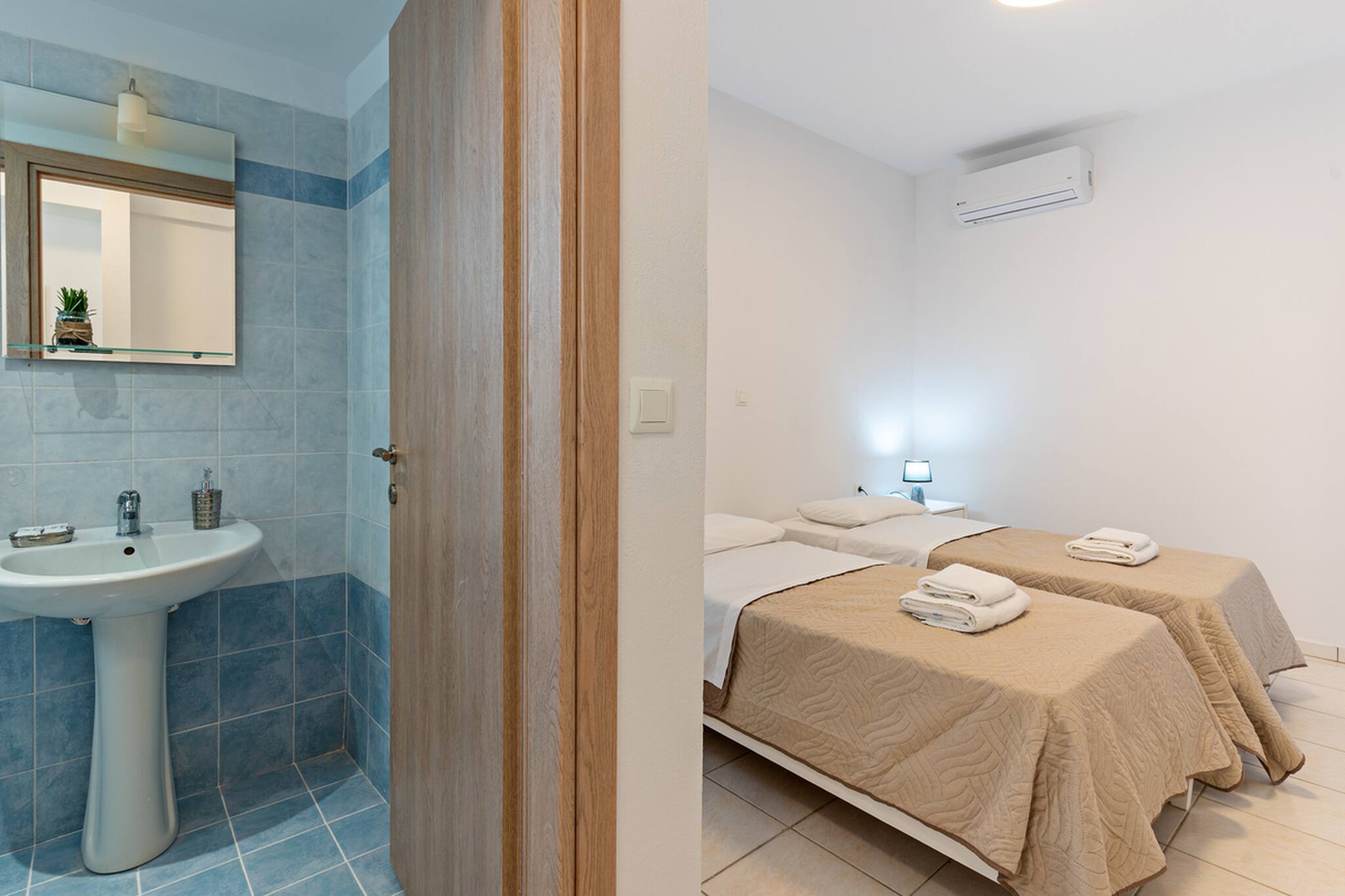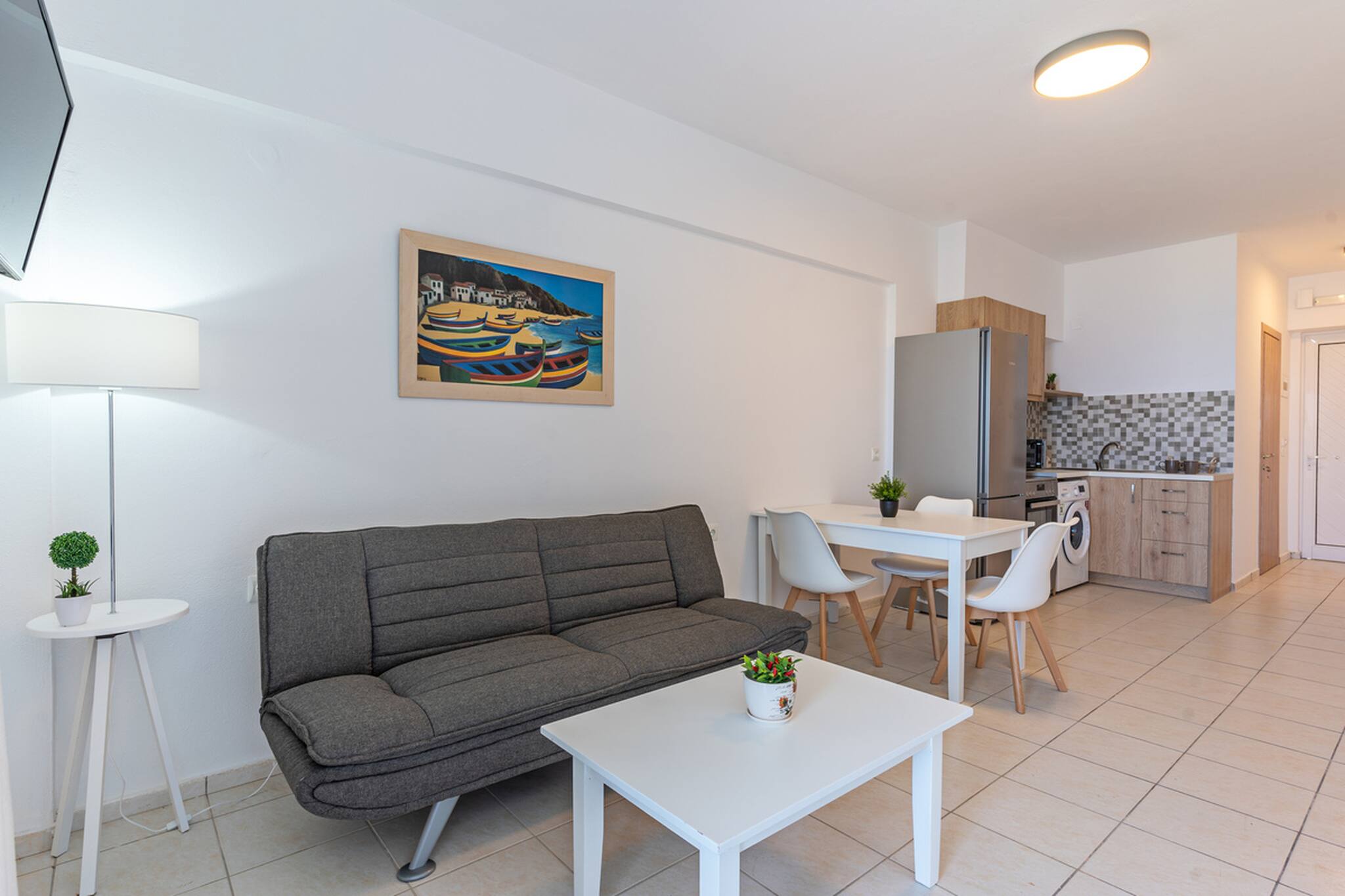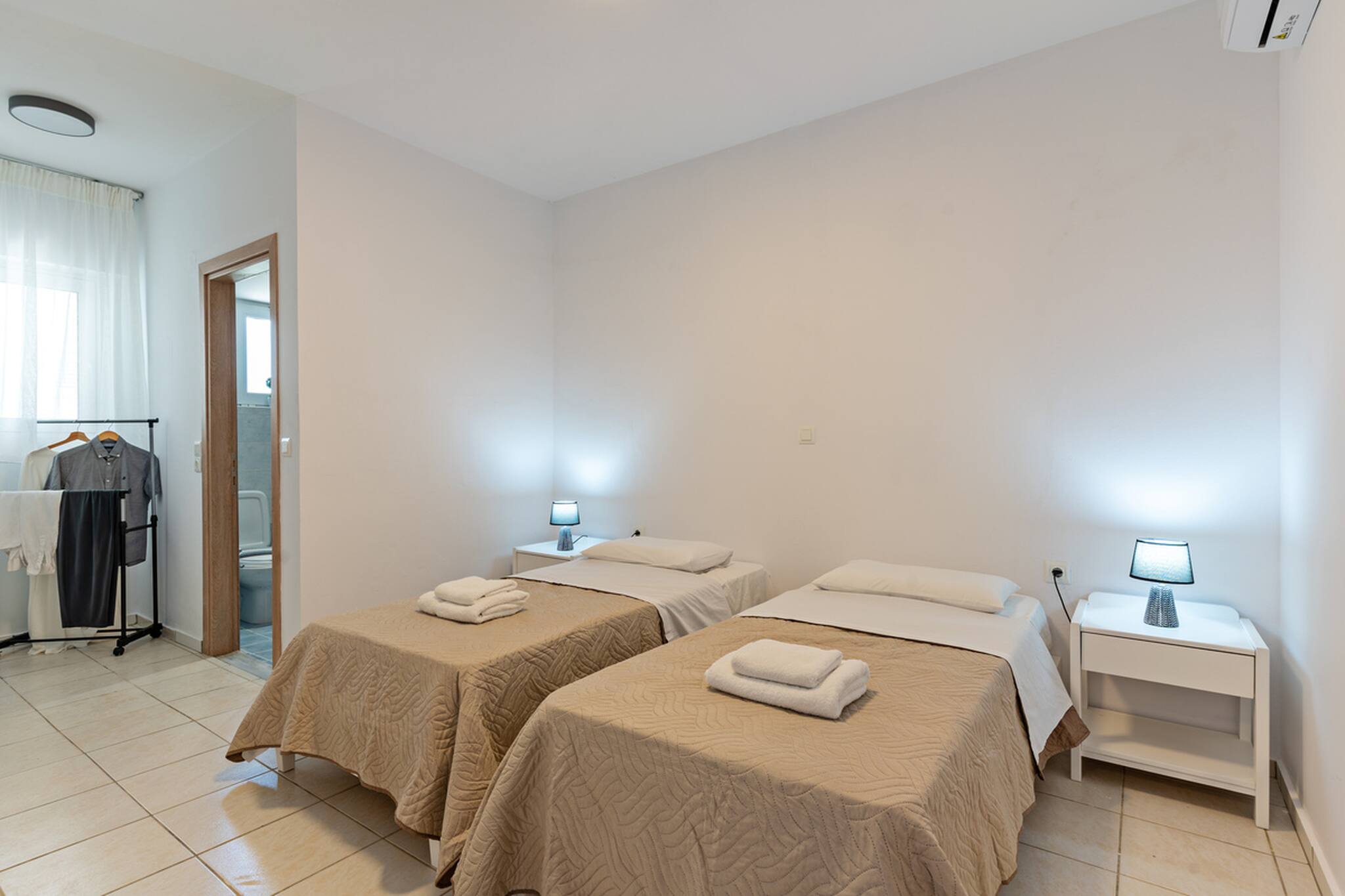 Azure Apt#10 accommodates up to 5 guests. It has two bedrooms, one with a double bed and the other with two single beds, plus a single sofa bed in the living room, making it suitable for families or small groups. The apartment includes two bathrooms with showers and a fully equipped kitchen with refrigerator with freezer, oven, microwave, hobs, kettle, French press, kitchenware, and a washing machine. For added comfort, it features air conditioning, Wi-Fi, TV, and mosquito nets.