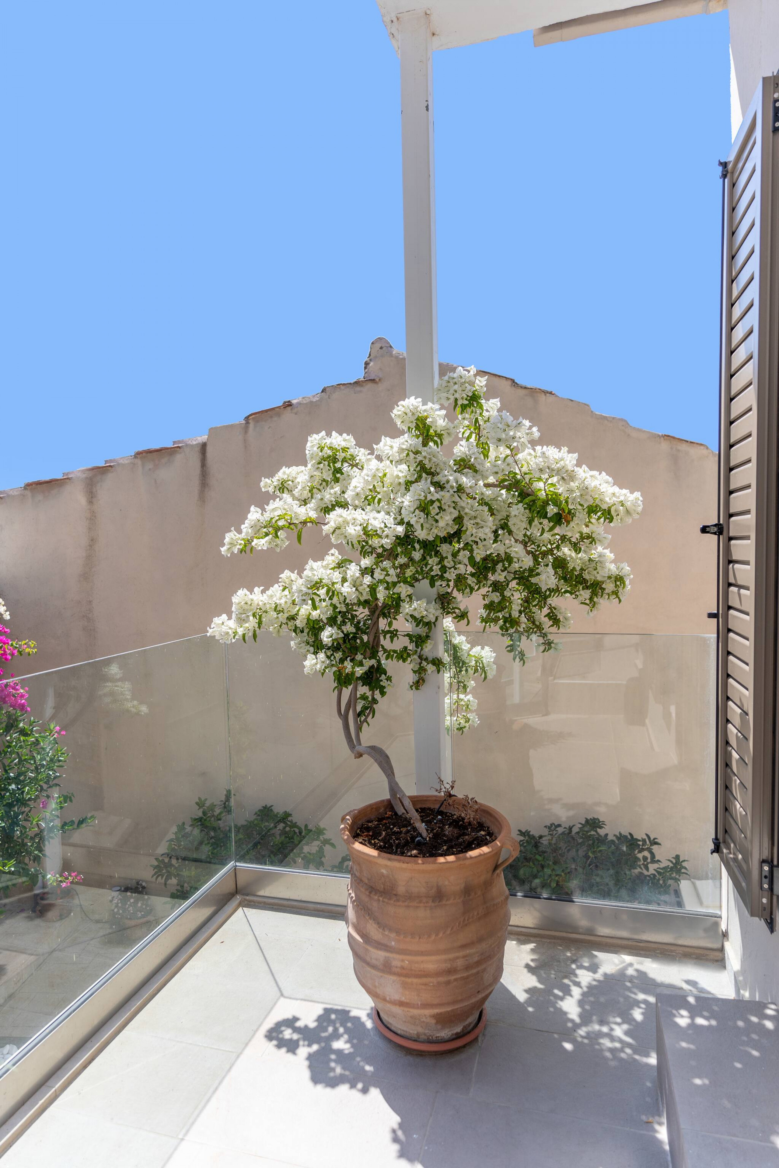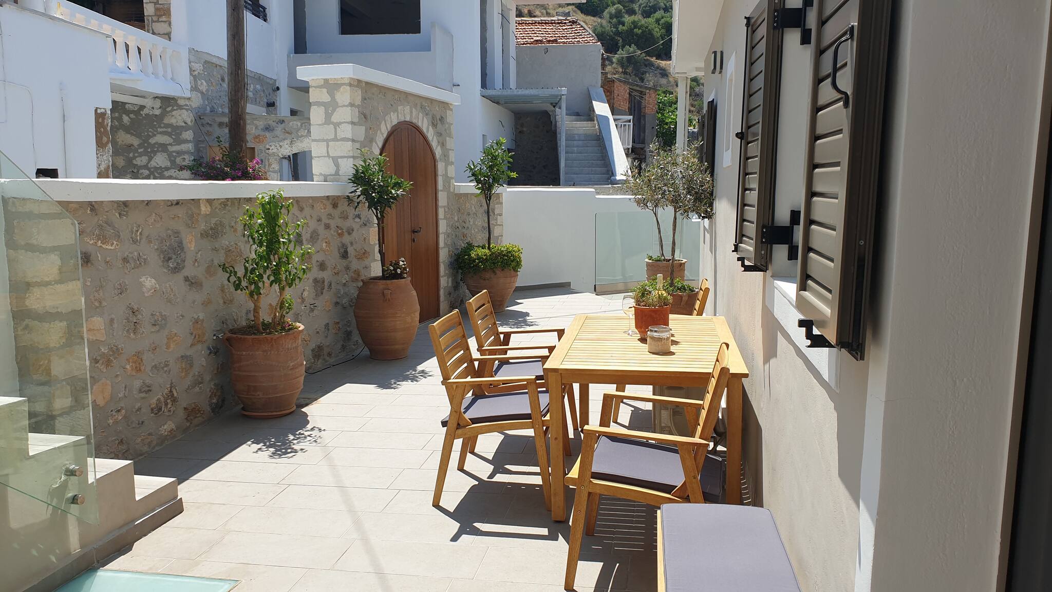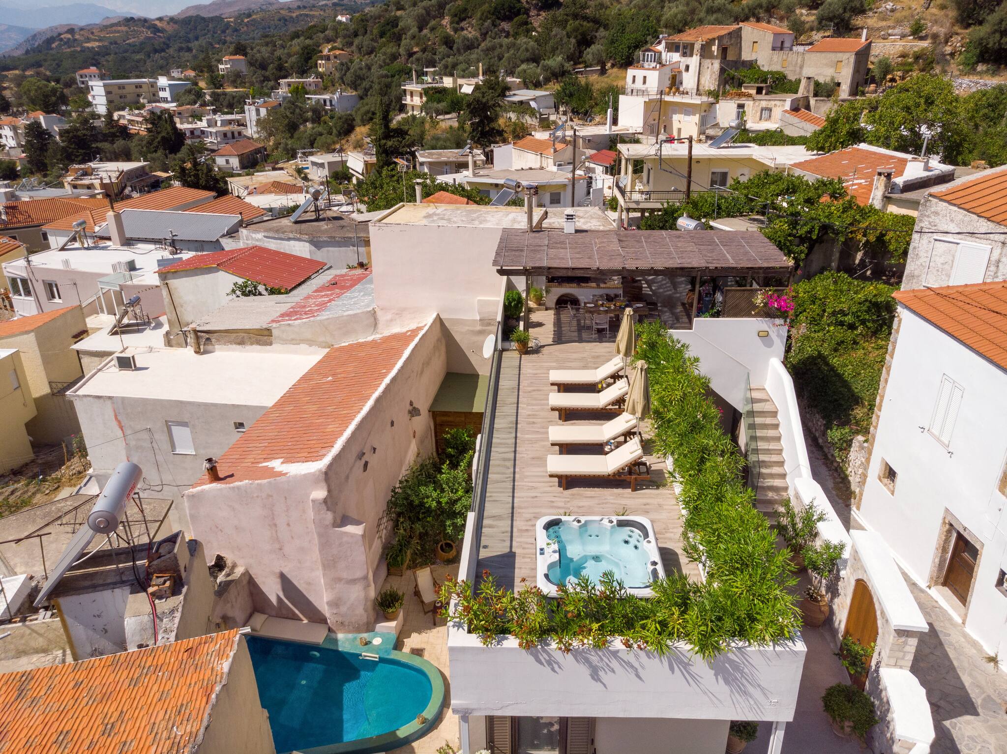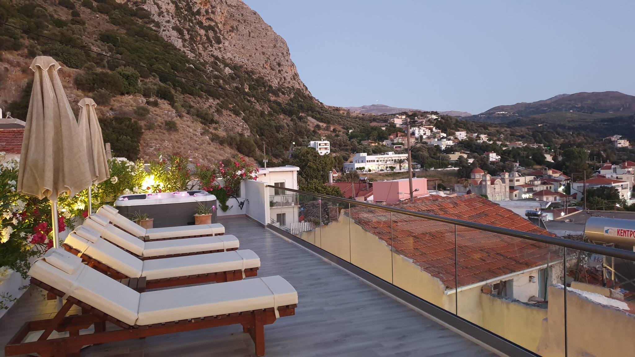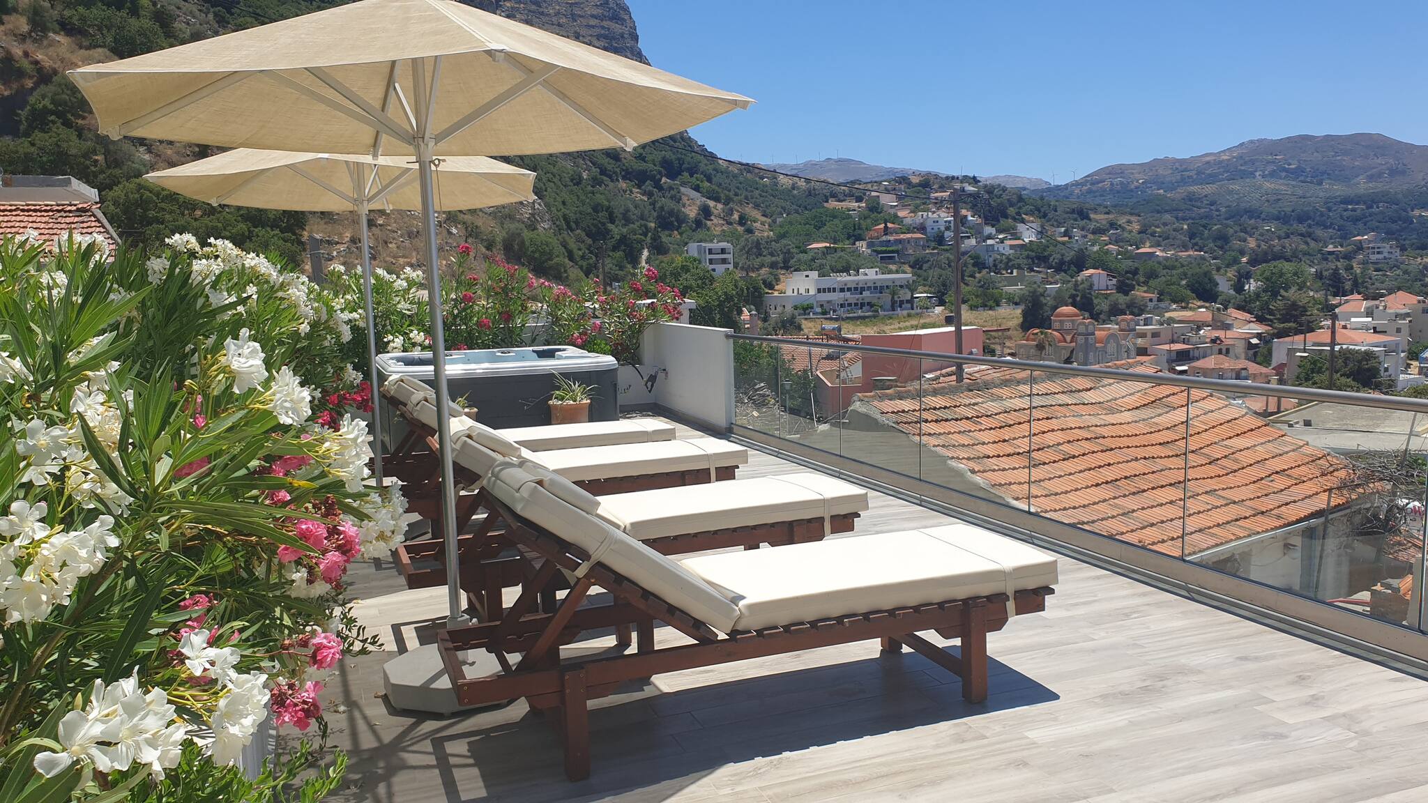 The rooftop terrace is the highlight, featuring a Jacuzzi, a barbecue, and a panoramic space to relax, sunbathe, or enjoy romantic dinners under the Cretan sky.