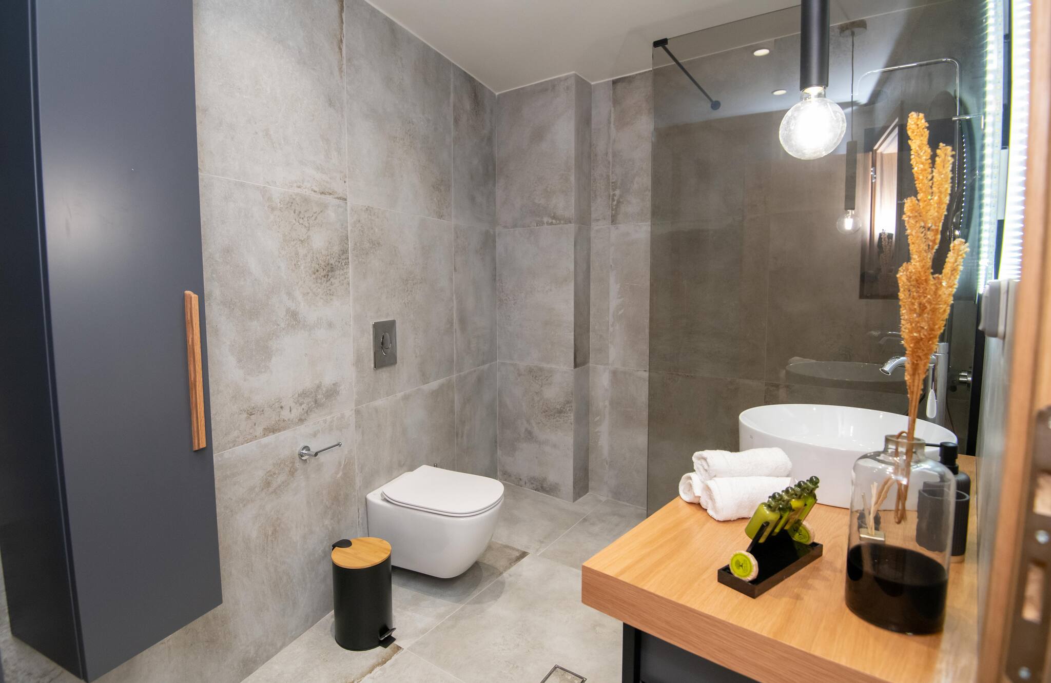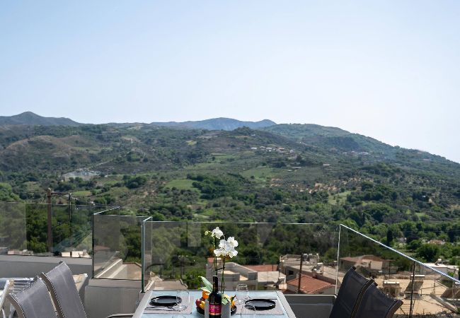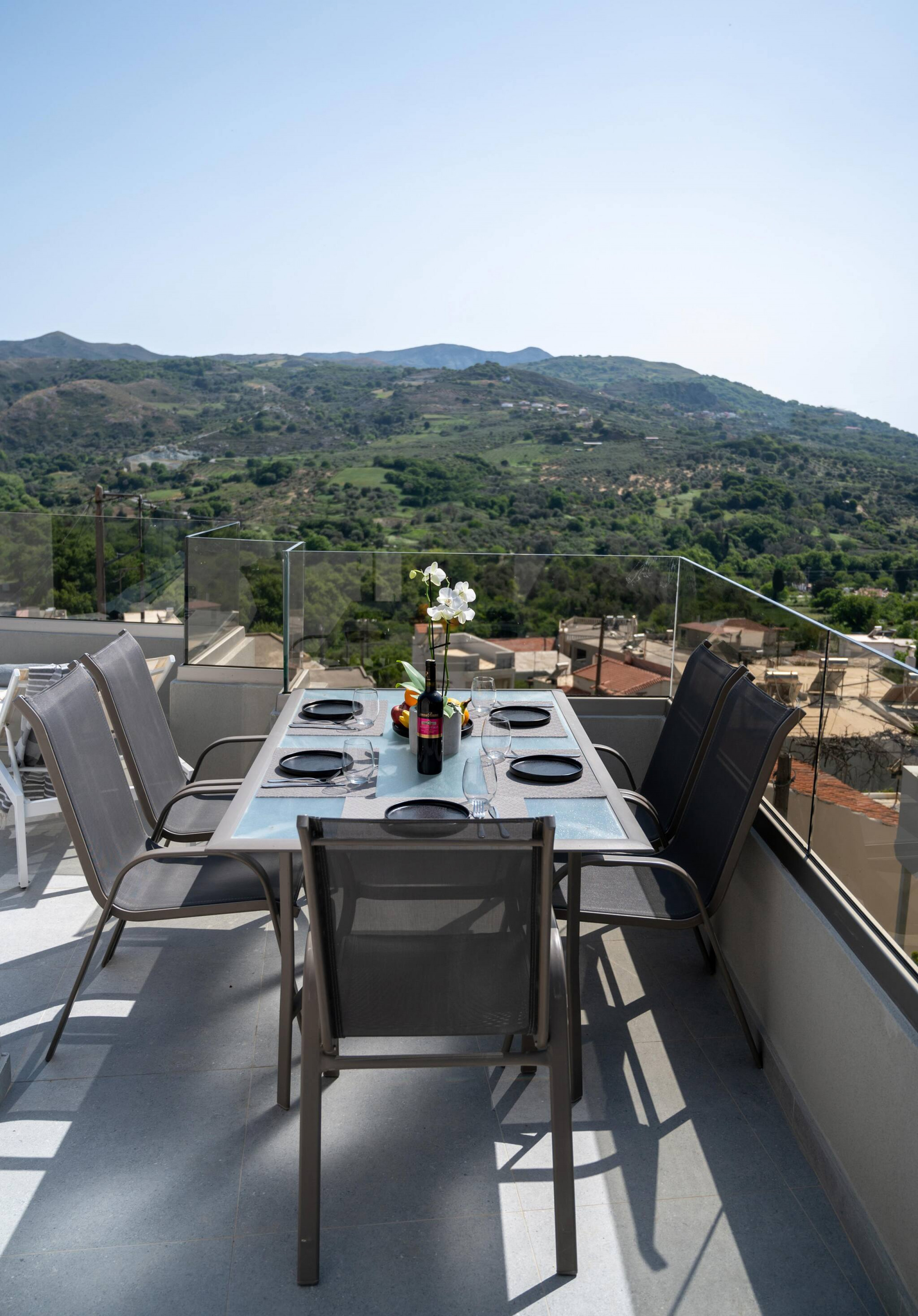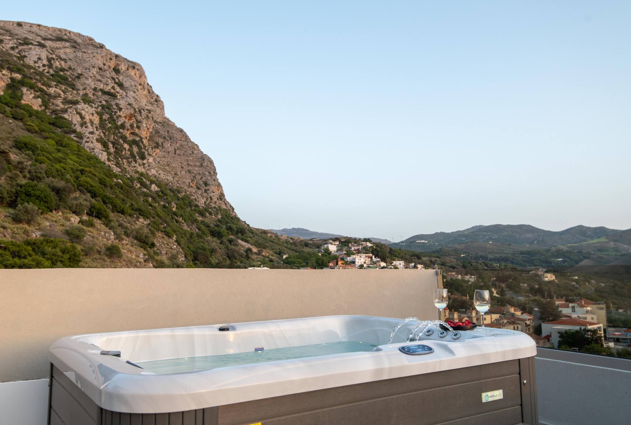 The rooftop terrace is the highlight, featuring a Jacuzzi, a barbecue, and a panoramic space to relax, sunbathe, or enjoy romantic dinners under the Cretan sky.