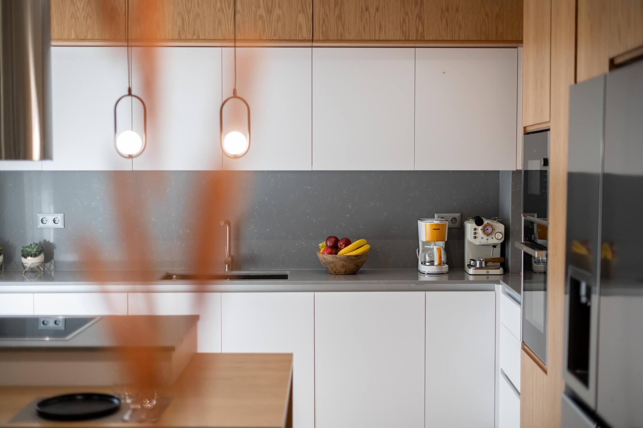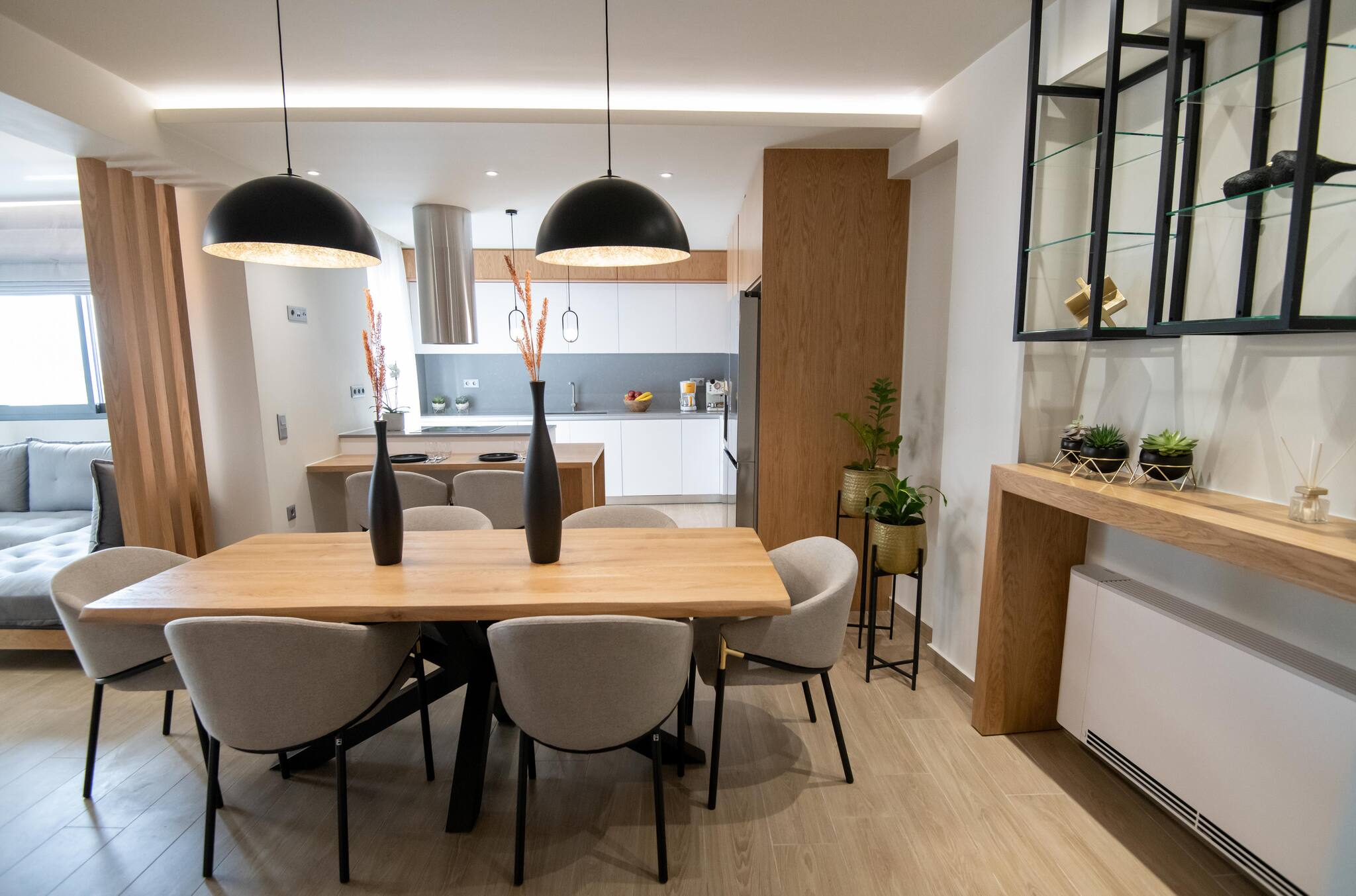 Lower level: Spacious living area with comfortable seating, and a fully equipped kitchen with a long dining table, ideal for family meals. There is also a bathroom for convenience.