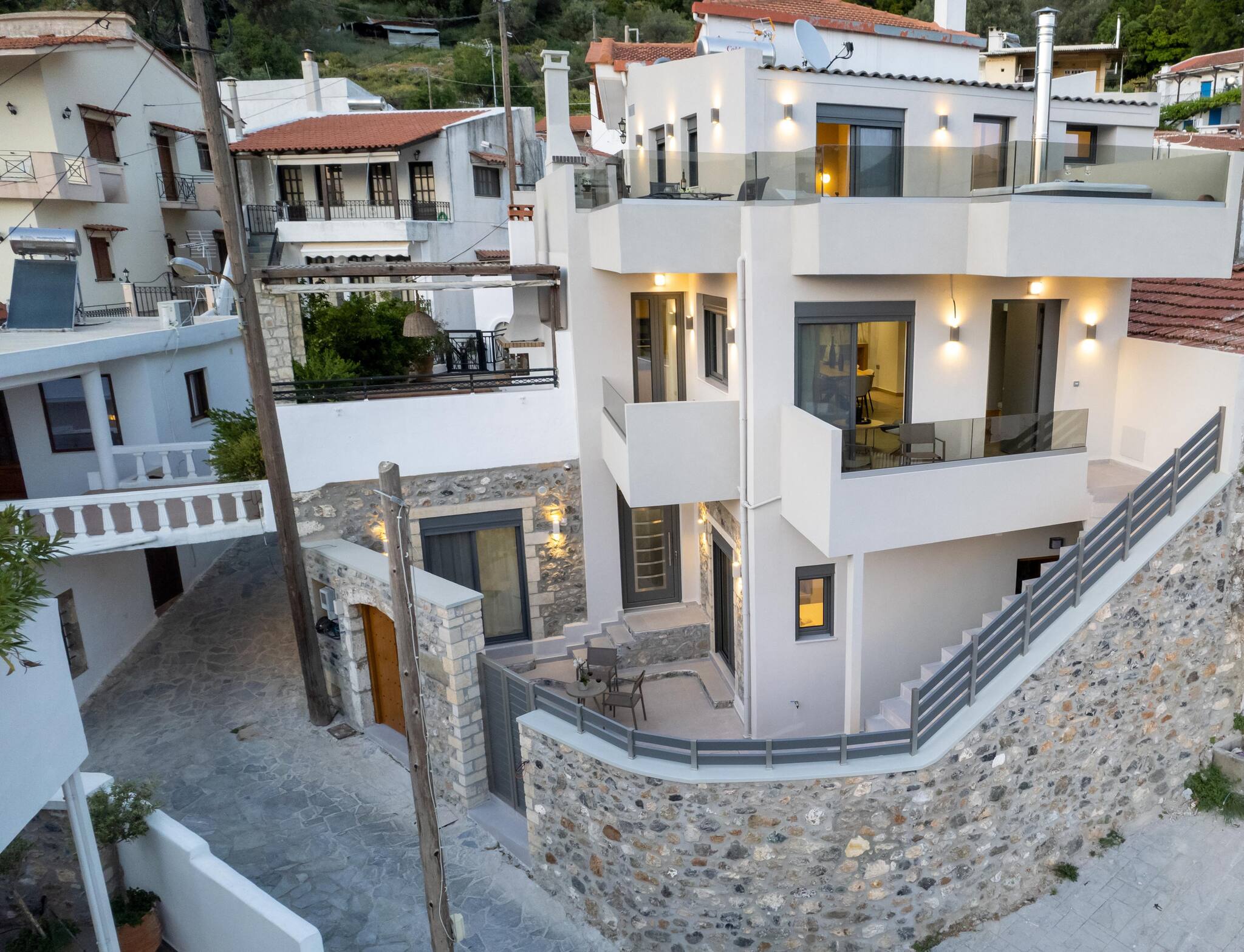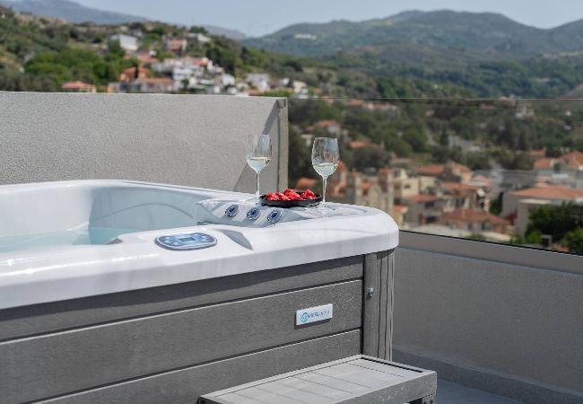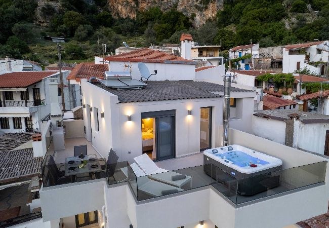 The highlight of Casa Sofia #2 is the rooftop terrace, featuring a Jacuzzi, barbecue area, and panoramic views over the village and surrounding mountains — perfect for romantic evenings or friendly gatherings.