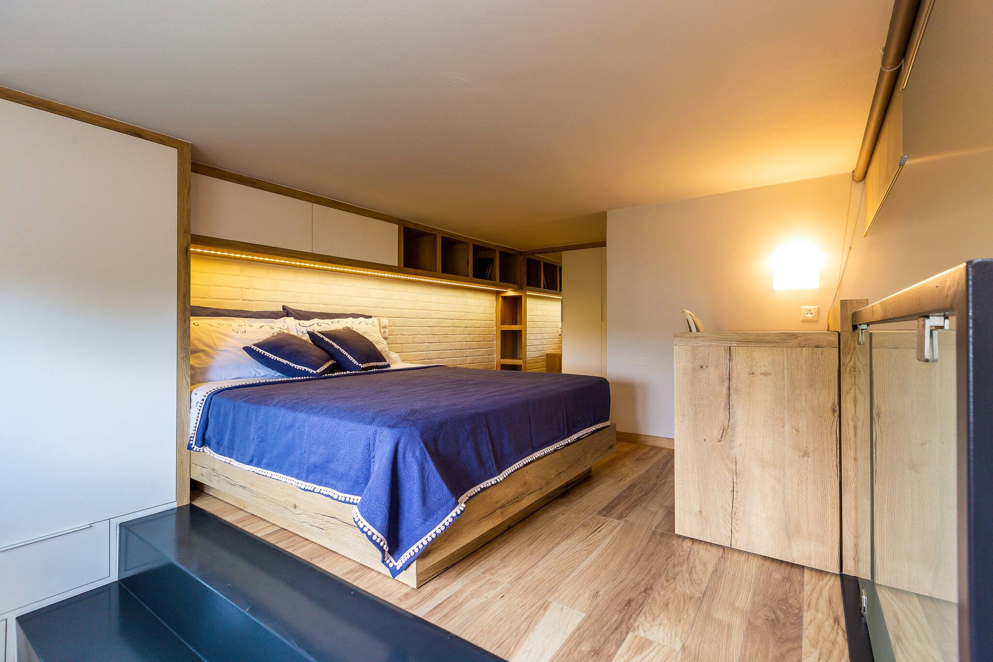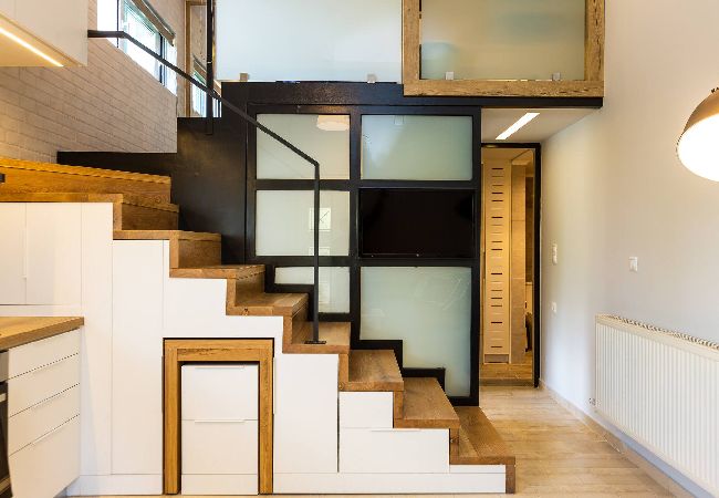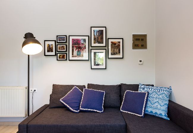 The property features two bedrooms with double beds, a living room with a sofa that converts into a single bed, a fully equipped kitchen, and one bathroom. Modern amenities include air conditioning, TV, WiFi, and a washing machine.