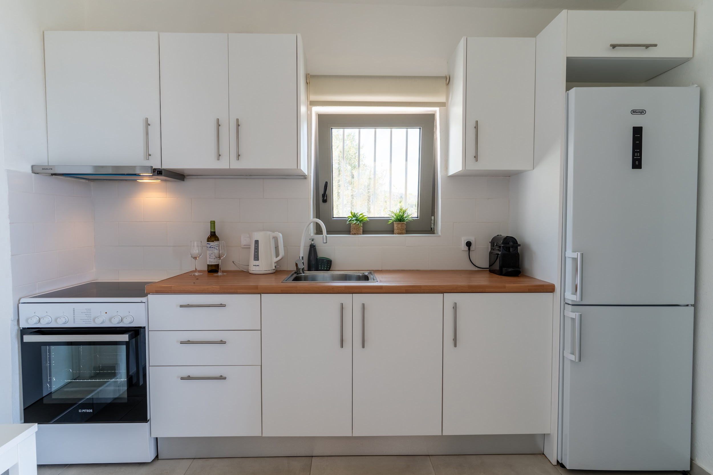 • Kitchen and Living Area: The kitchen comes fully equipped with everything you need to prepare delicious meals, including a stove, oven, fridge, kettle, and coffee machine. The adjoining living room features a TV for entertainment.