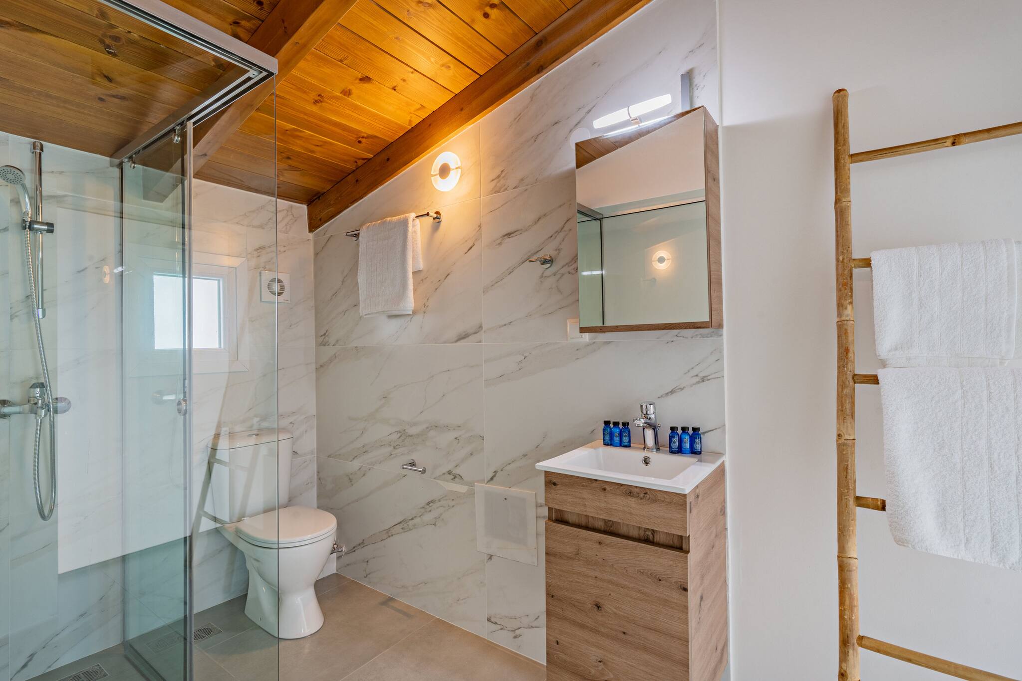 The suite accommodates up to 4 guests across two bedrooms. Upstairs, there is a double bedroom with its own bathroom, while downstairs you will find a second double bedroom and a full bathroom. The ground floor also includes an open-plan kitchen and living area that opens directly onto the pool terrace. The kitchen is fully equipped with refrigerator, freezer, oven, dishwasher, hob, kettle, coffee machine, toaster, dishes, cutlery, kitchen utensils, and a washing machine. Bed linens, face towels, bath towels, and pool towels are provided. Guests have exclusive access to the suite and its pool area.