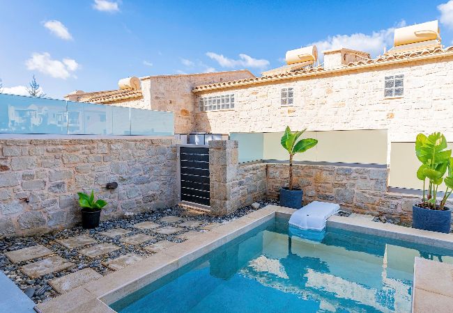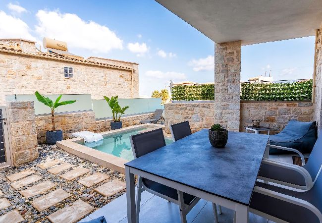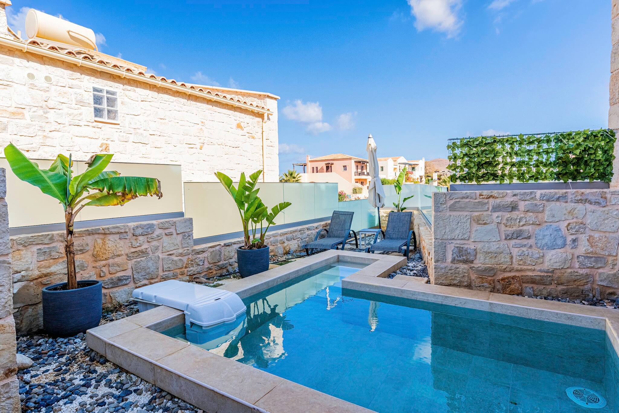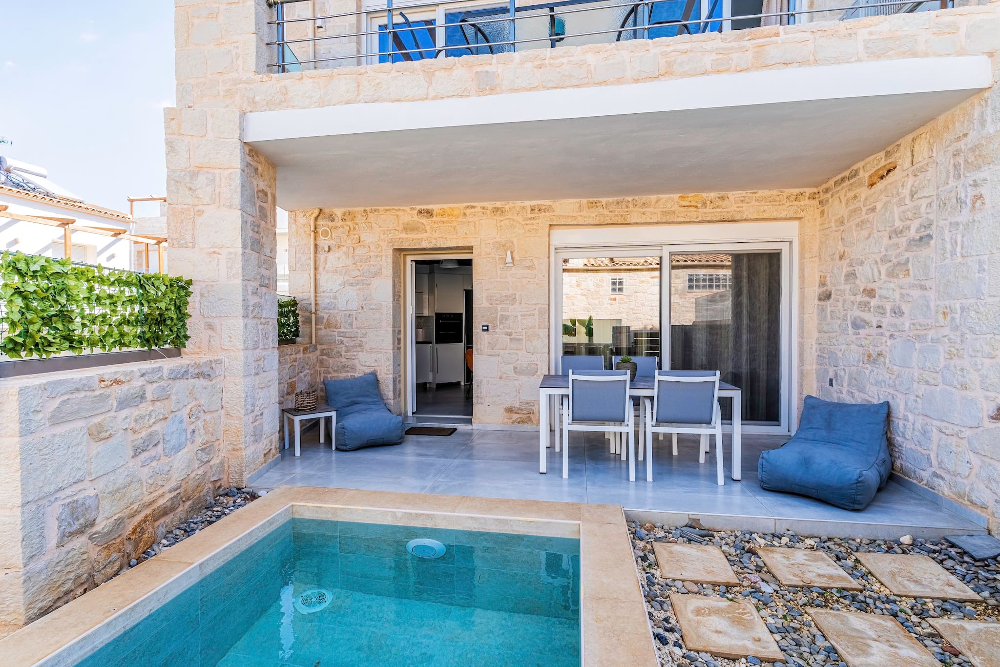 The suite accommodates up to 6 guests across two bedrooms with double beds and a double sofa bed in the attic, making it suitable for families or small groups. On the ground floor, an open-plan area includes the kitchen, dining, living space, and a bathroom. Sliding doors lead from the living area to the plunge pool, with outdoor seating and dining facilities. The kitchen is fully equipped with refrigerator, freezer, oven, dishwasher, hob, kettle, coffee machine, toaster, dishes, cutlery, and kitchen utensils, as well as a washing machine.