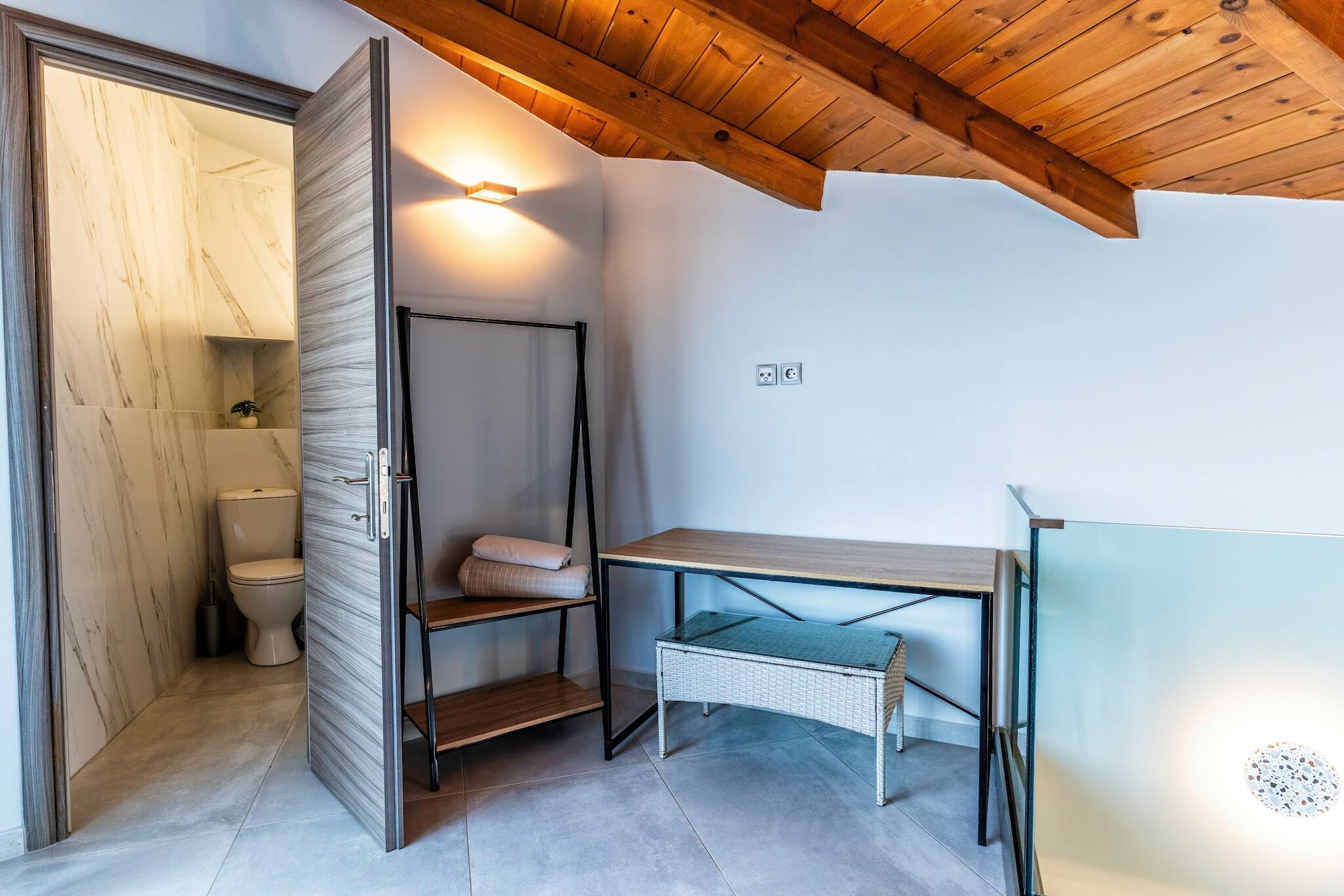 Upstairs, the two bedrooms share a bathroom, and the attic features a sofa bed and a WC, along with a small office area. Bed linens, face towels, bath towels, and pool towels are provided. Guests have exclusive access to the suite and its plunge pool.