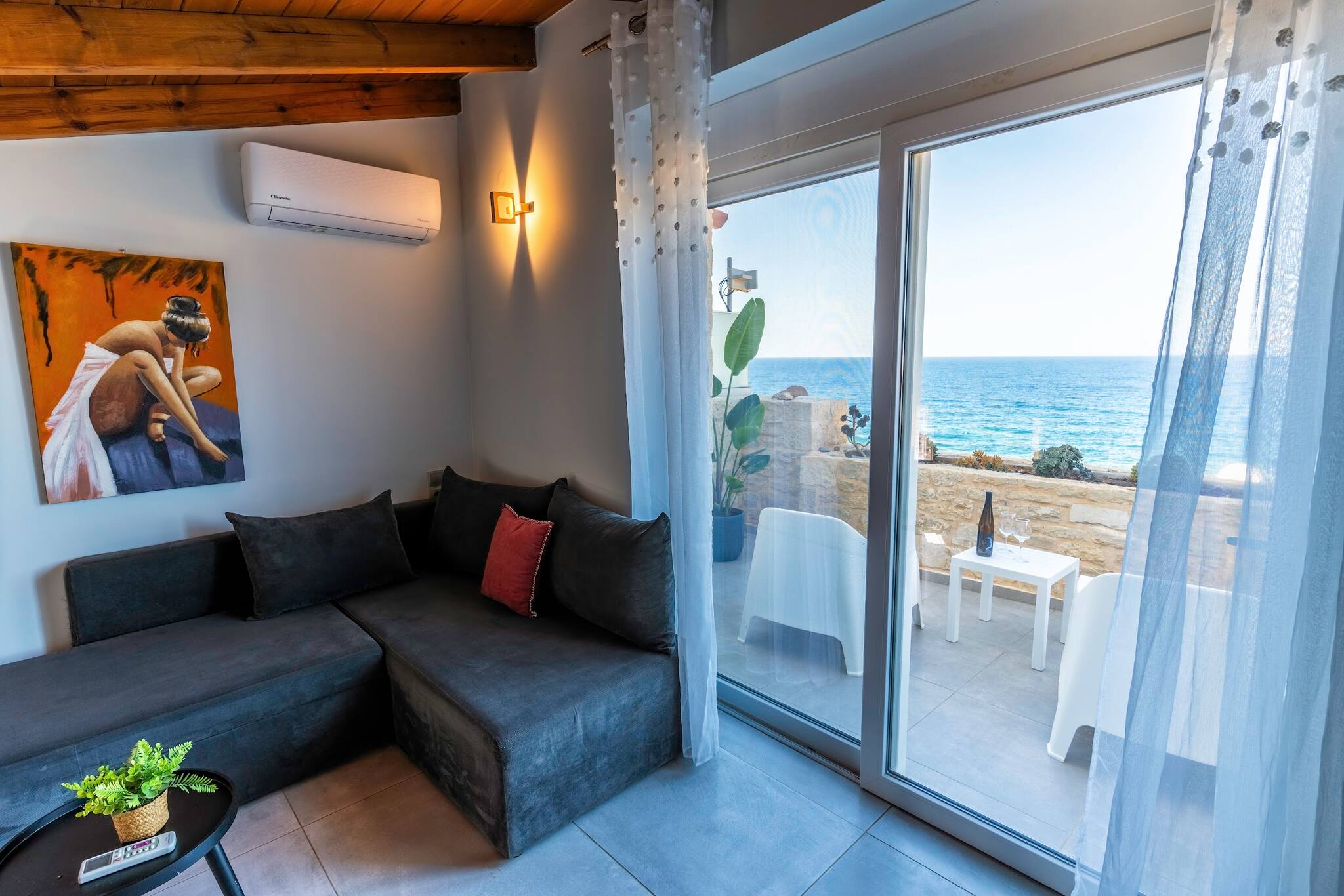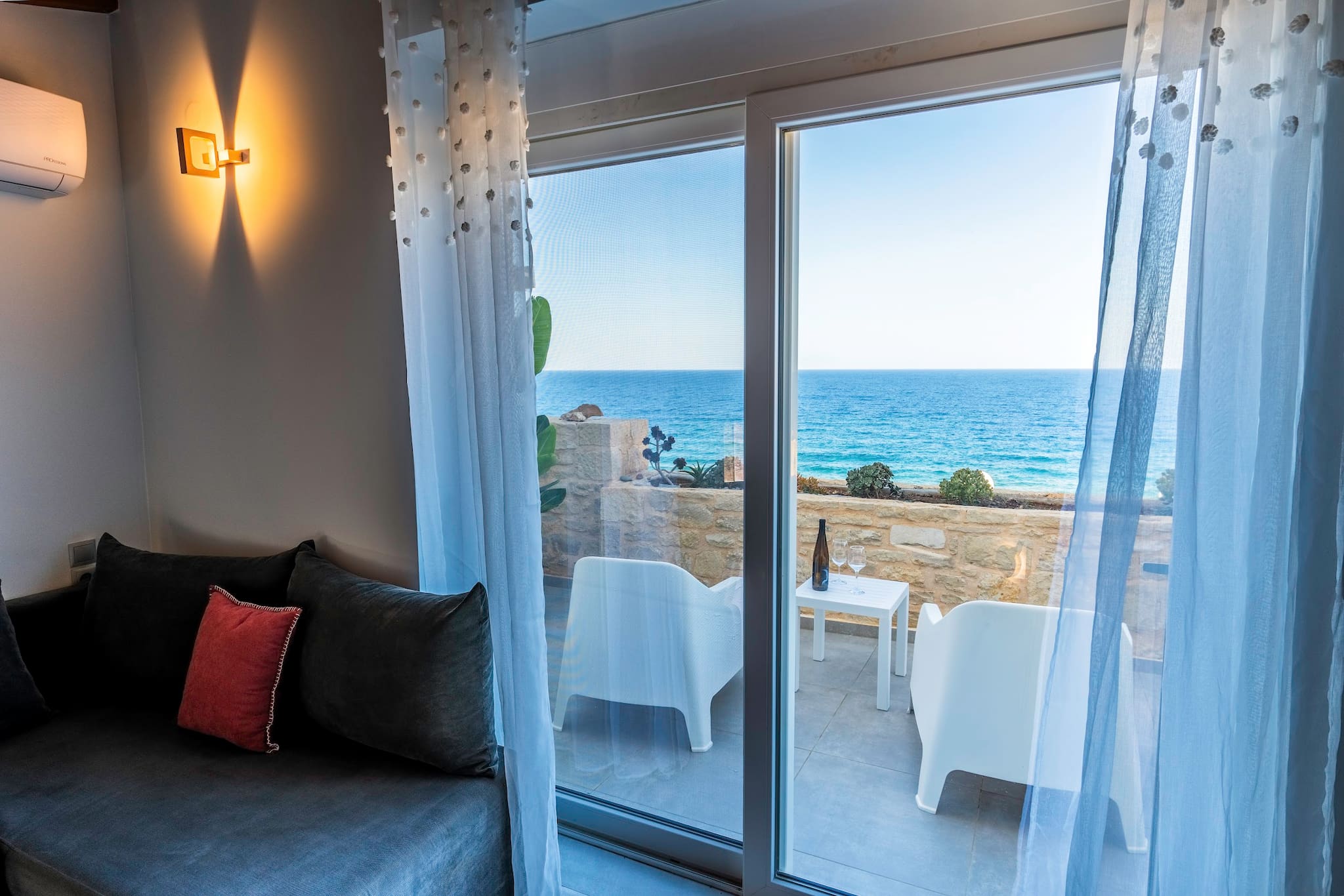 Zefyros Suite is part of a seaside complex, located just steps from a rocky seafront with clear blue waters. The suite offers a comfortable setting with lovely sea views from its balcony and private plunge pool.