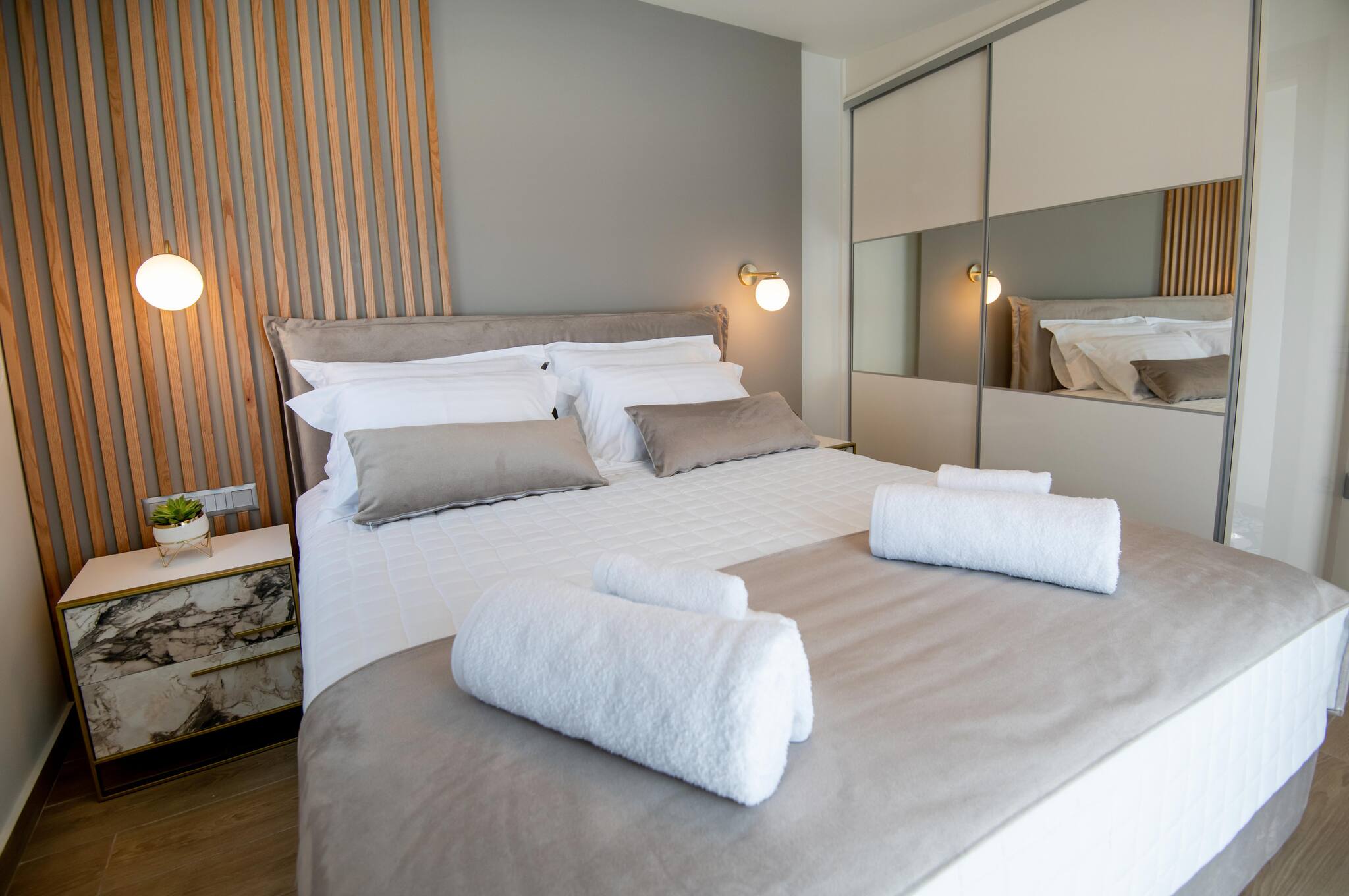 A cozy double bedroom, a fully functional kitchen, a comfortable living area with seating, and an elegant bathroom.