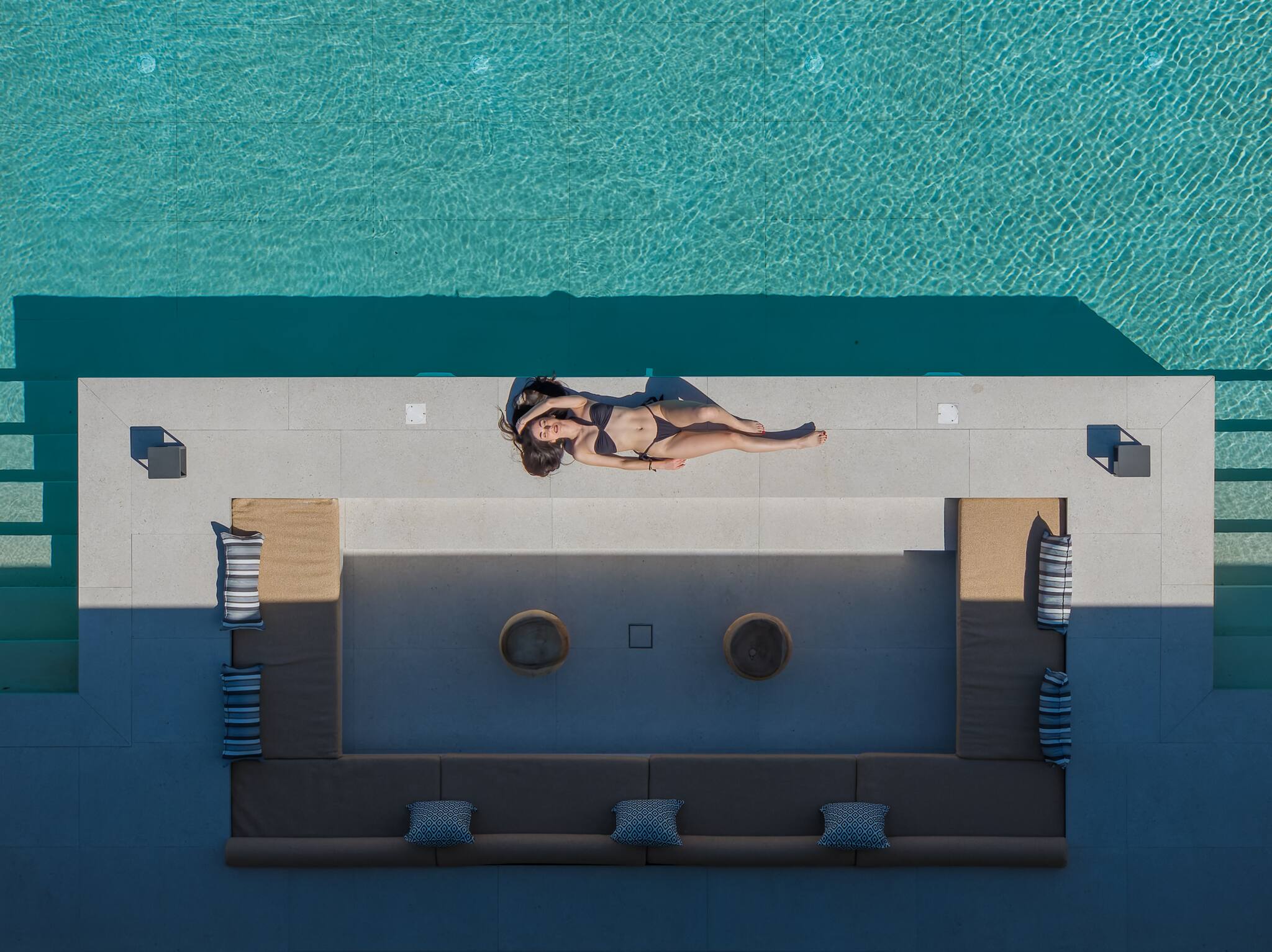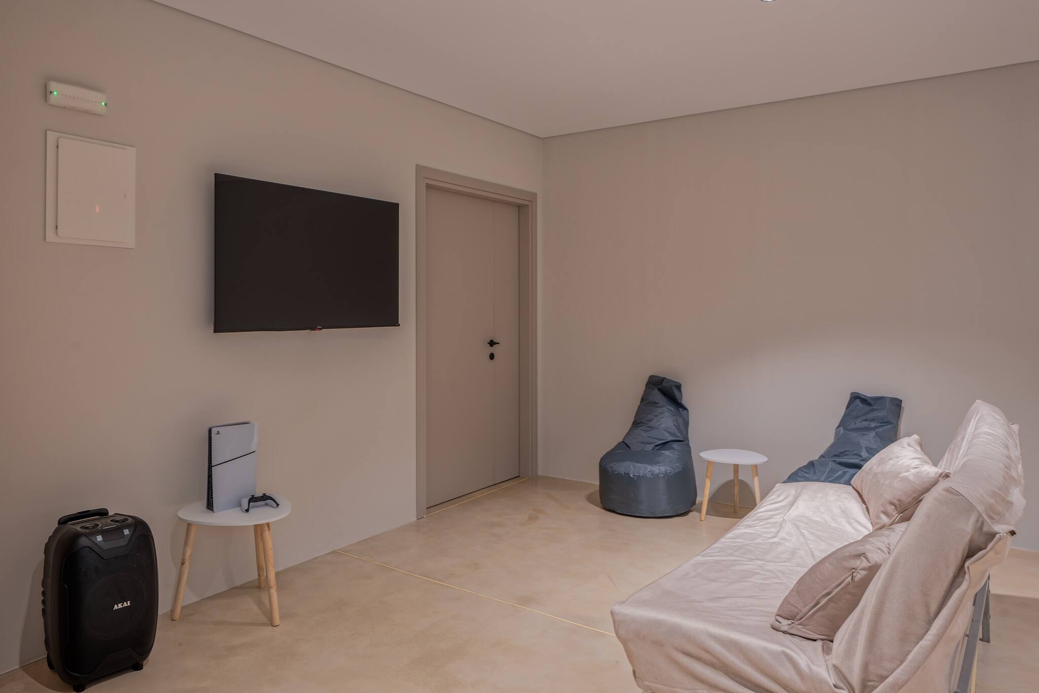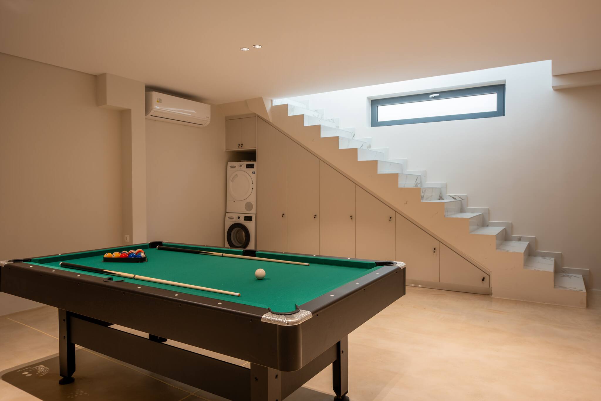 The bright living room connects seamlessly with the open-plan kitchen, which is fully equipped for preparing and enjoying meals together. All five bedrooms are on the ground floor, each with its own bathroom, air conditioning, TV, and high-quality linens. On the lower floor, there is a playroom with a billiard table, PlayStation, a full bathroom, and a double sofa bed for two additional guests. The villa comfortably accommodates twelve guests.