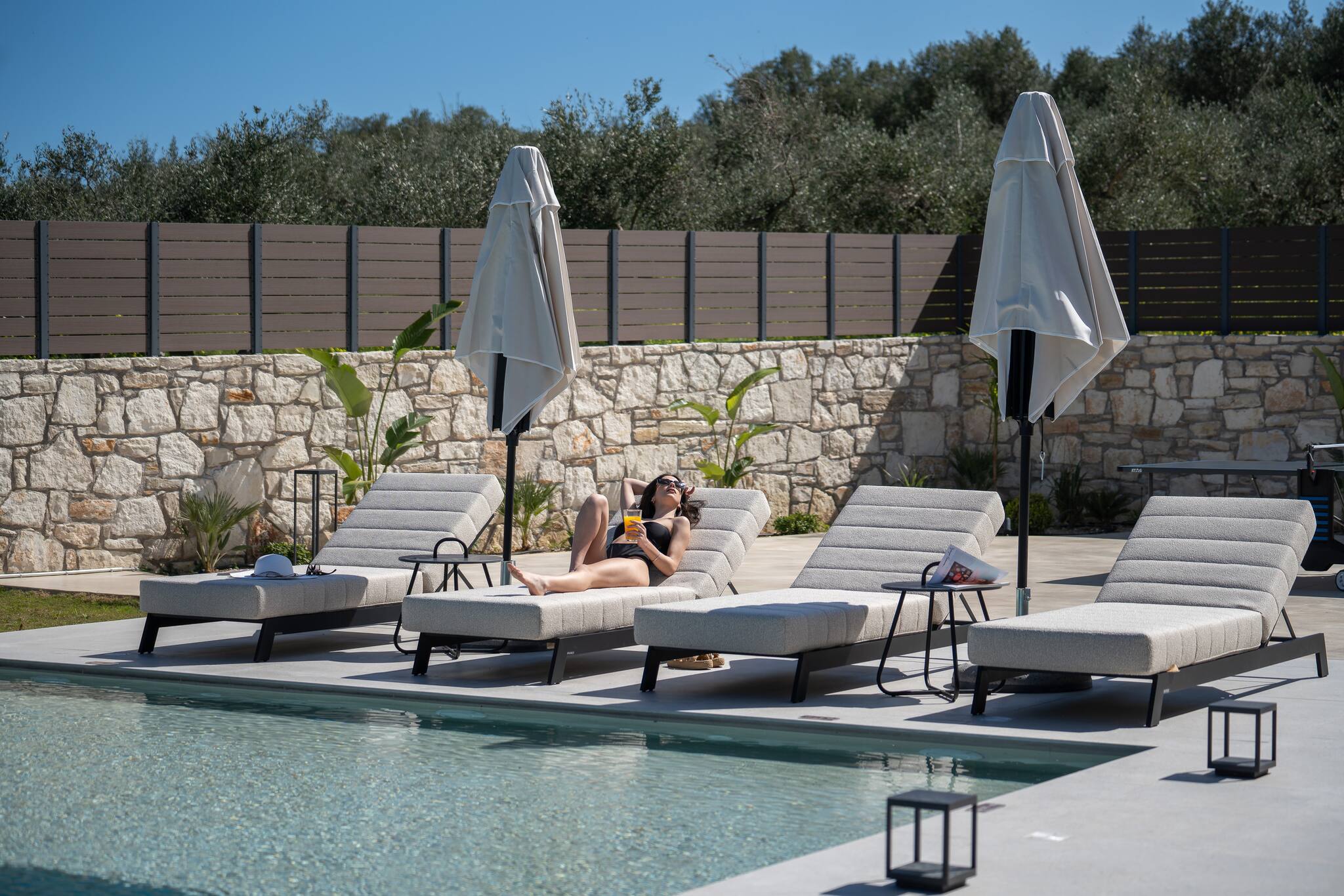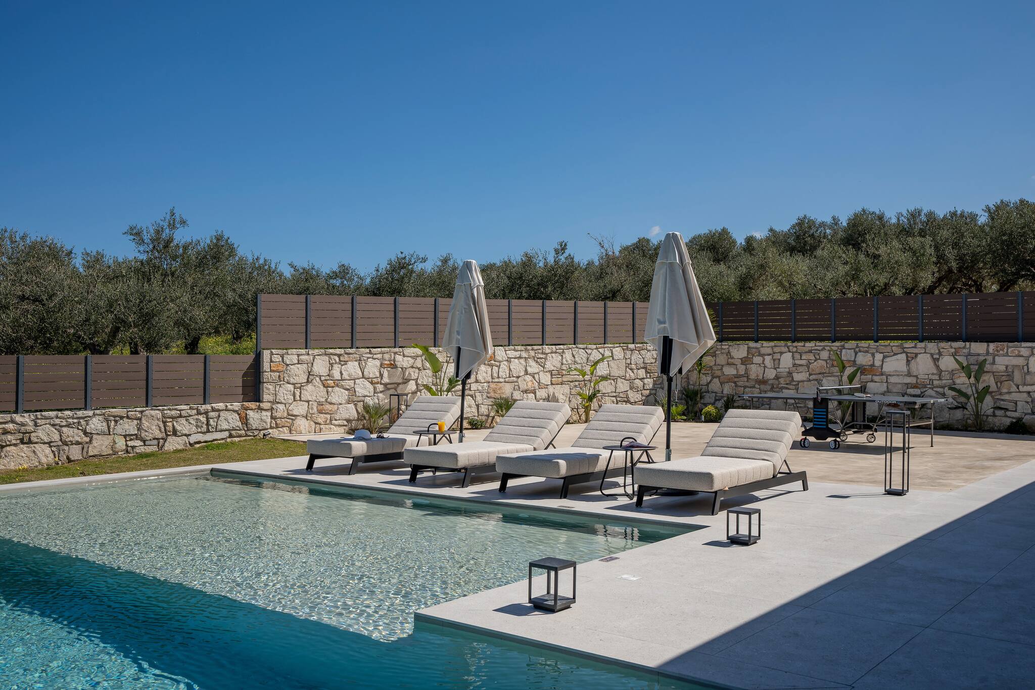 Stepping outside, you’ll find generous terraces with a 17-meter-long swimming pool (6.5 × 17.3 m, 1.50 m deep and children’s pool 20sqm, 0.40 m deep), an outdoor shower, sun loungers, a comfortable lounge area, and a large dining space with an outdoor kitchen and gas barbecue — ideal for enjoying meals under the open sky. The peaceful surroundings and privacy create a sense of total relaxation.