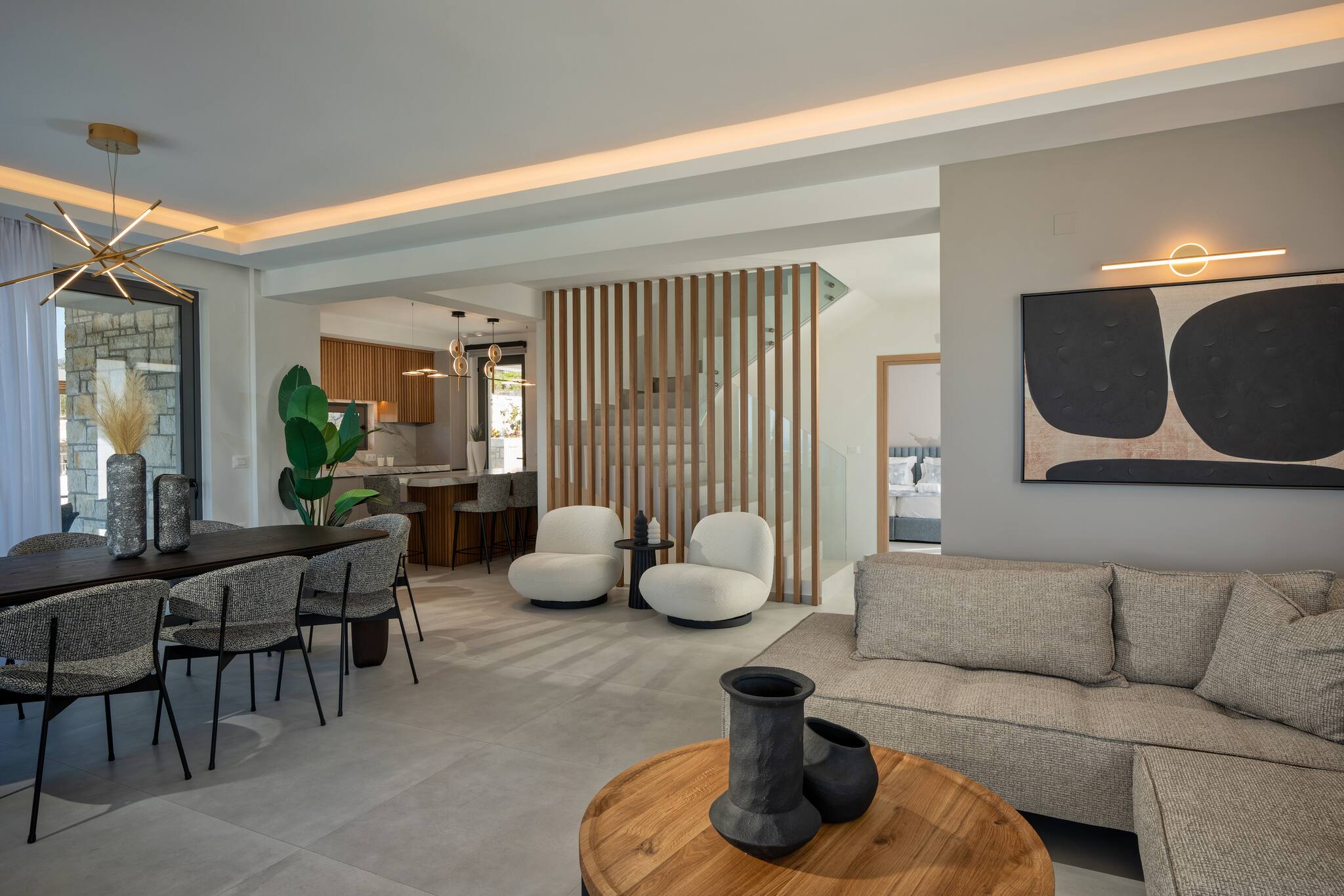 The villa spans three floors. Upon entering, you are welcomed into a spacious living area with a fully equipped kitchen. One bedroom is on the main floor, two bedrooms on the lower floor, and the fourth bedroom occupies the upper floor. Each bedroom comes with its own en-suite bathroom, air conditioning, TV, and high-quality linens.
