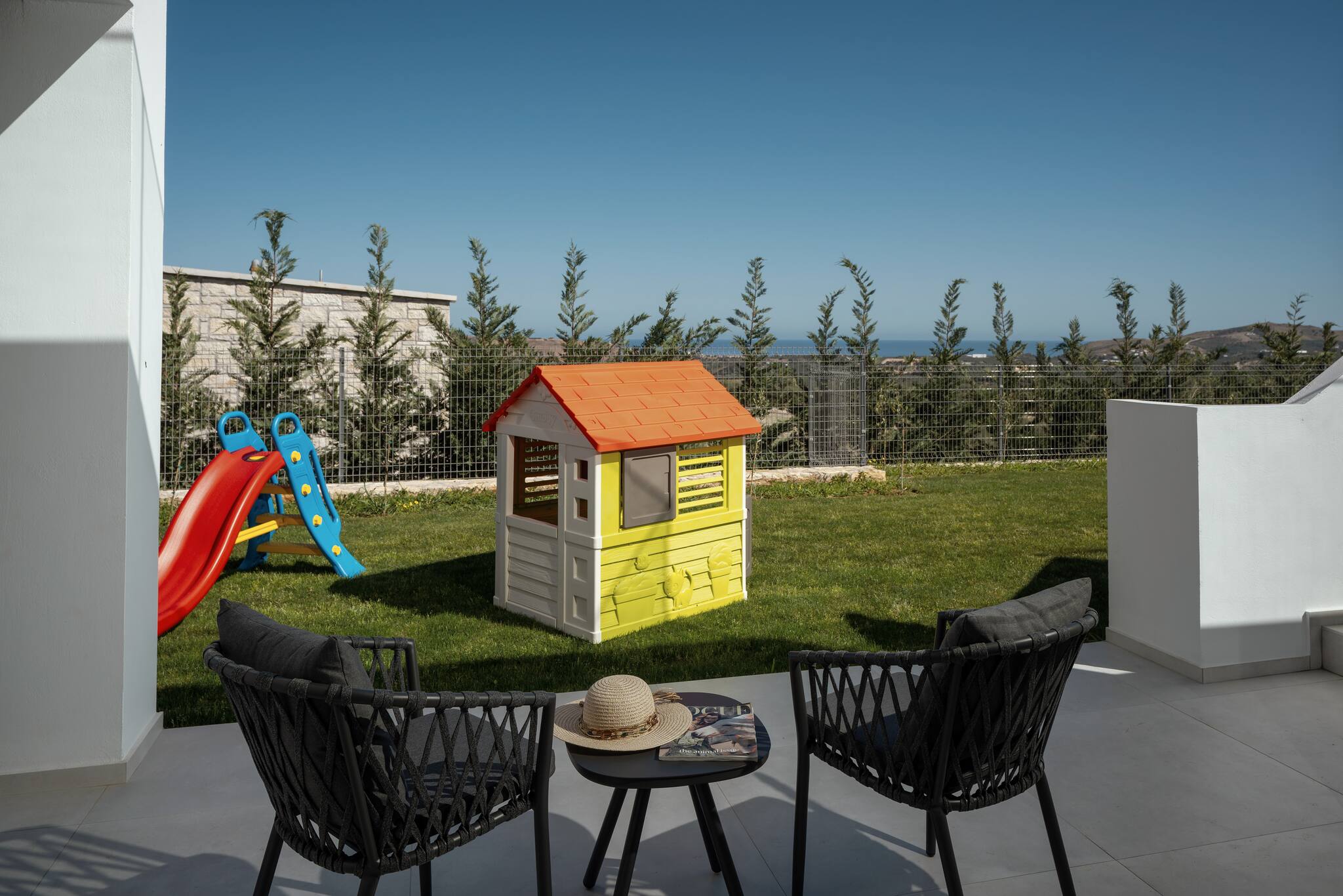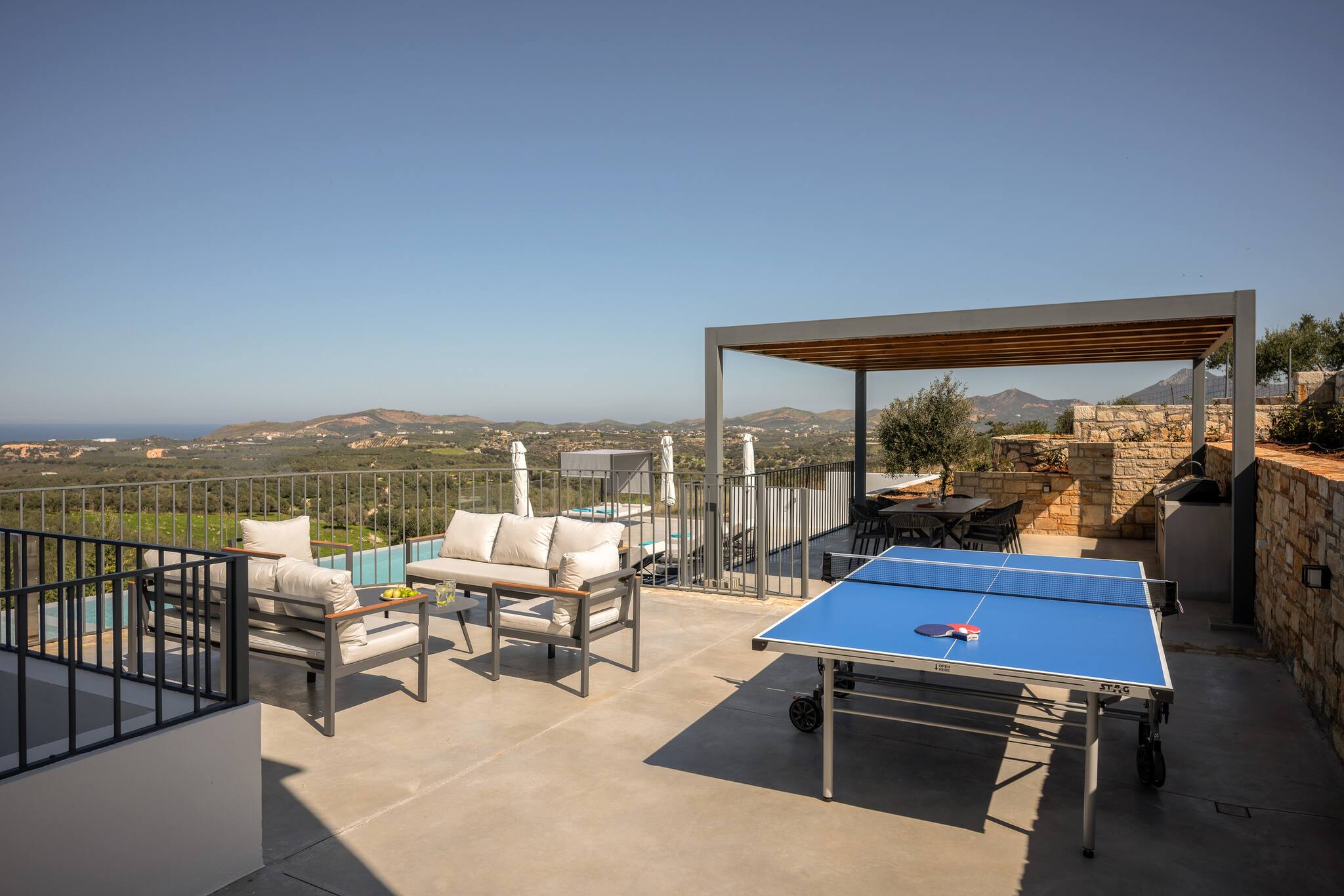 The villa’s highlight is its expansive outdoor space, featuring a large infinity pool (5 × 10 m, 1.4 m deep), sun loungers, an outdoor shower, a lounge area, a dining space with a gas barbecue, and table tennis for entertainment. The outdoor area is ideal for relaxation, socializing, and enjoying the sunny Cretan climate.