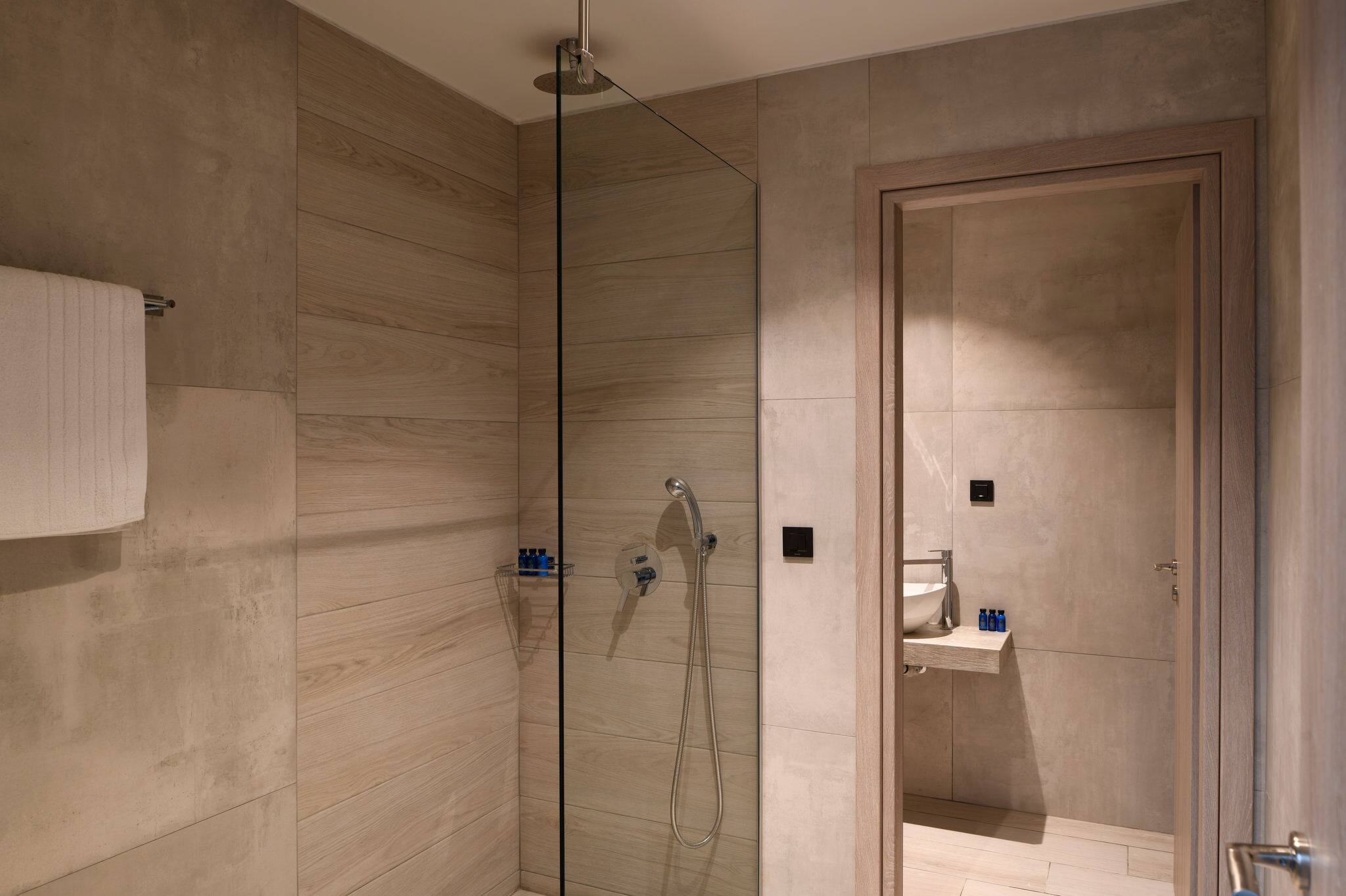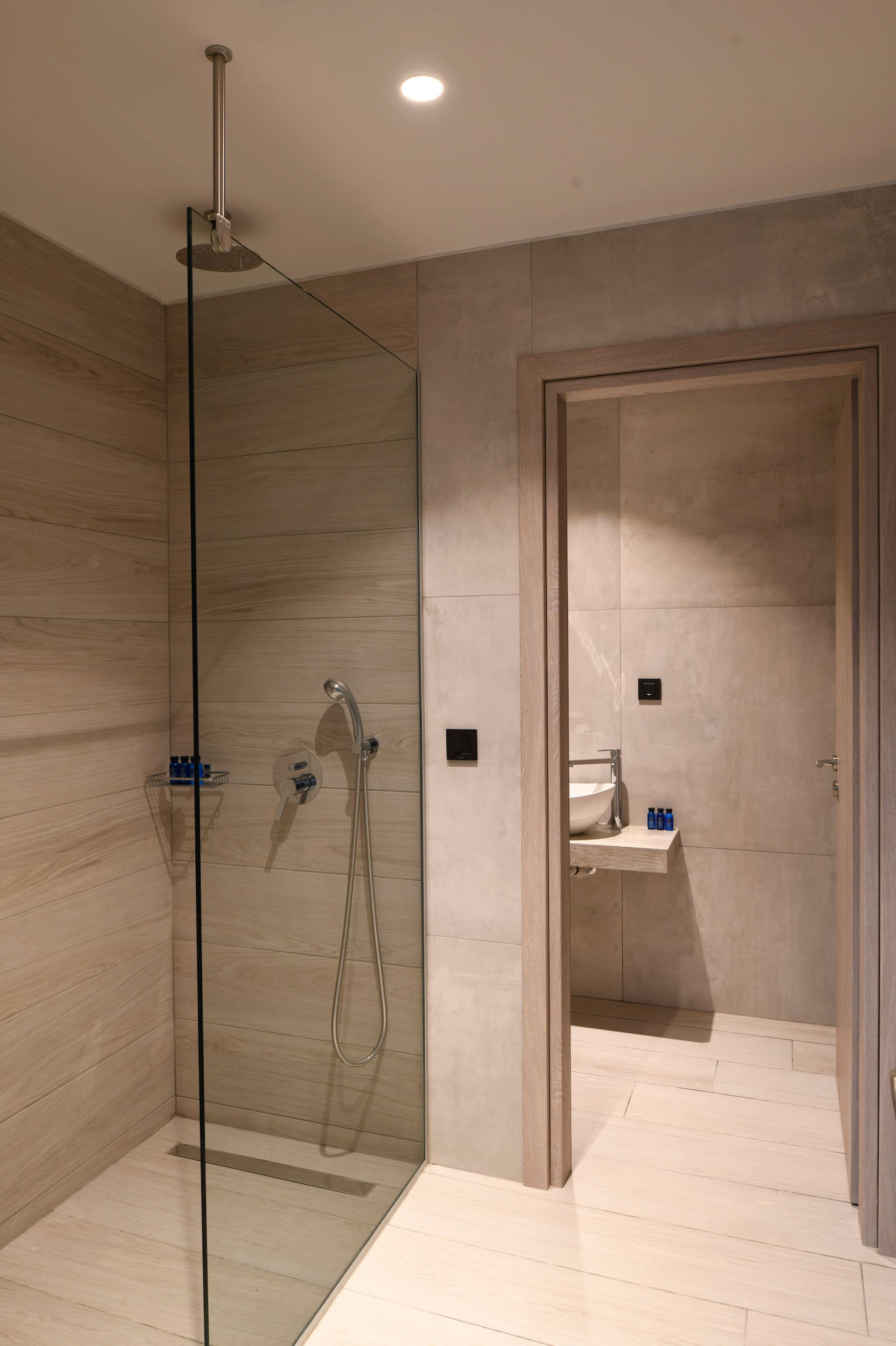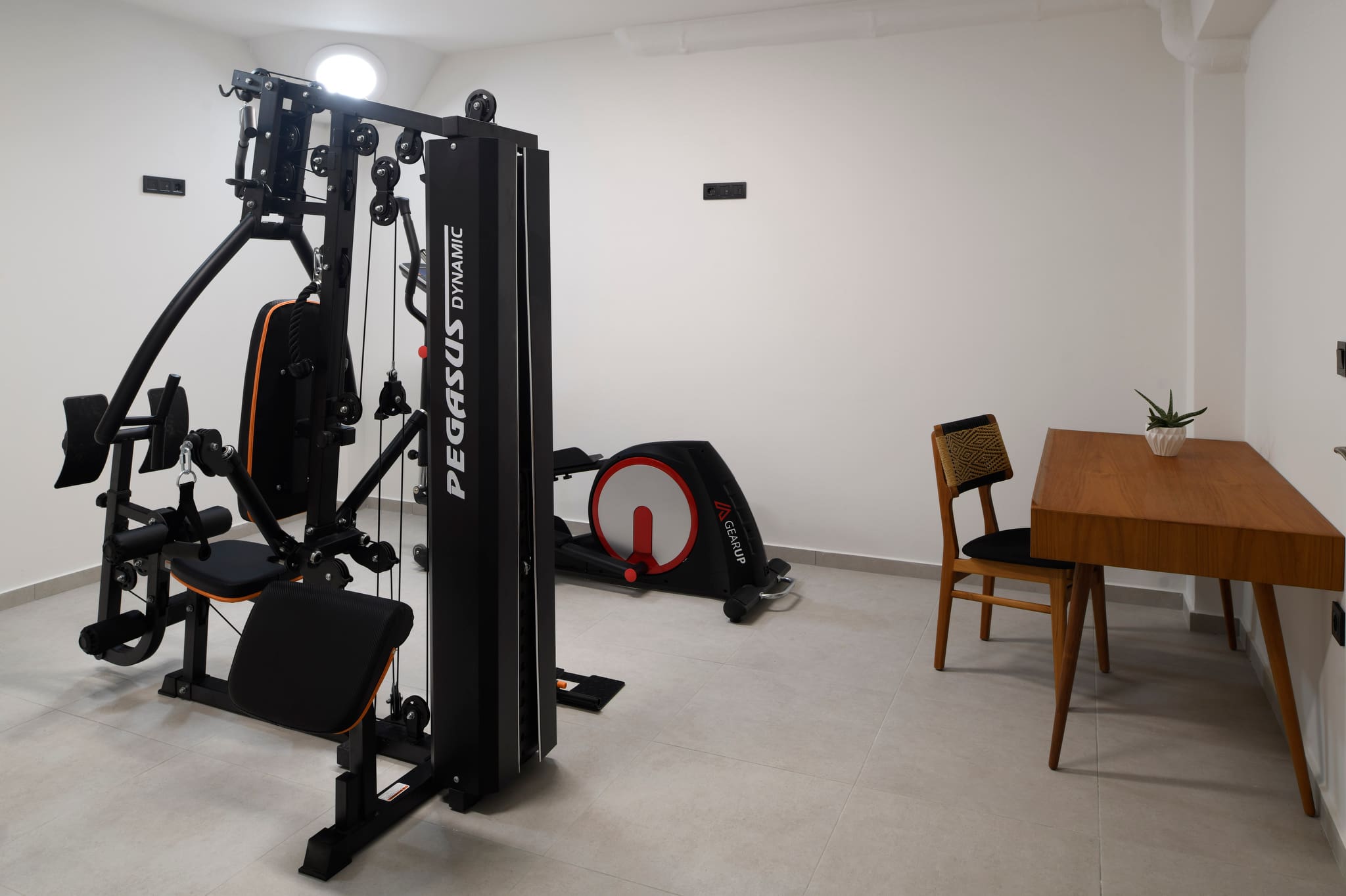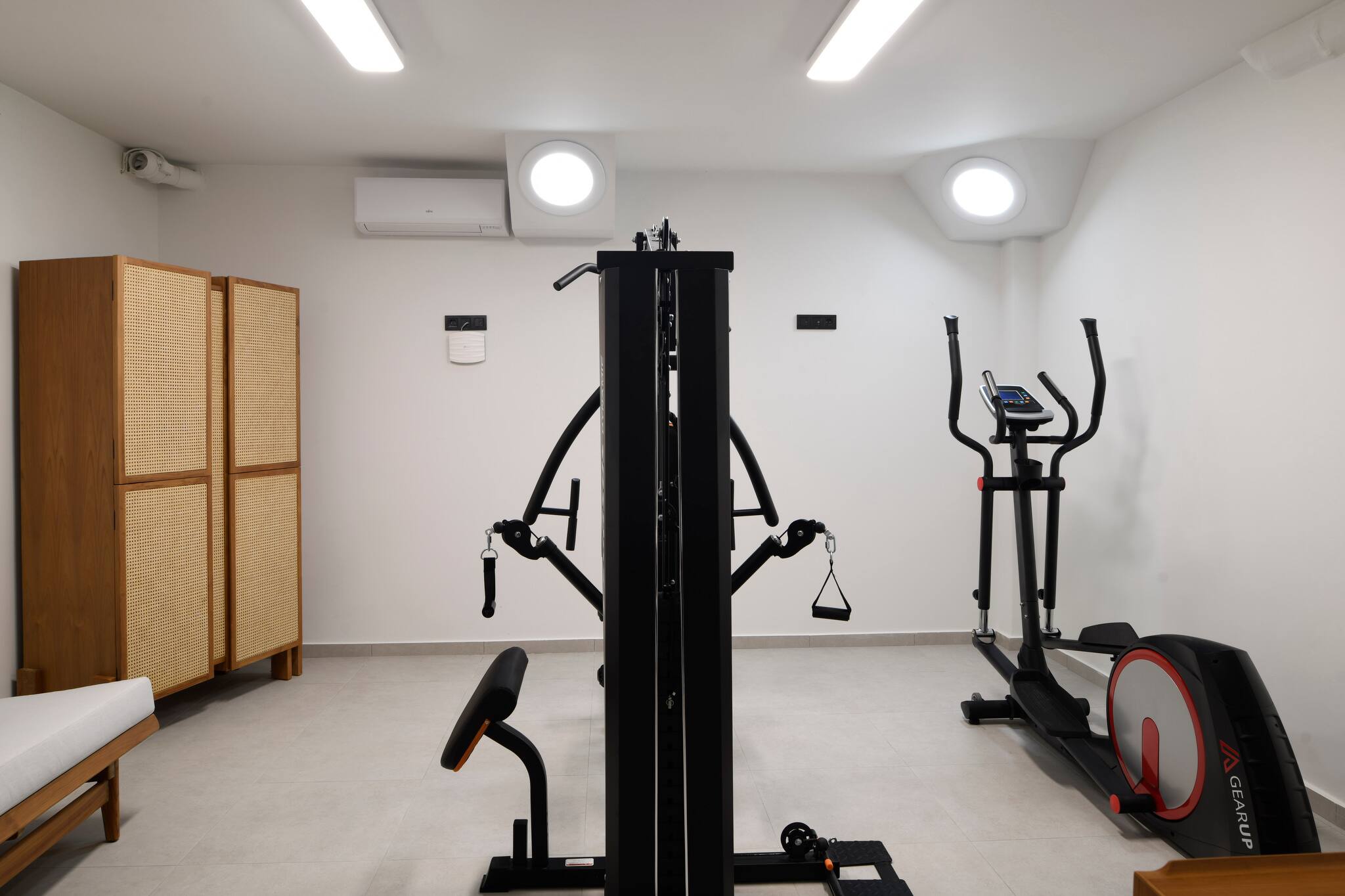 The ground floor houses a well-equipped gym and a sauna — perfect for relaxing after a day by the beach — along with a stylish bathroom. Upstairs, on the second floor, there are two more beautifully appointed double bedrooms, featuring en-suite bathrooms.