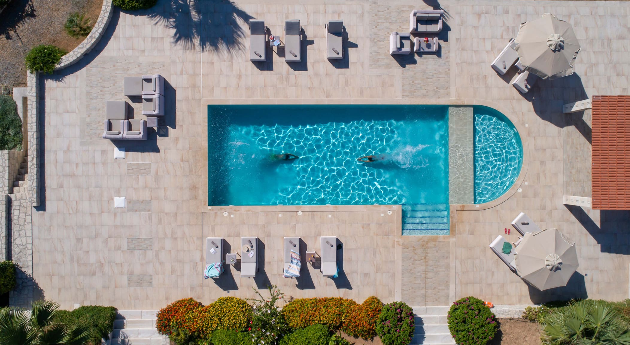 Outdoors, the villa features a private pool area with sunbeds for relaxing, a shaded dining space, and a large stone barbecue, perfect for cooking traditional Greek meals or enjoying a fun evening with friends. The colorful garden around the pool and at the entrance adds a vibrant and welcoming atmosphere.