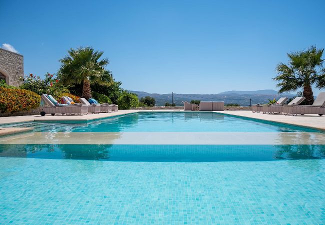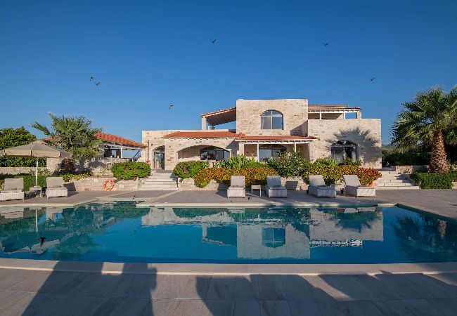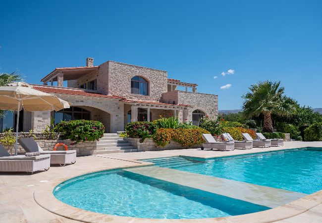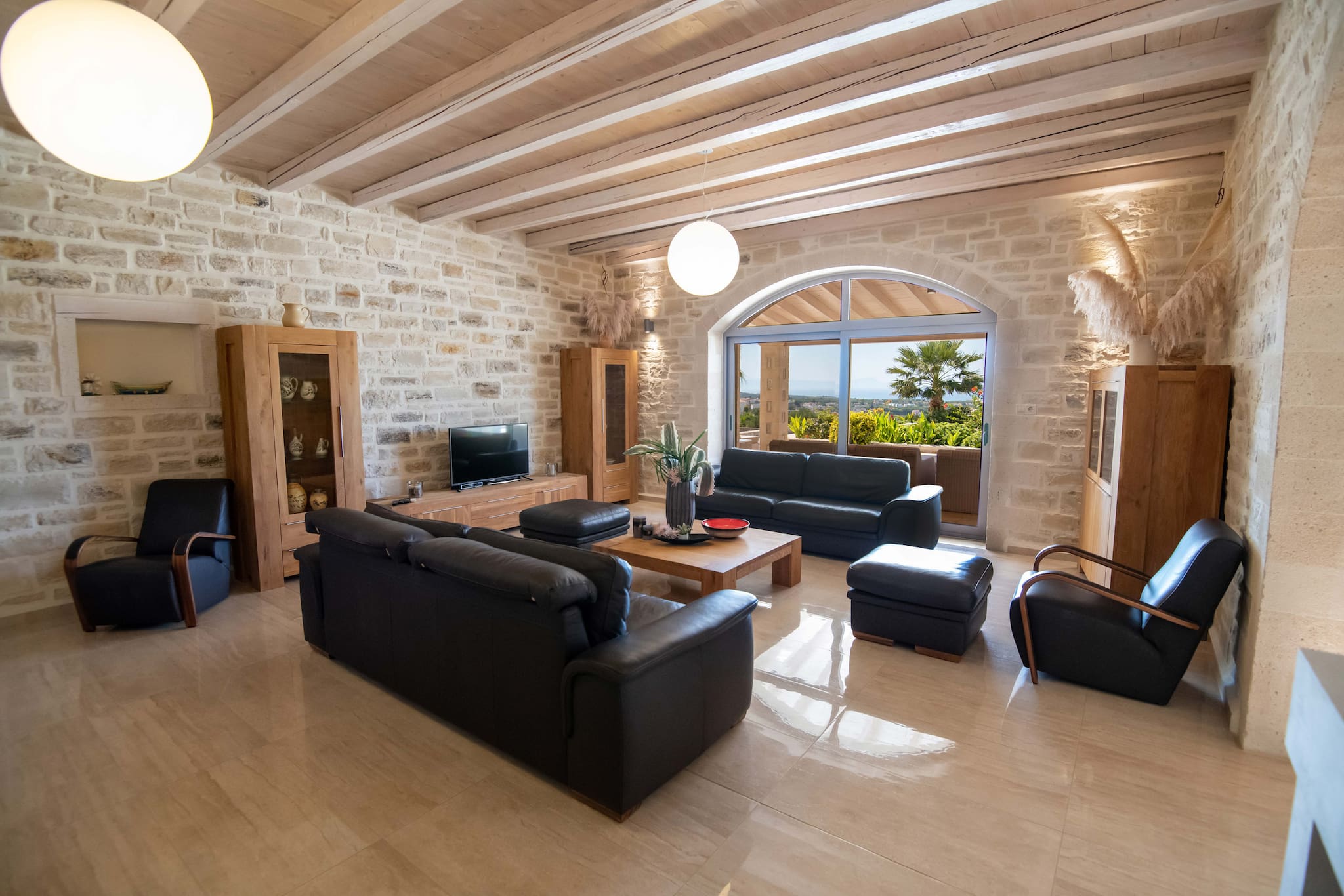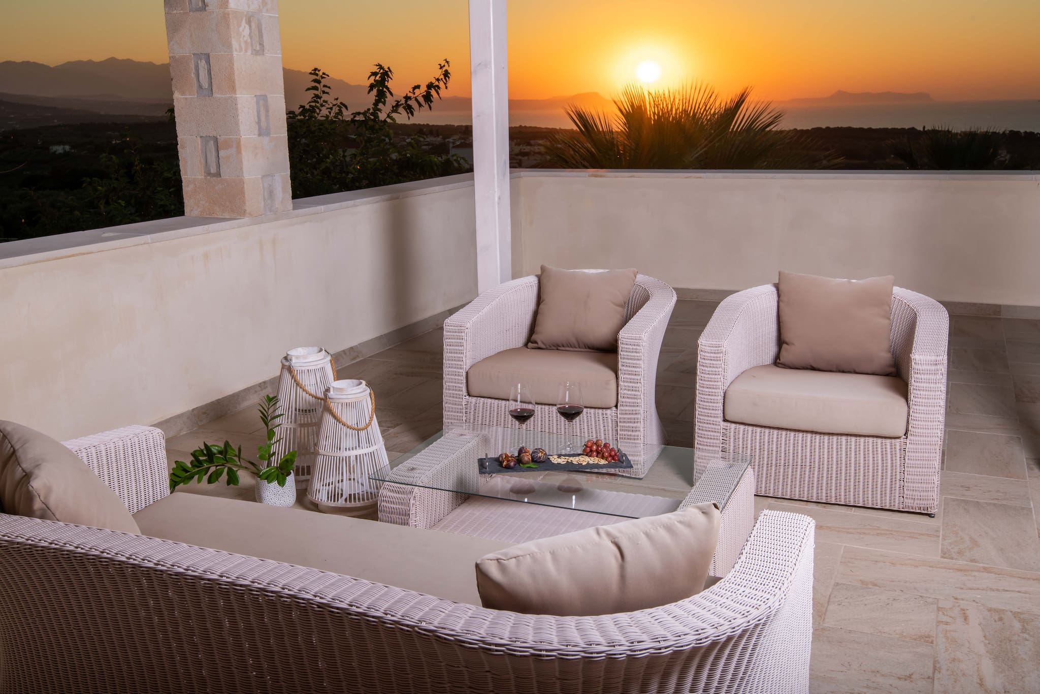Inside, the villa includes a large living and dining area, a fully equipped kitchen, and a WC. The ground floor hosts one spacious double bedroom with a classic en-suite bathroom, while upstairs there are two more comfortable double bedrooms, each with its own en-suite bathroom and access to large balconies with stunning sea and mountain views. On the front side, you can enjoy the villa and the beautiful sunsets, while the back side overlooks charming nearby villages.