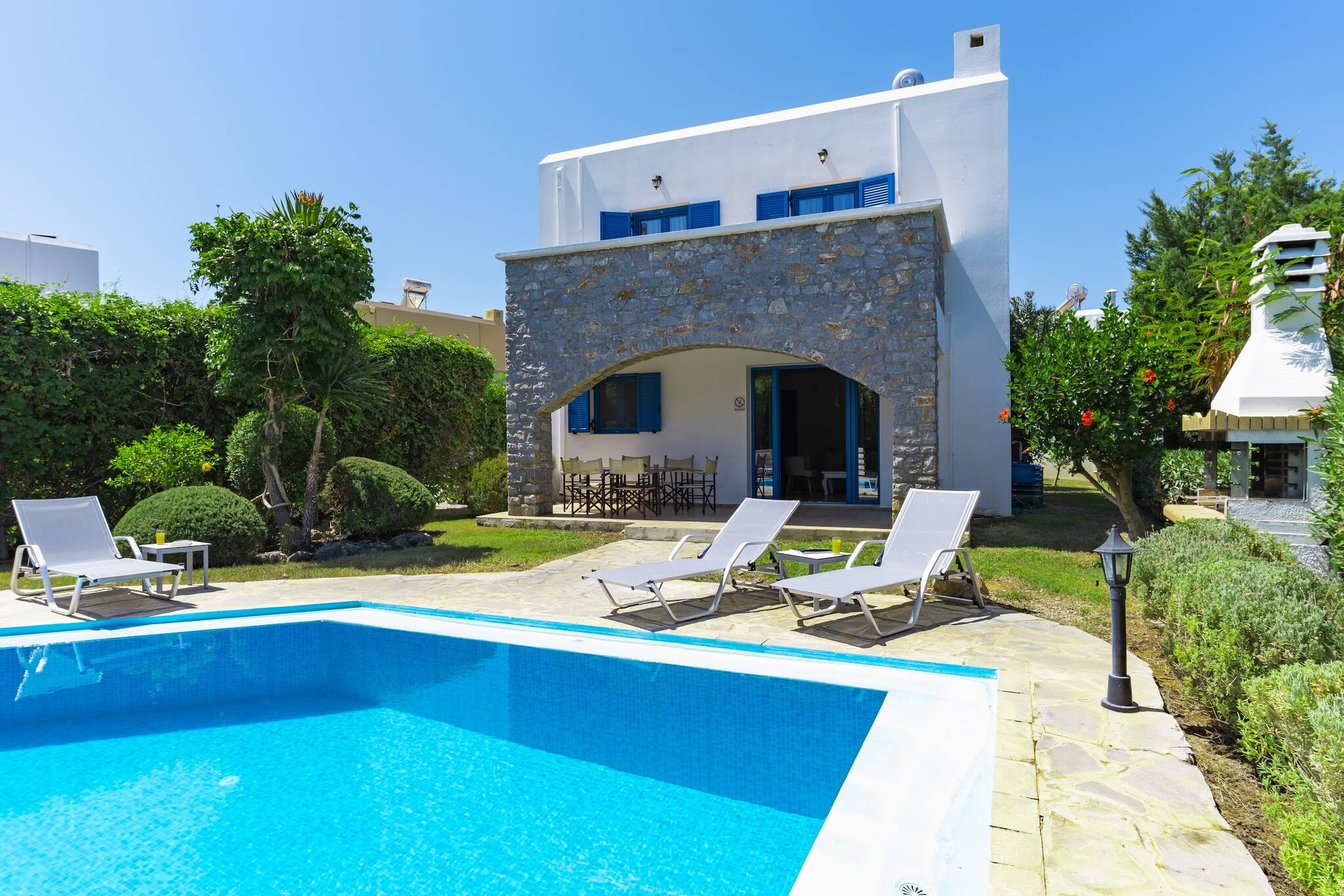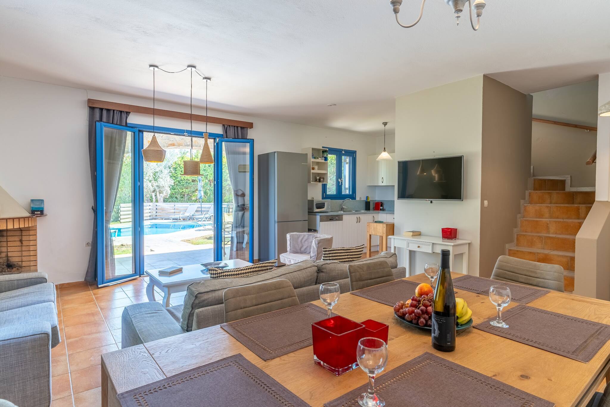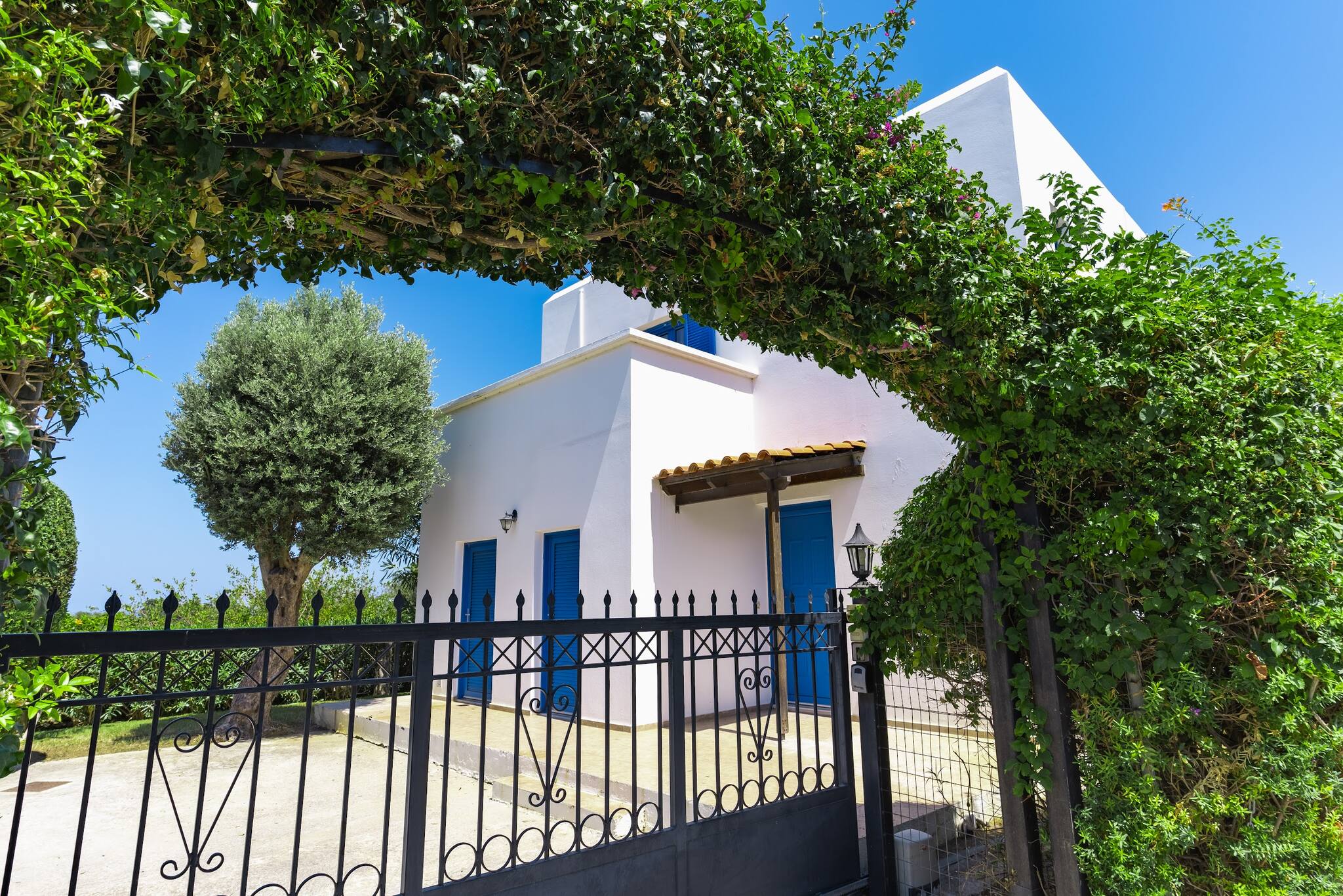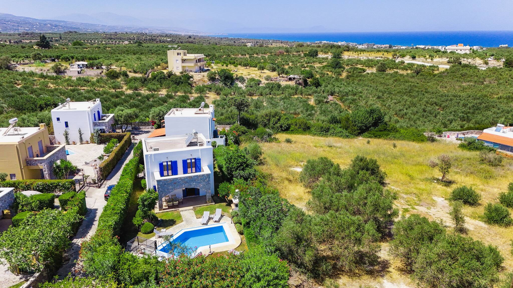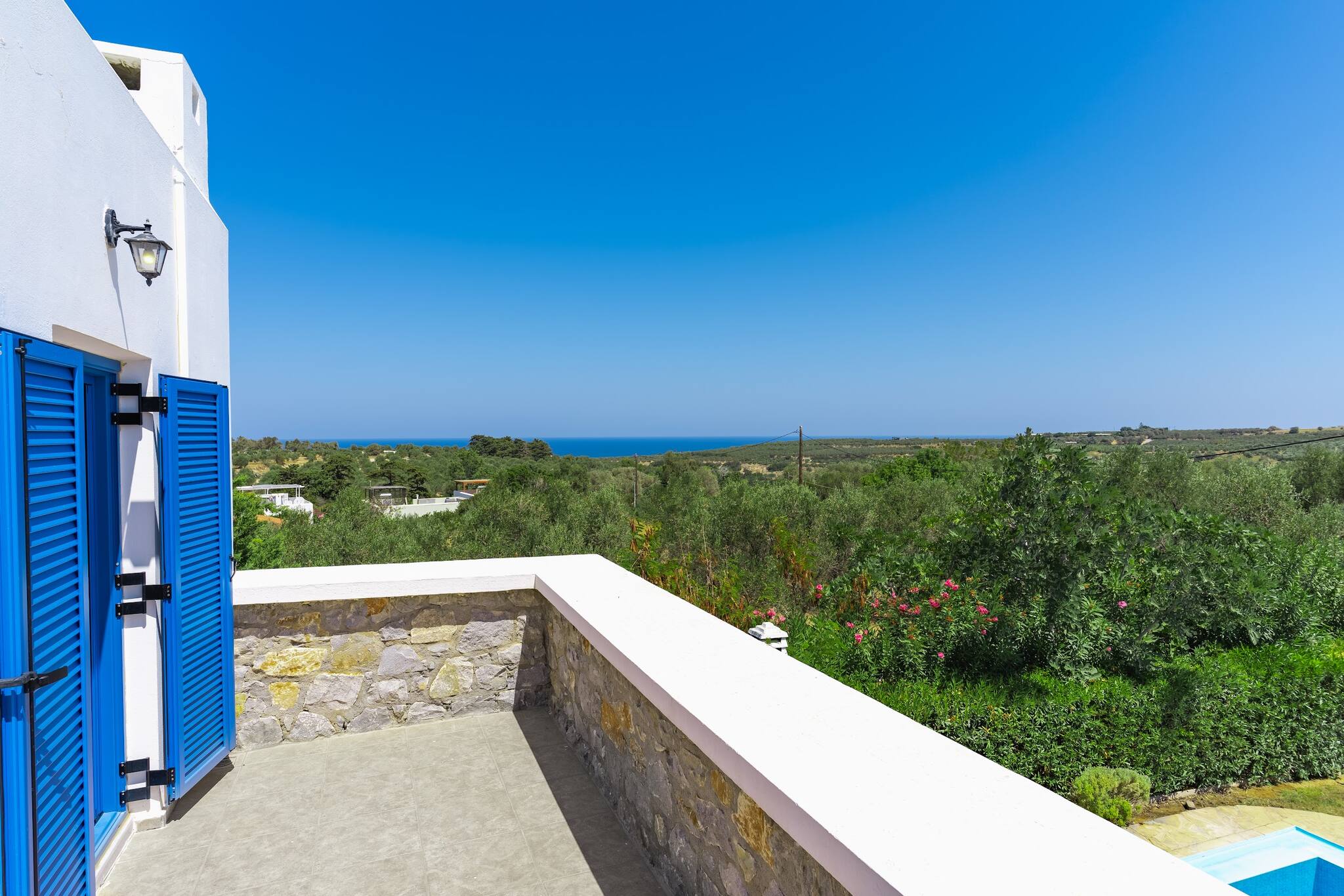 • Charming Greek Design: Embrace the traditional Greek aesthetic with Villa Irini’s whitewashed walls, striking blue shutters, and rustic stone elements, all set against the beautiful backdrop of the Cretan landscape.
