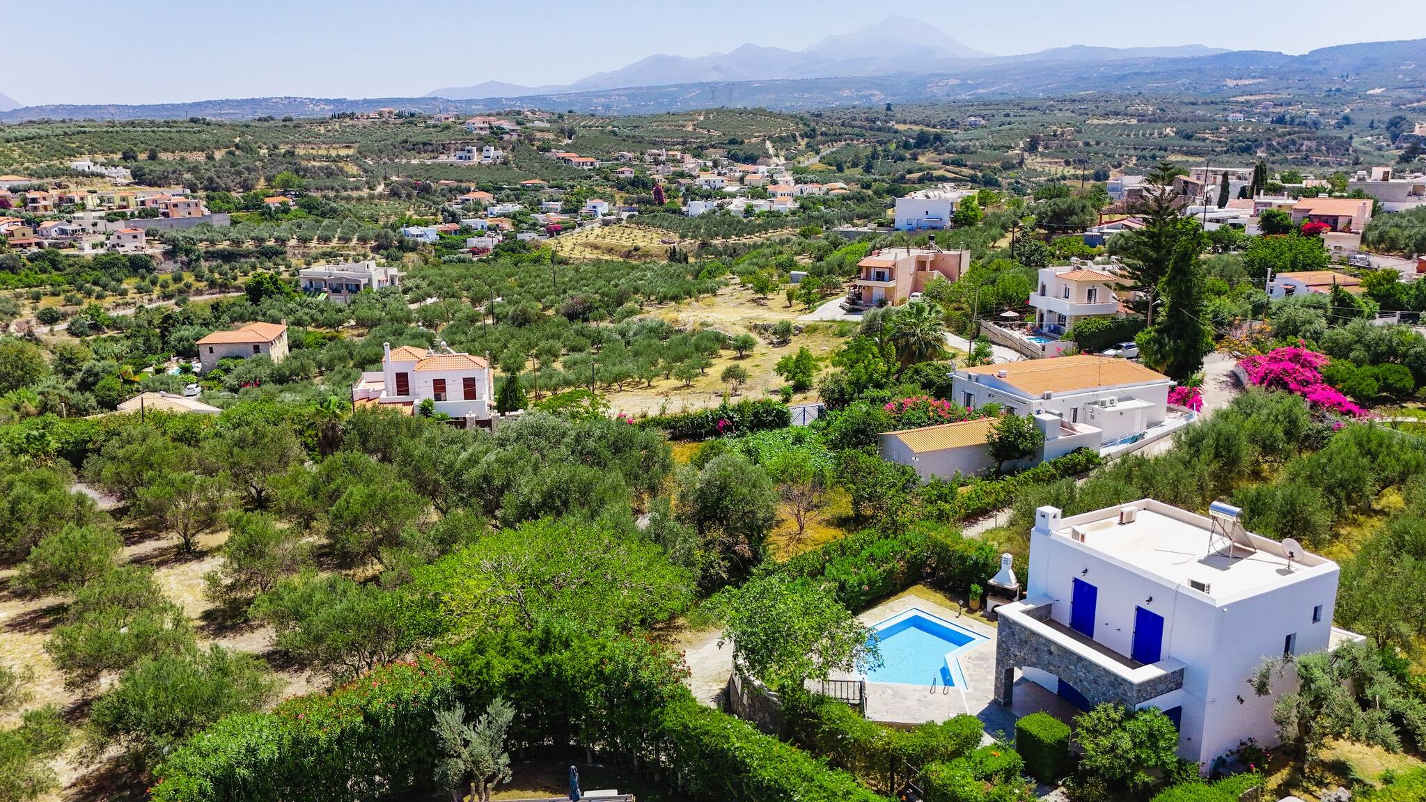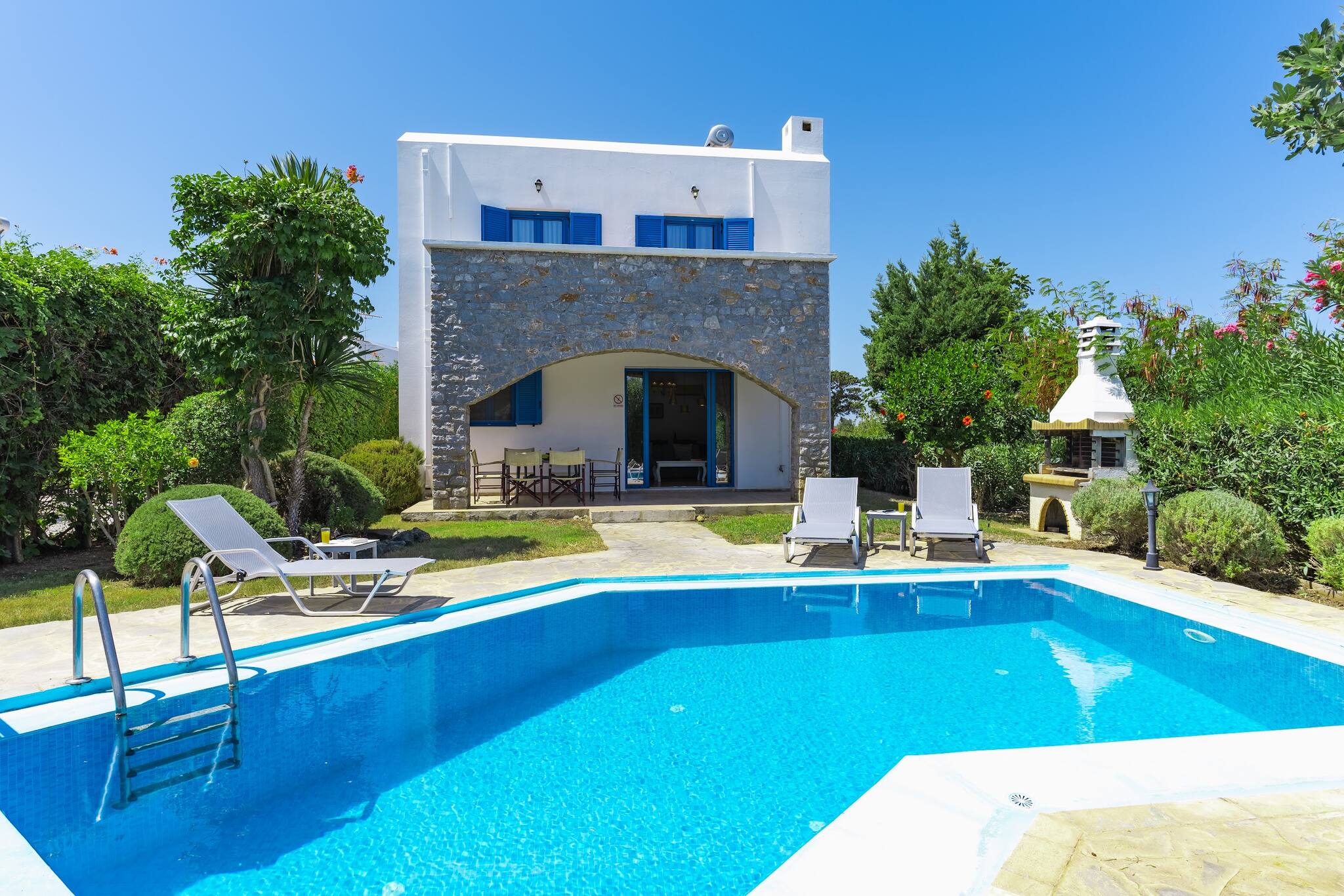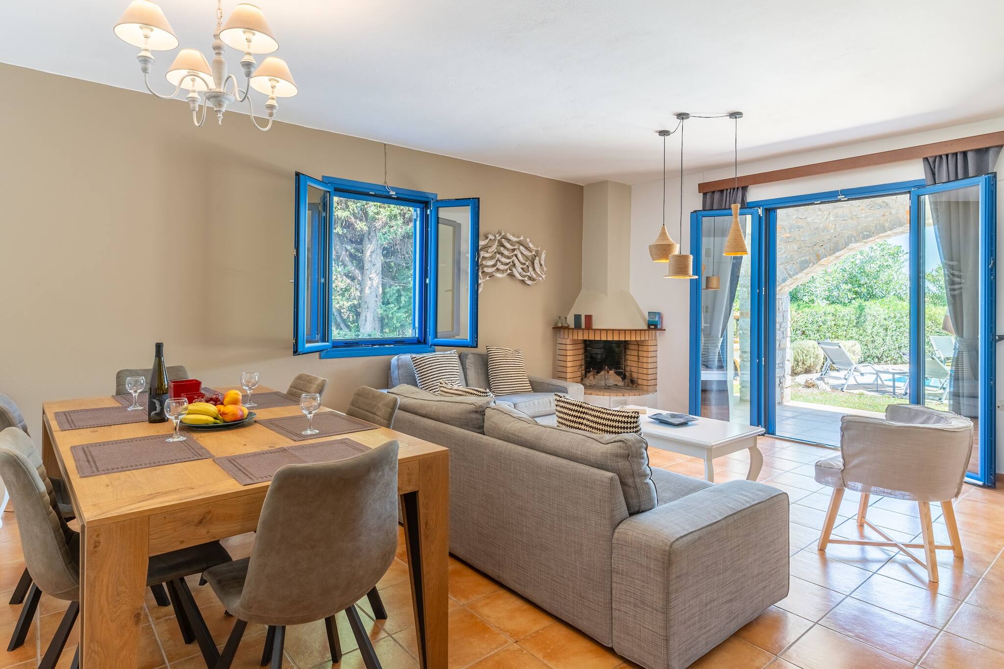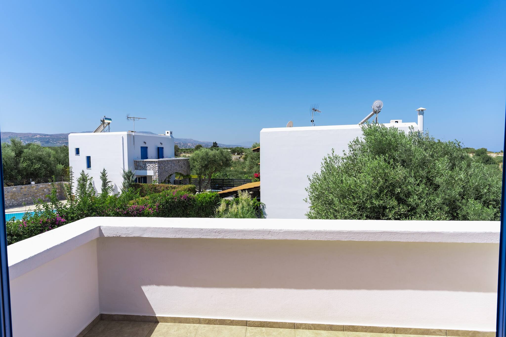 • Charming Greek Design: Embrace the traditional Greek aesthetic with Villa Irini’s whitewashed walls, striking blue shutters, and rustic stone elements, all set against the beautiful backdrop of the Cretan landscape.