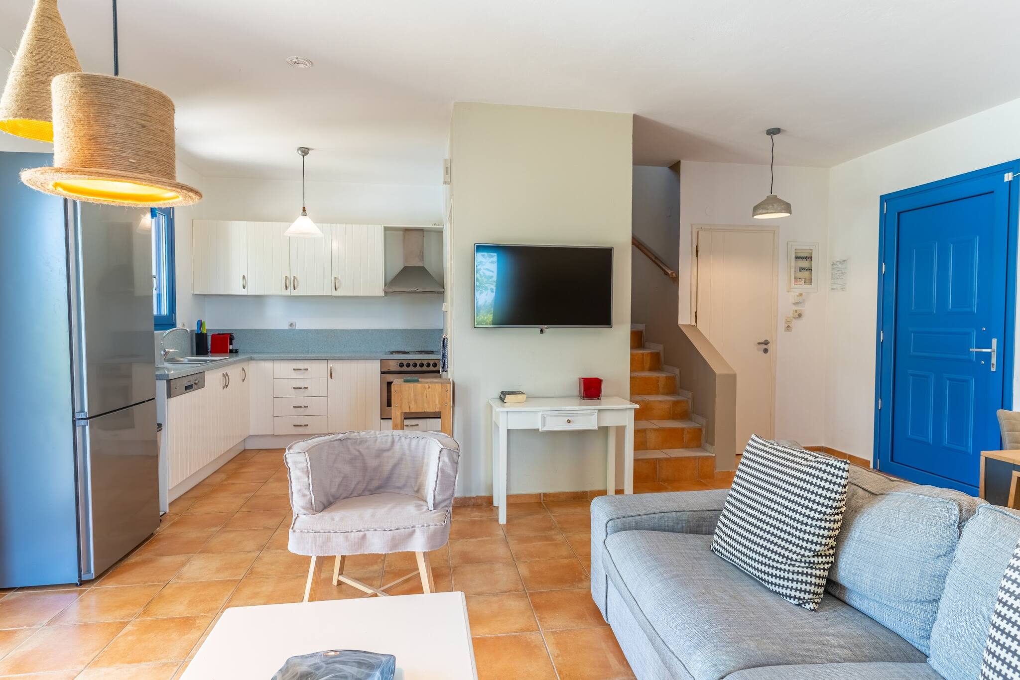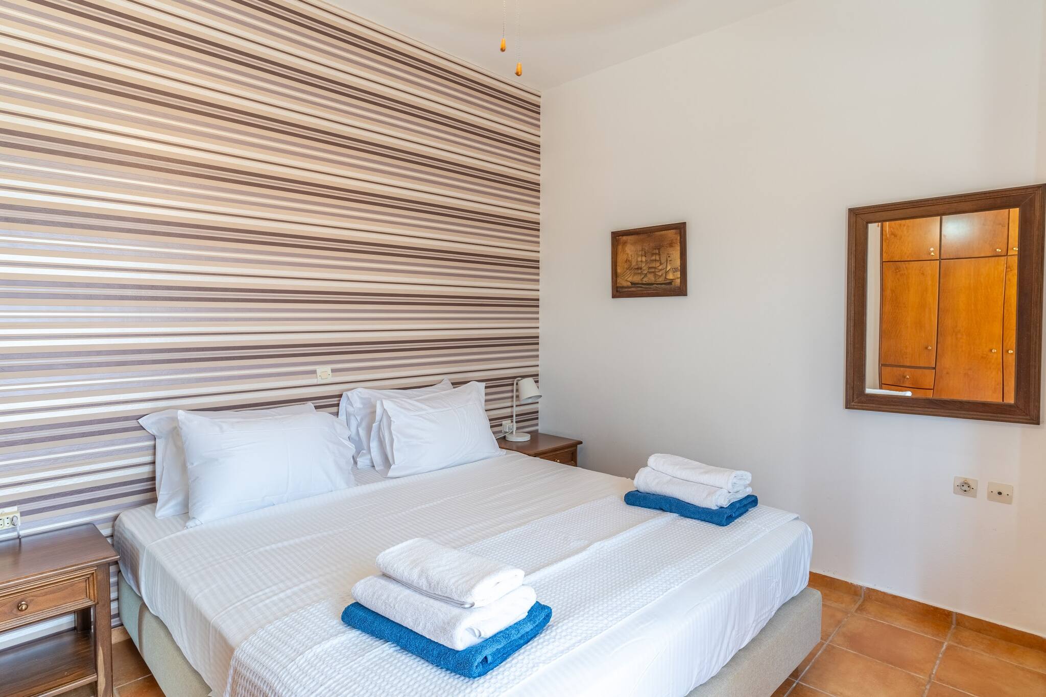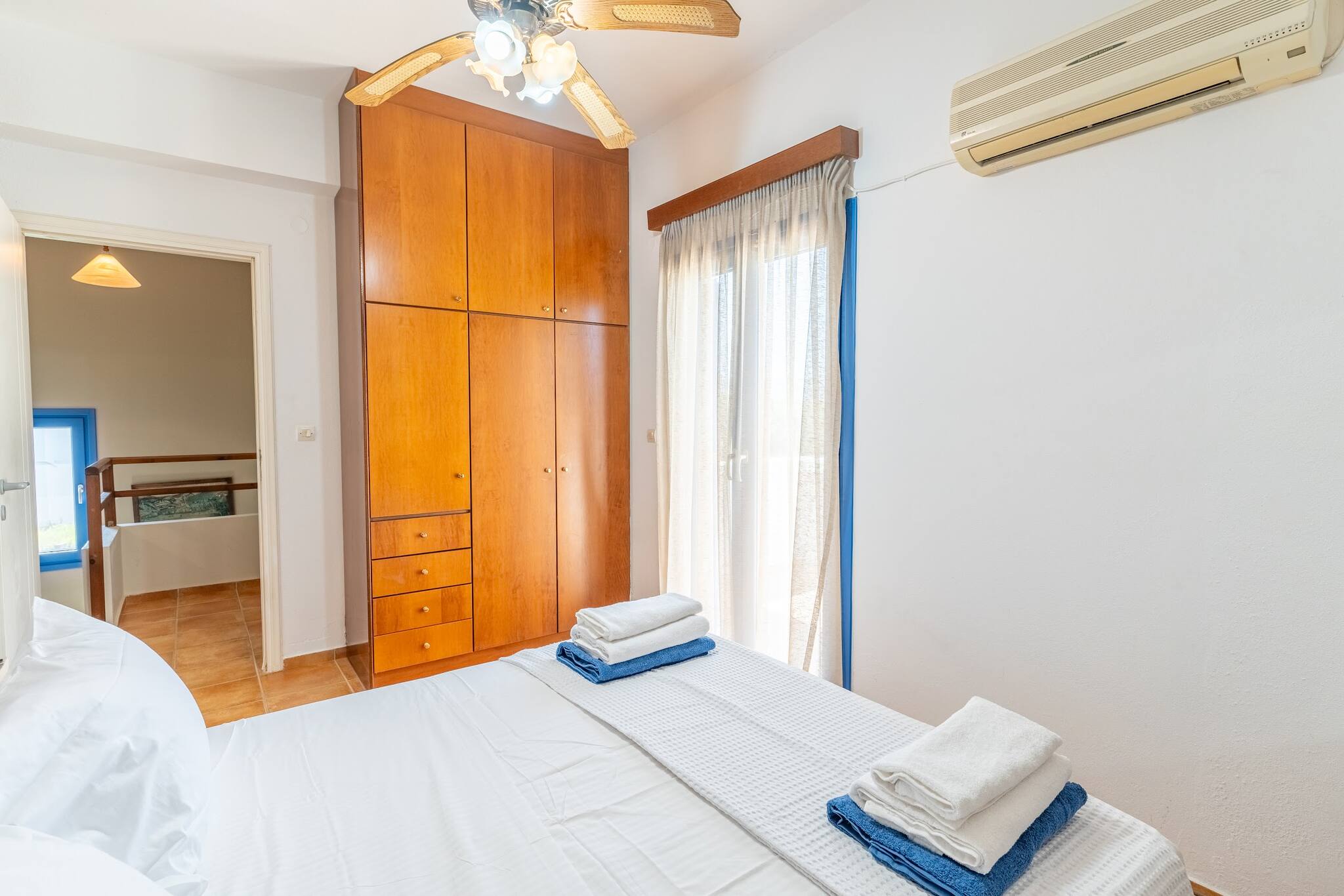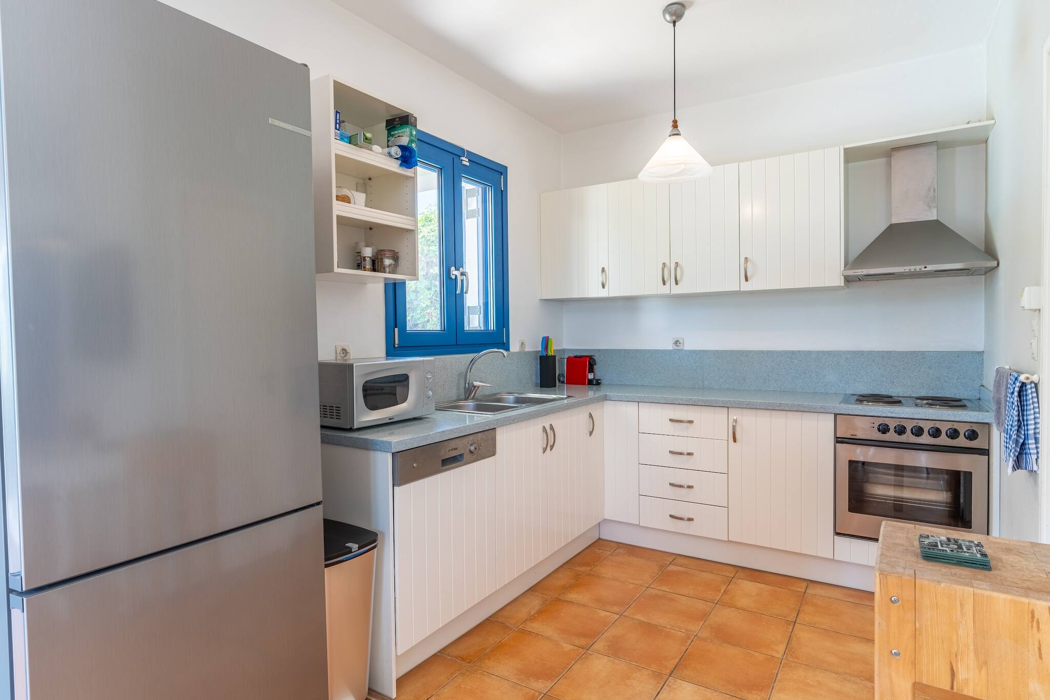 • Charming Greek Design: Embrace the traditional Greek aesthetic with Villa Irini’s whitewashed walls, striking blue shutters, and rustic stone elements, all set against the beautiful backdrop of the Cretan landscape.