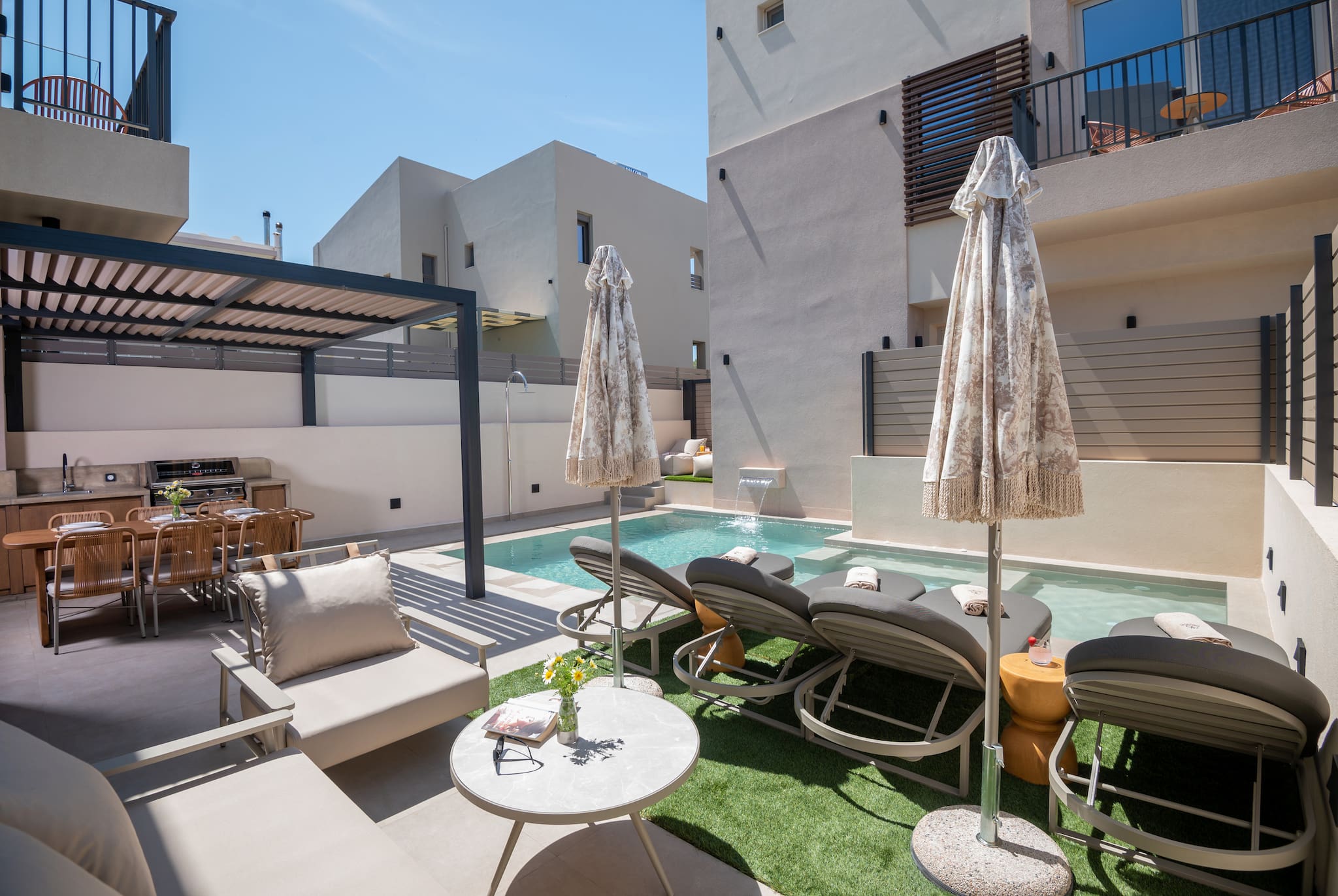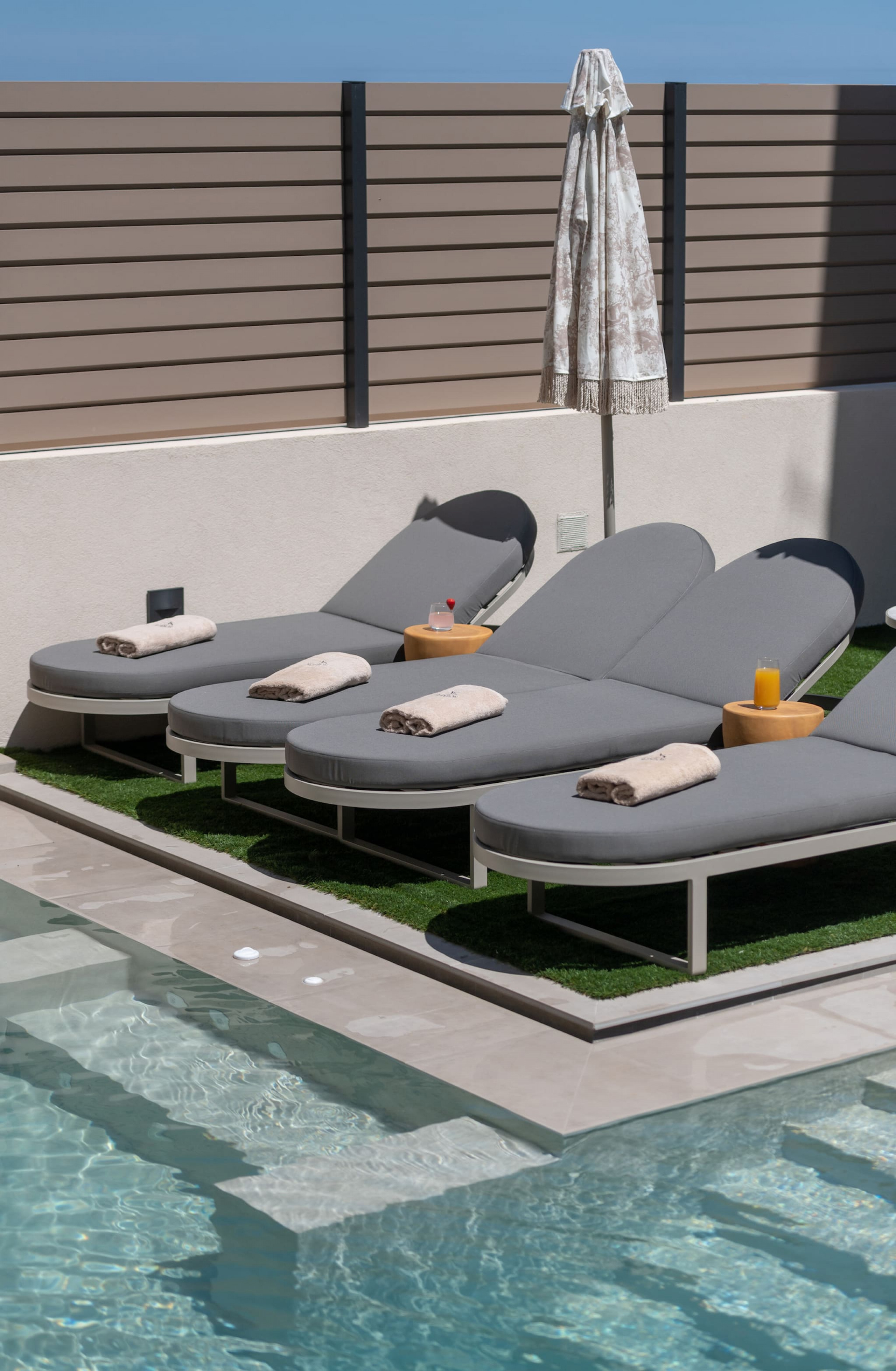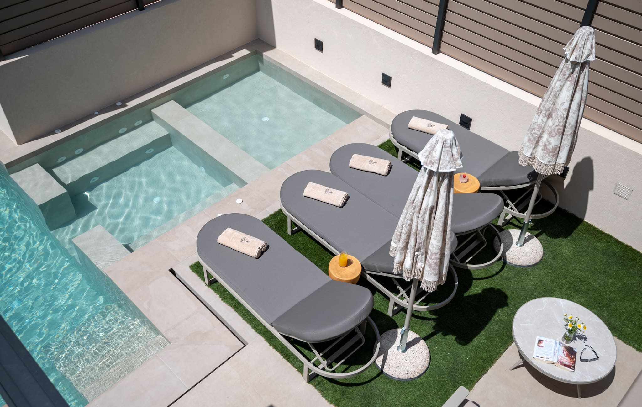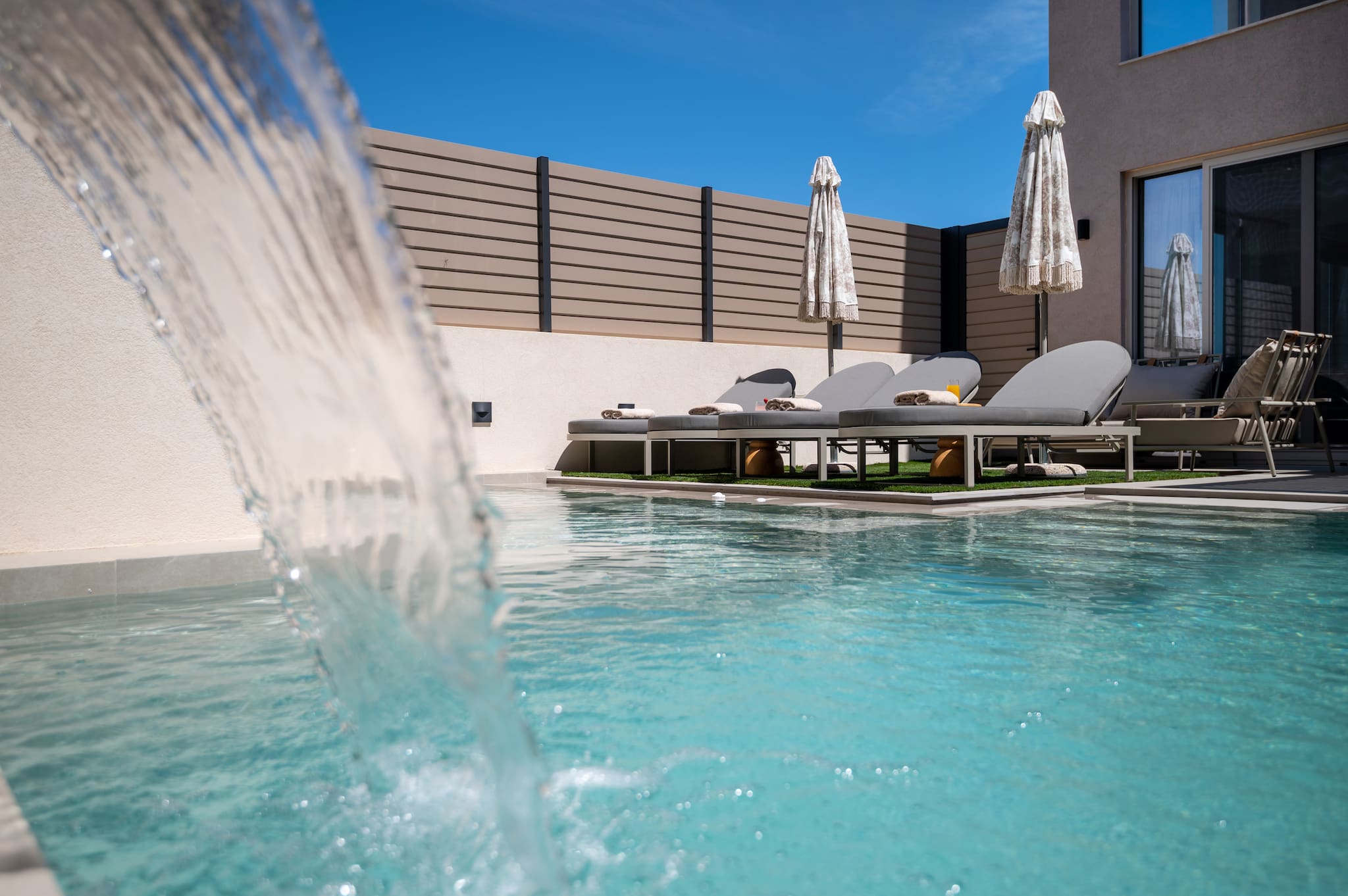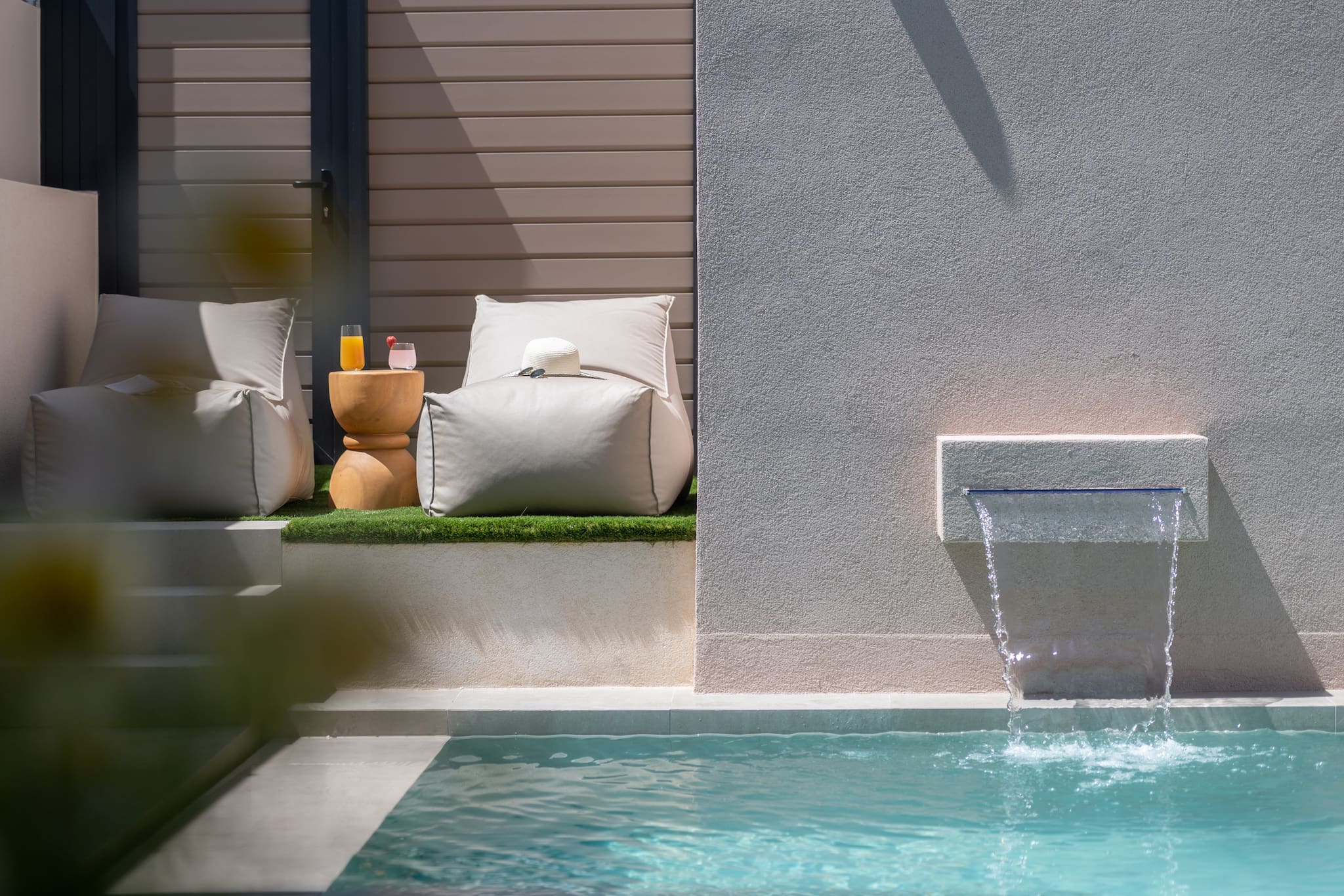 The true jewels of Avissos Resort are the private outdoor spaces of each villa. Relax beside your private swimming pool, complete with a children’s area, jacuzzi section, and a tranquil waterfall feature. Comfortable sun loungers line the poolsides, offering the perfect spot to soak up the Cretan sun in total serenity.