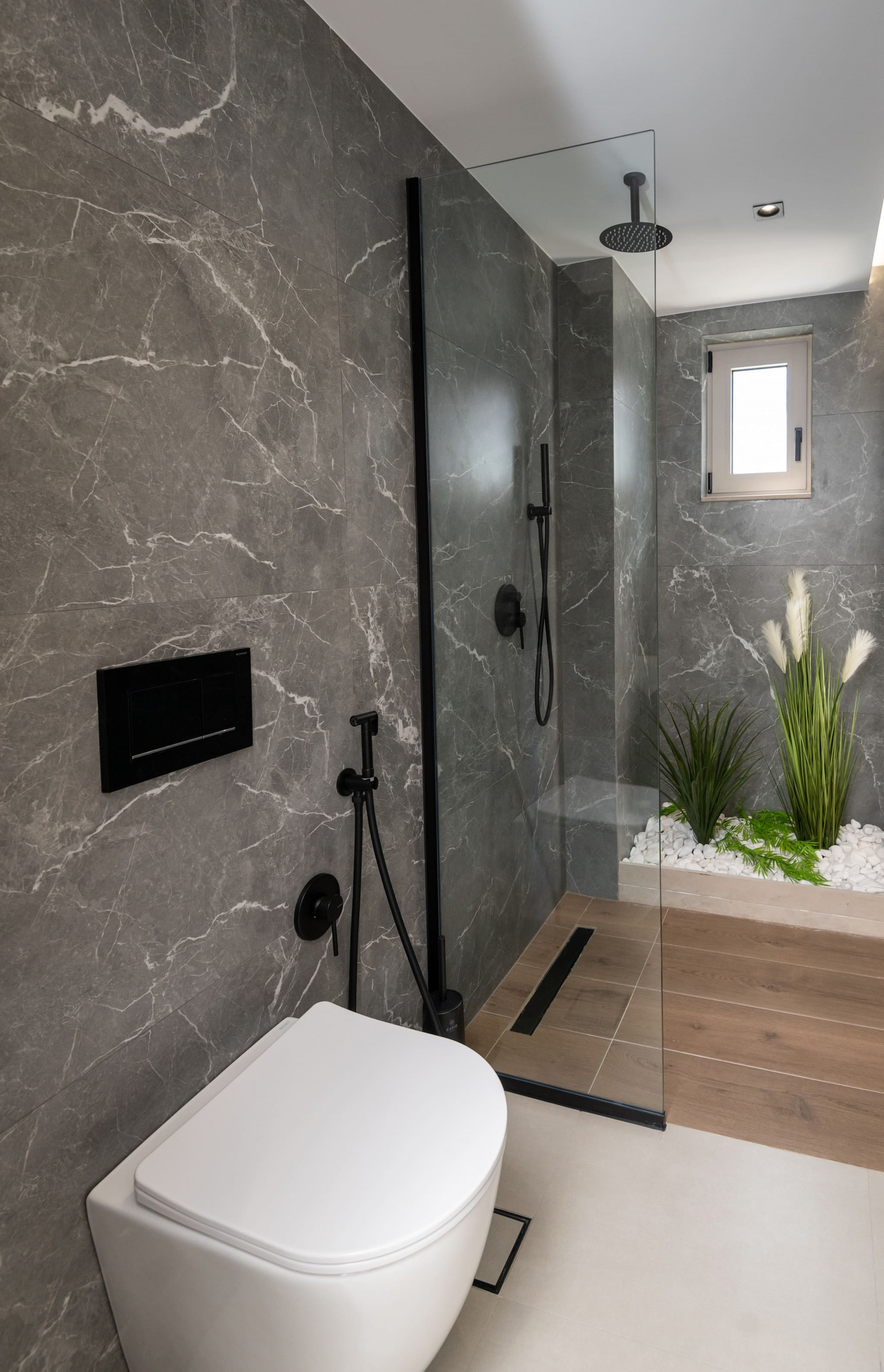 The villas each offer three sleek en-suite bathrooms and an additional guest WC, all finished with premium materials and thoughtful design.