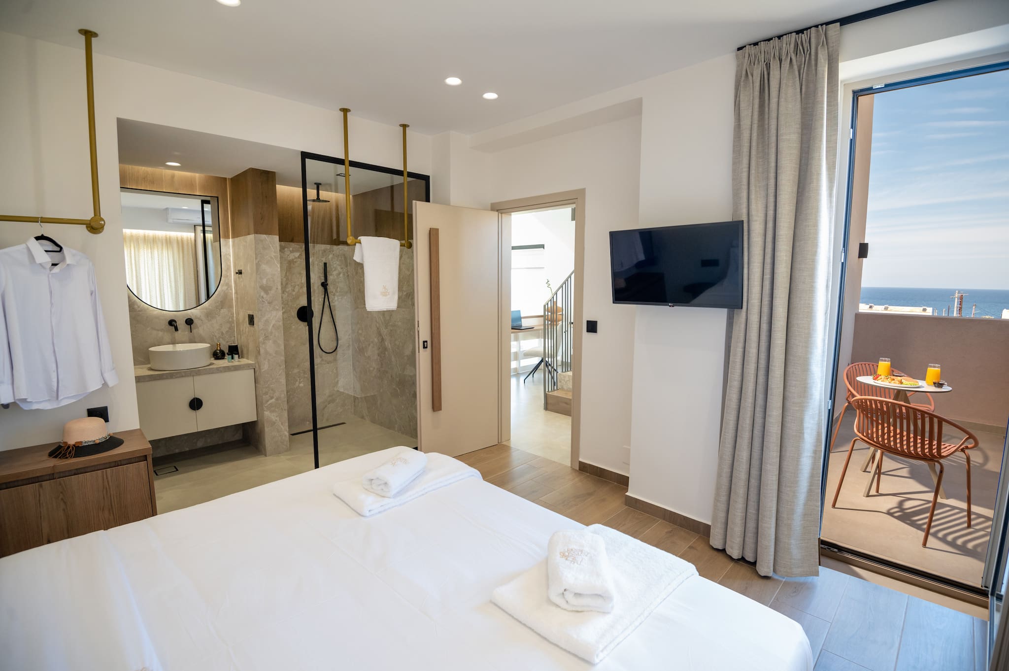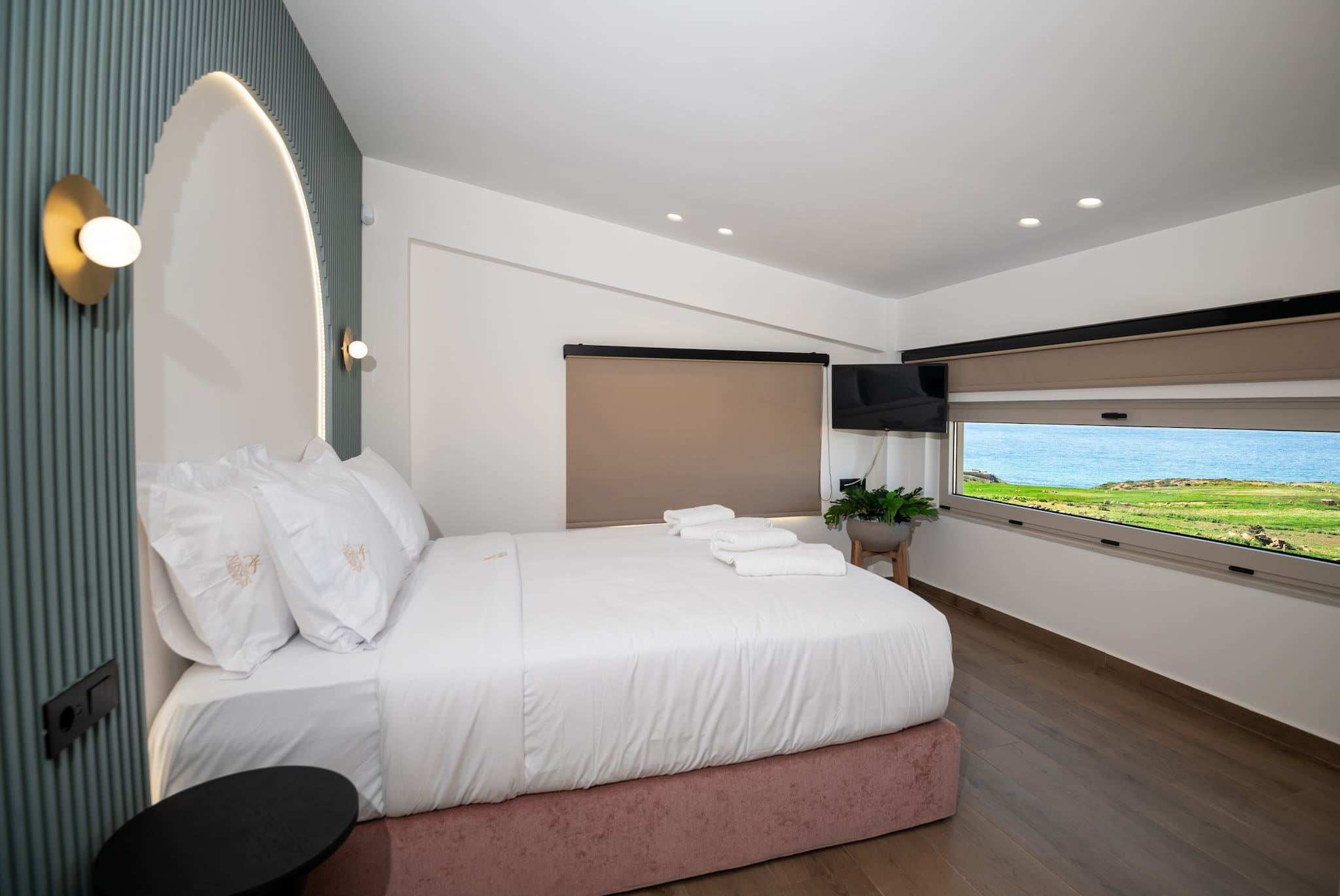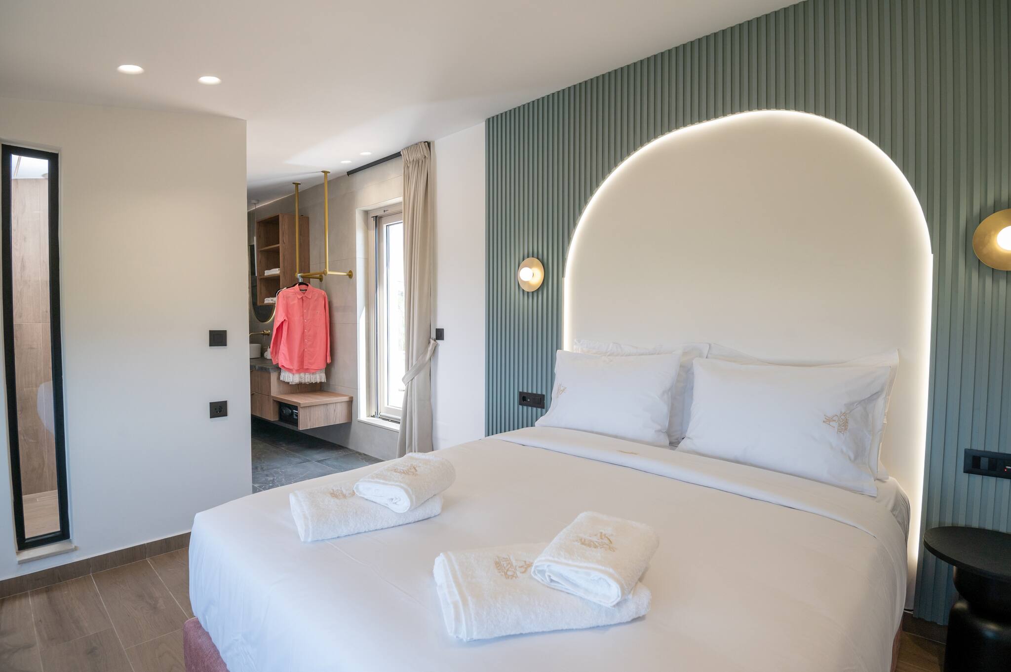 Each villa features three beautifully appointed bedrooms with plush bedding, blackout curtains, tasteful décor, and panoramic sea views. Smart TVs (32") with Greek and international channels, air conditioning with heating and cooling, and flexible bed configurations (including king-size beds that can be converted into twins) ensure every guest’s comfort is fully catered for.