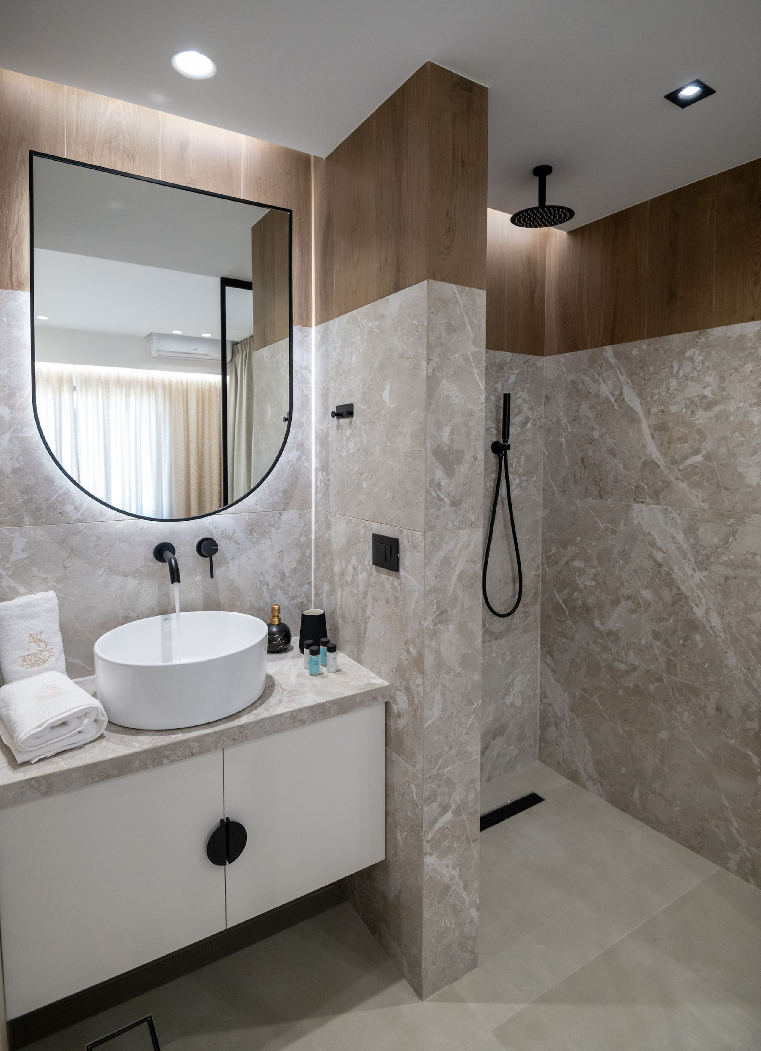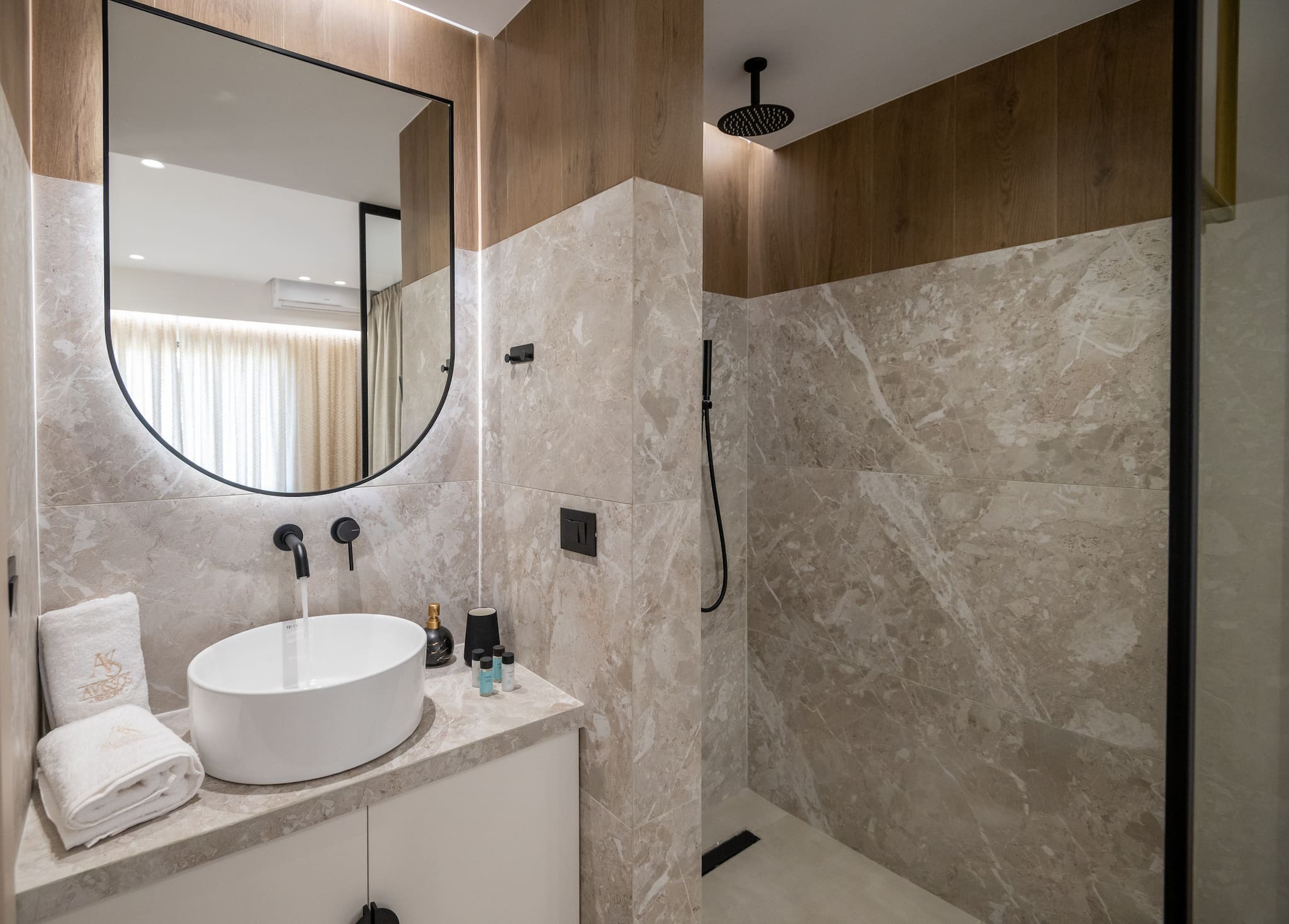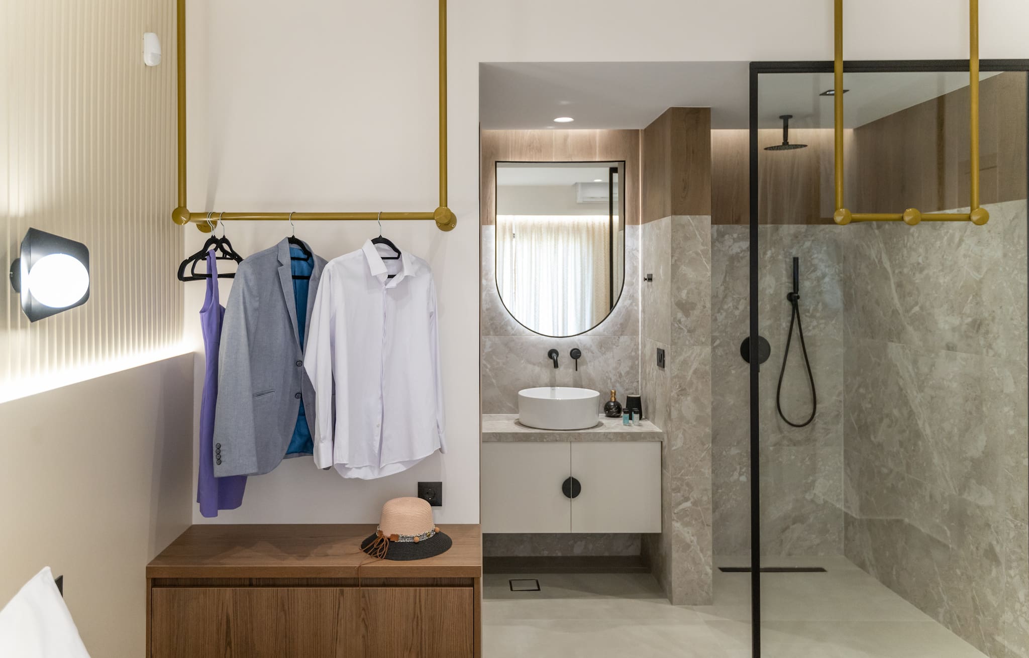 Each villa features three beautifully appointed bedrooms with plush bedding, blackout curtains, tasteful décor, and panoramic sea views. Smart TVs (32") with Greek and international channels, air conditioning with heating and cooling, and flexible bed configurations (including king-size beds that can be converted into twins) ensure every guest’s comfort is fully catered for.