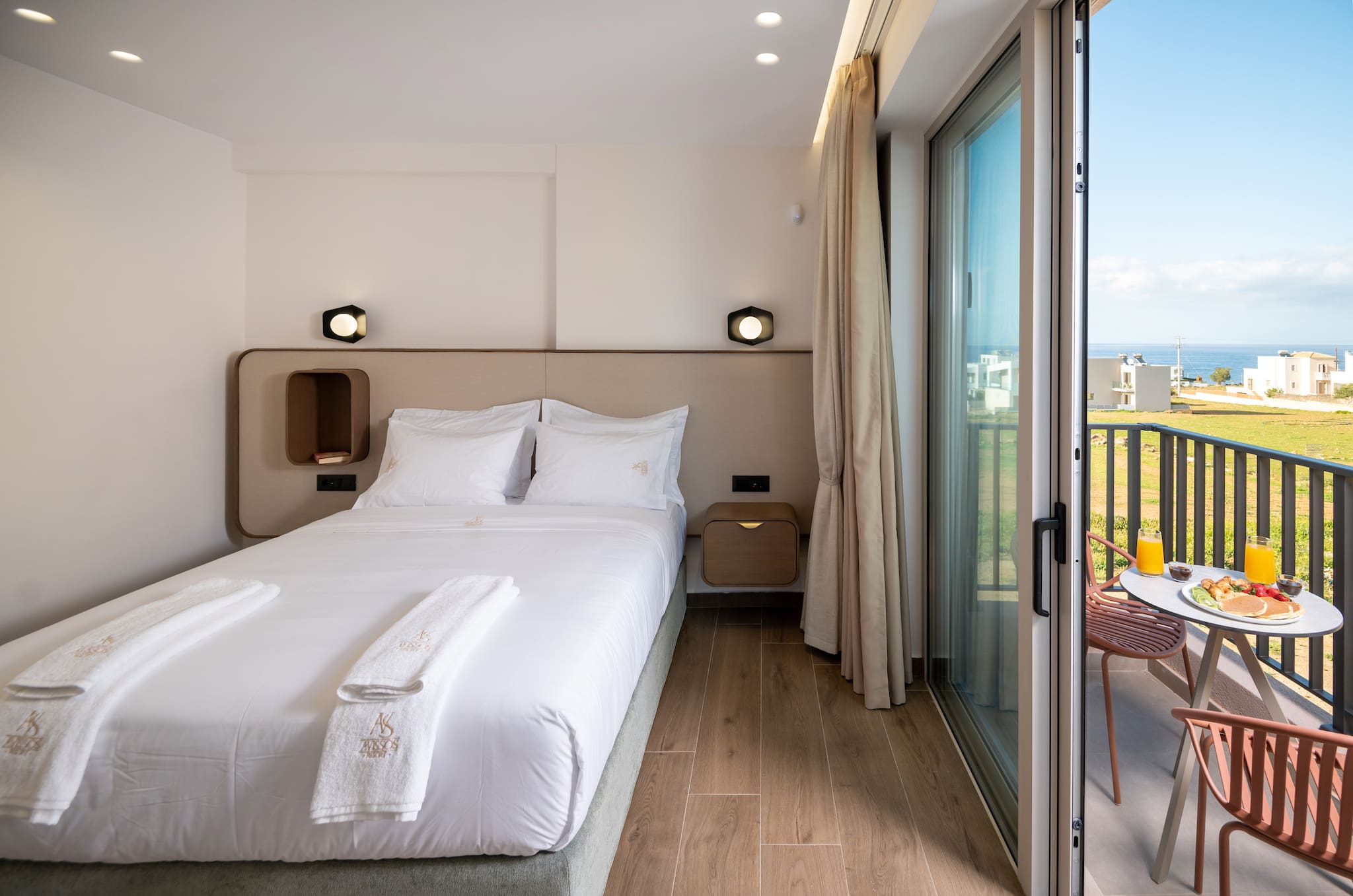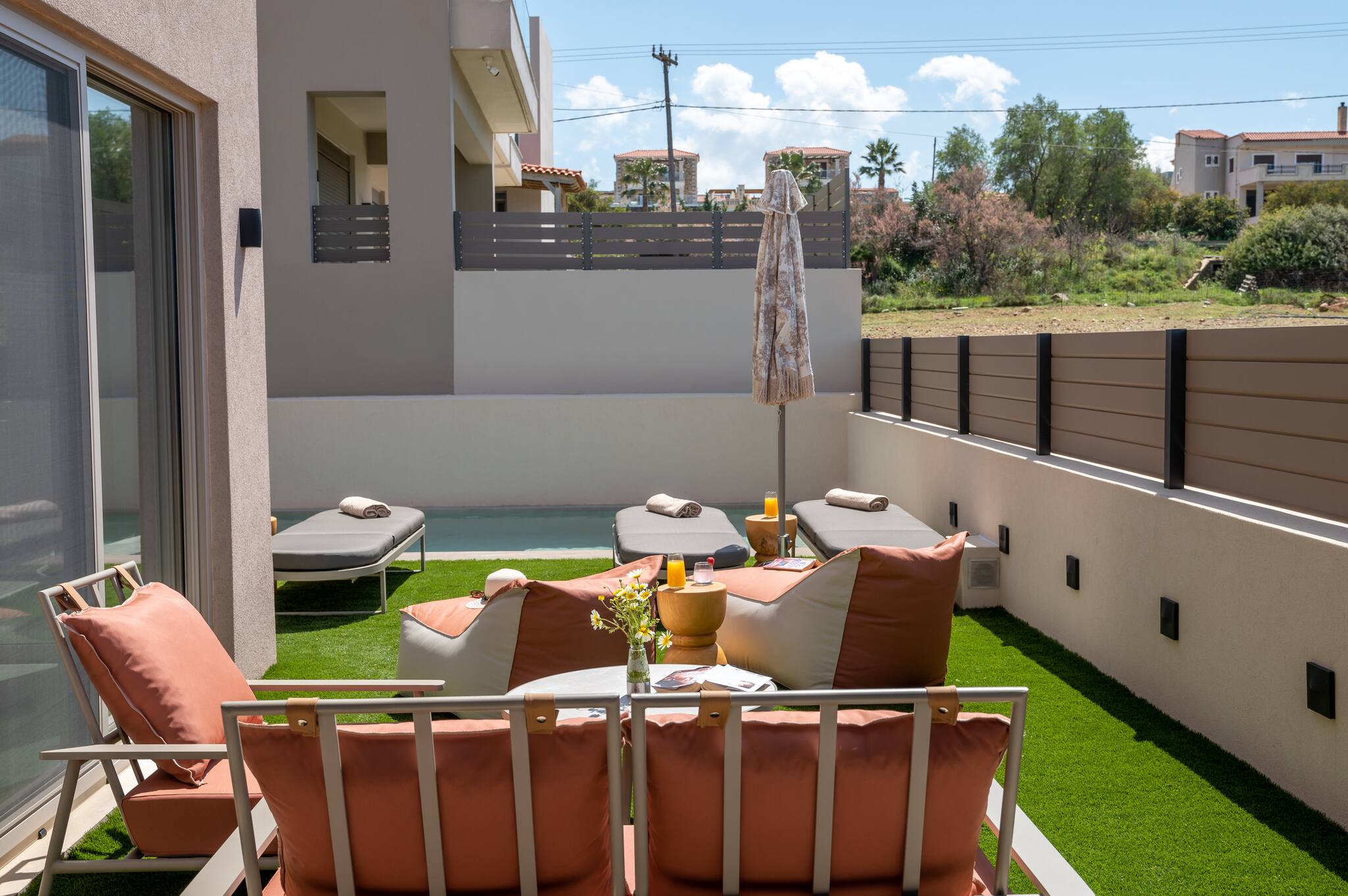 Upstairs, the private terrace is a peaceful retreat with sweeping countryside views — ideal for morning coffee, evening cocktails, or stargazing under the Cretan sky.