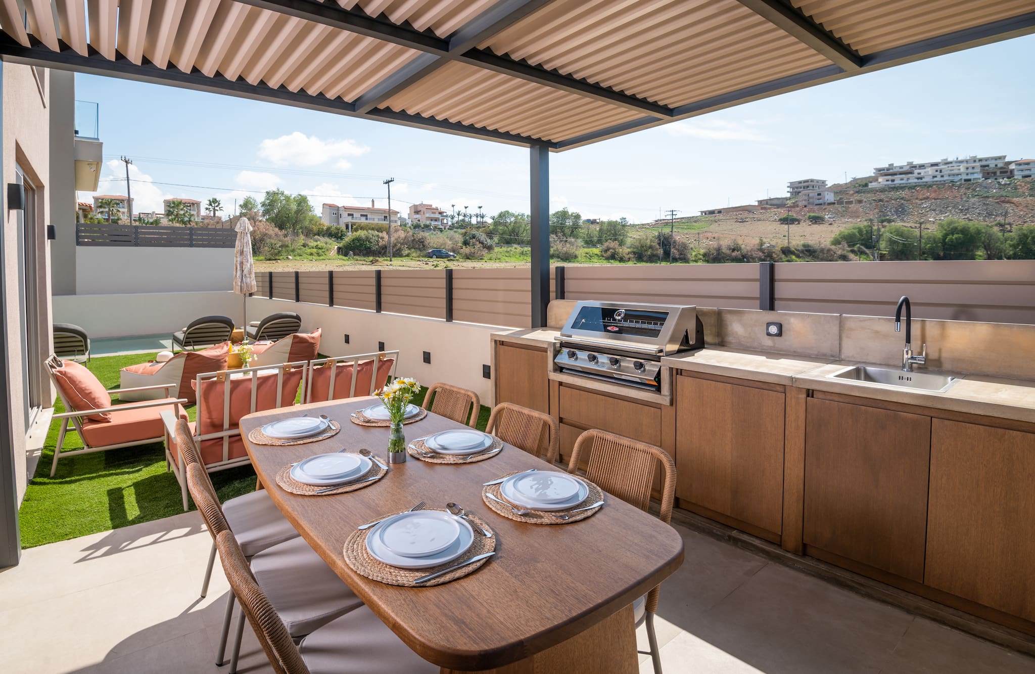 The fully equipped kitchen is outfitted with top-of-the-line appliances, a Nespresso machine, and a filter coffee machine, making it easy to prepare gourmet meals and enjoy them in the stylish indoor dining area. For those who love to cook outdoors, the built-in gas BBQ and a shaded outdoor dining space provide the perfect setting for al fresco meals, enhanced by the sound of distant waves and warm Mediterranean breezes.