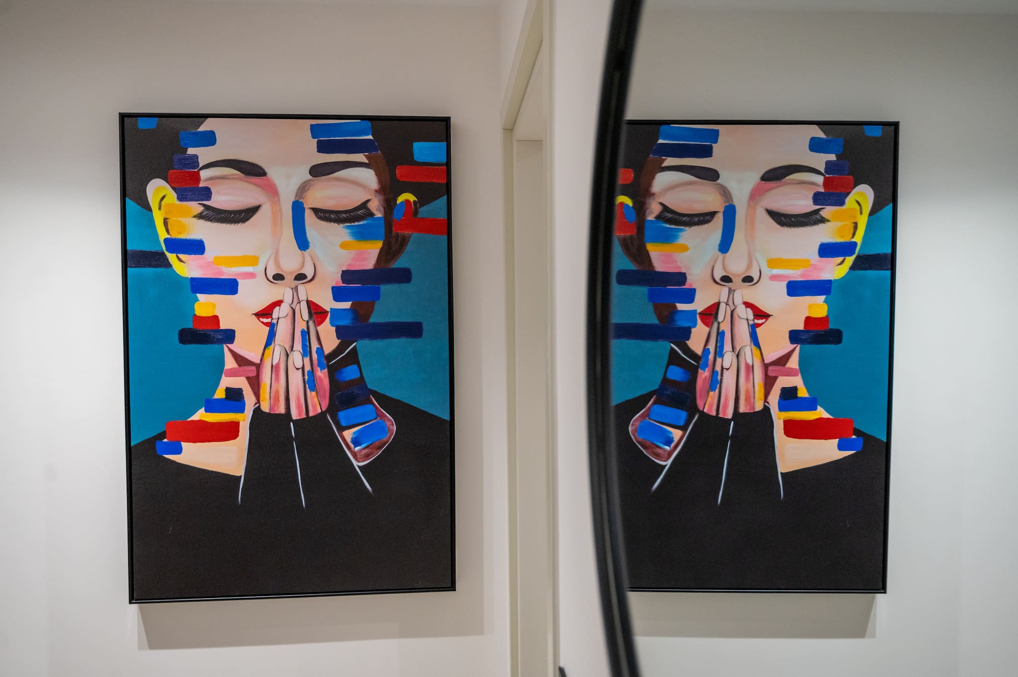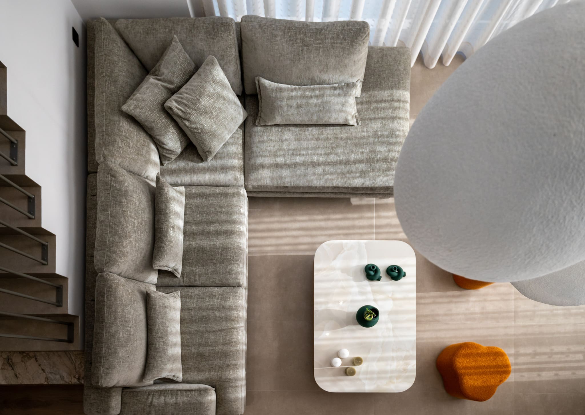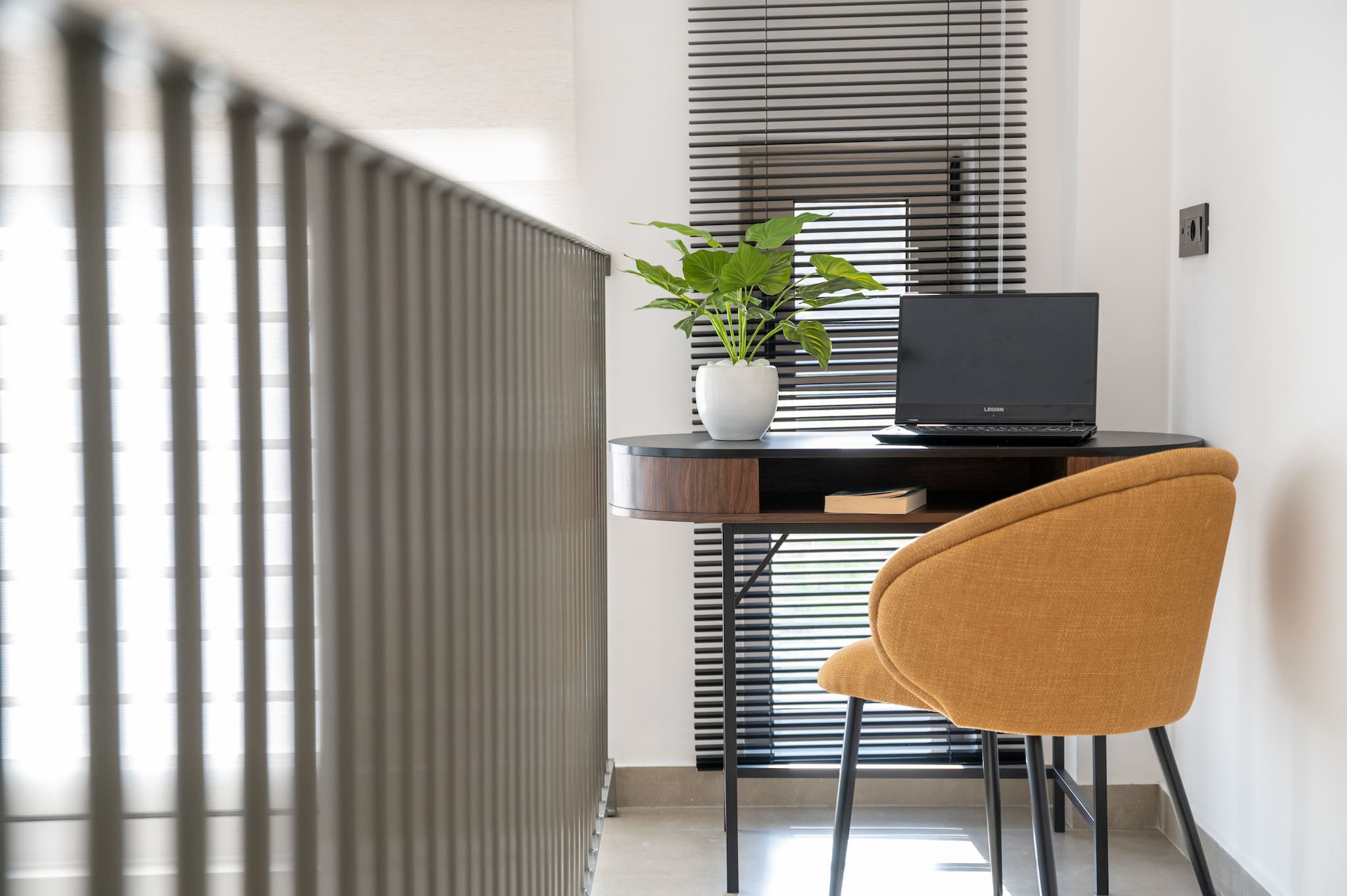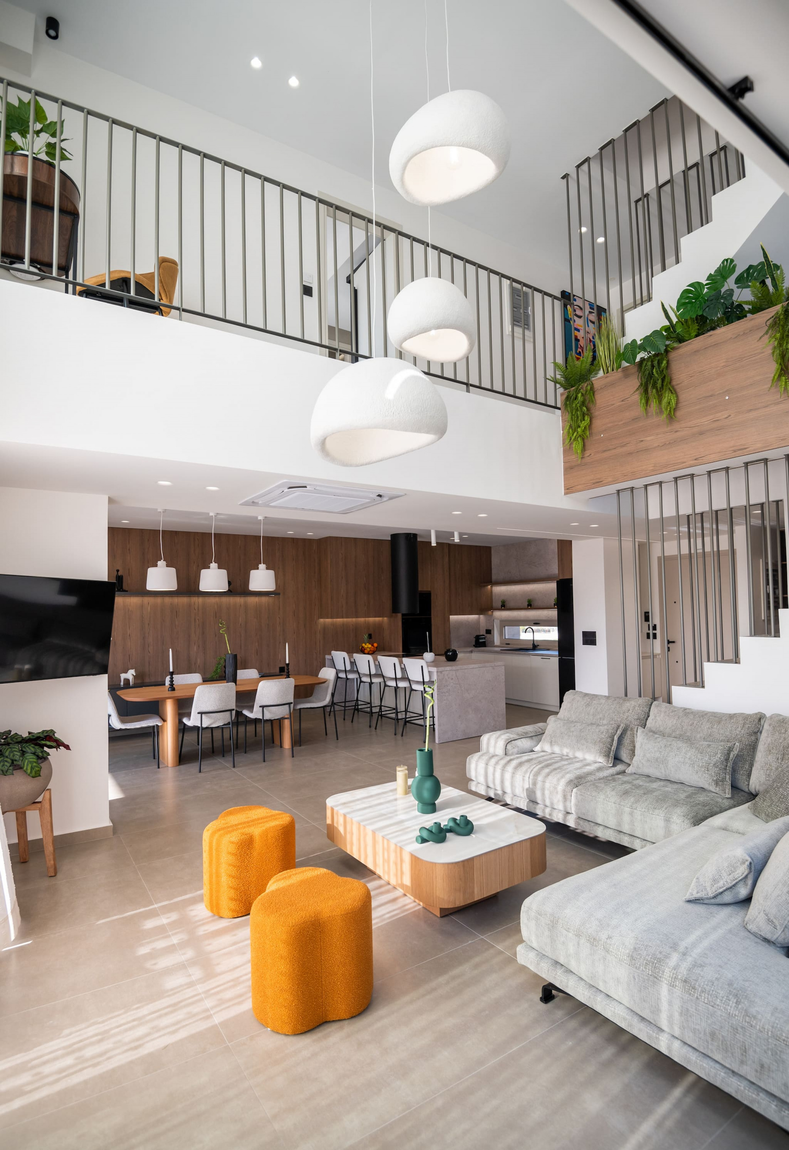 Step into the spacious, open-plan living room, where contemporary design meets comfort. The inviting space is perfect for gathering together to enjoy a film on the 50-inch smart TV or simply unwind after a day of exploring the island. The living area also includes a dedicated office space and is fully air-conditioned, just like each bedroom — with units that can be set to both cooling and heating modes for year-round comfort.