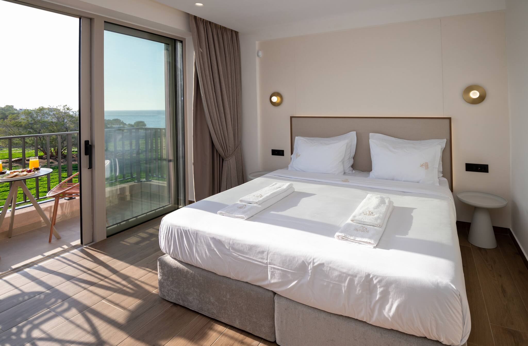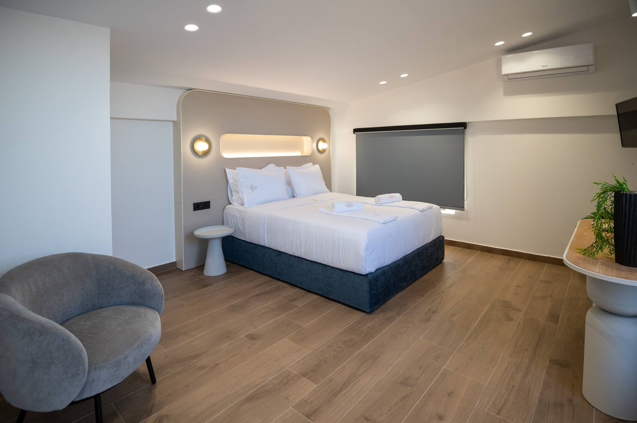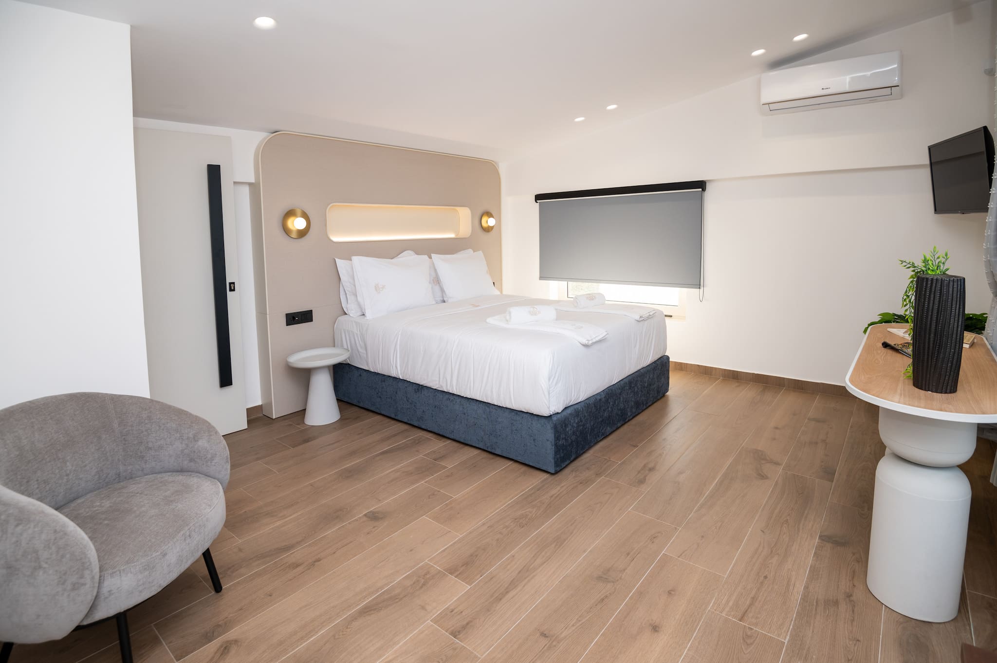 This spacious, three-bedroom villa accommodates up to 6 guests. The villa’s design is a perfect blend of contemporary elegance and Mediterranean charm, with luxurious finishes and premium materials used throughout. Each bedroom has been thoughtfully designed to ensure a restful night’s sleep, featuring high-end furnishings, soft linens, blackout curtains, sea views, and smart TVs (32 inches) with both Greek and international channels. One bedroom features a king-size bed (180x200) that can be converted into two single beds, while the other two offer queen-size beds (160x200) for ultimate comfort.