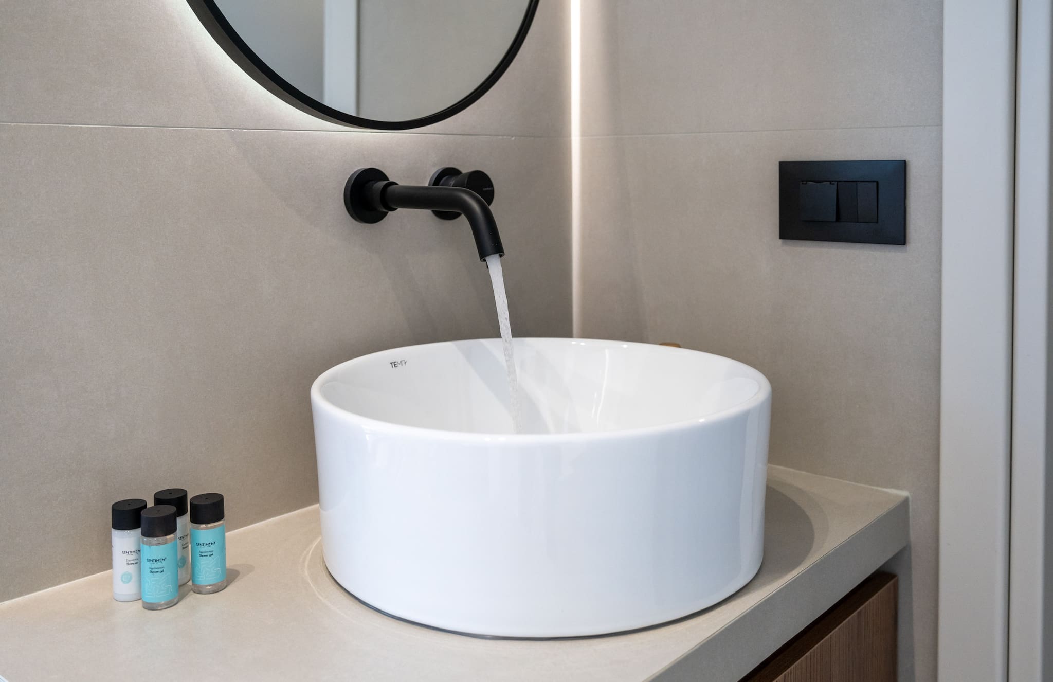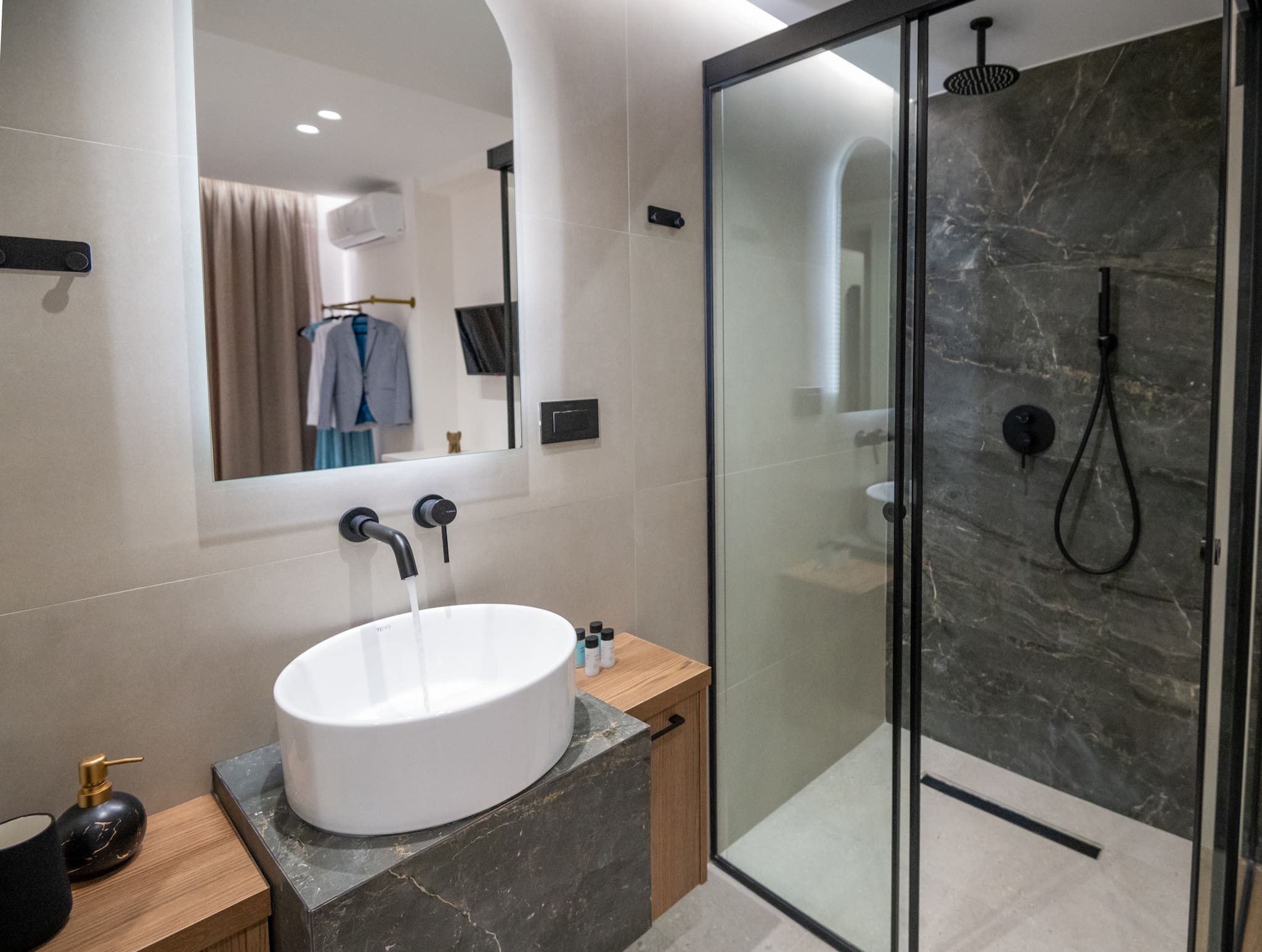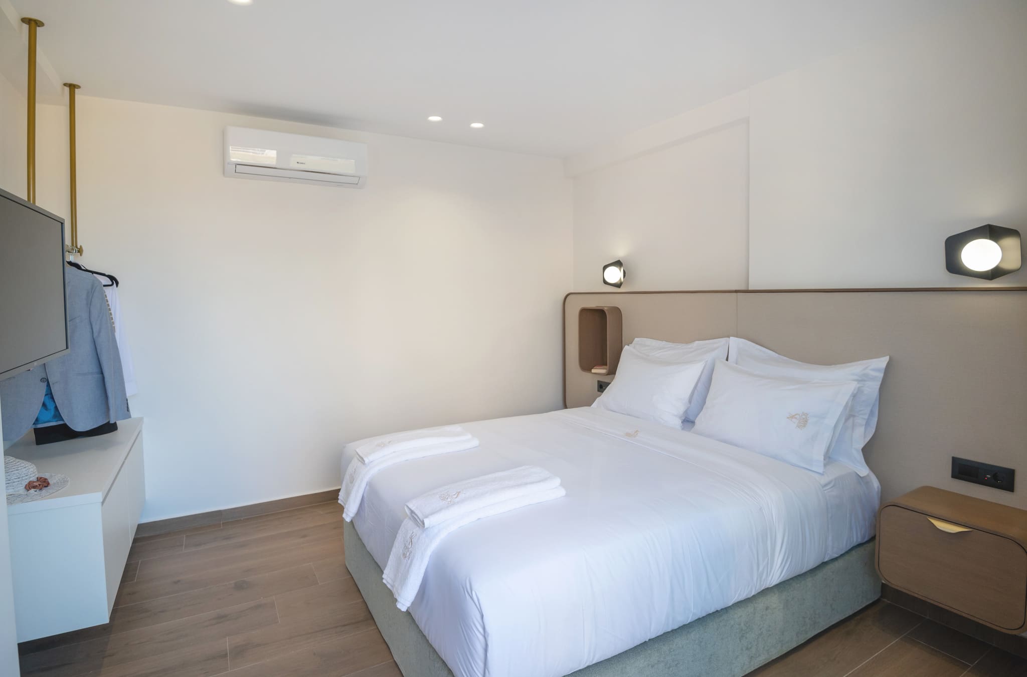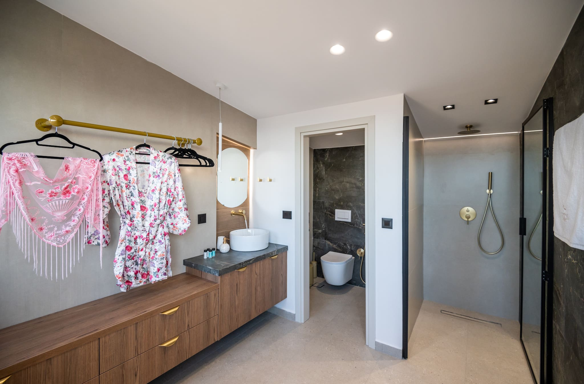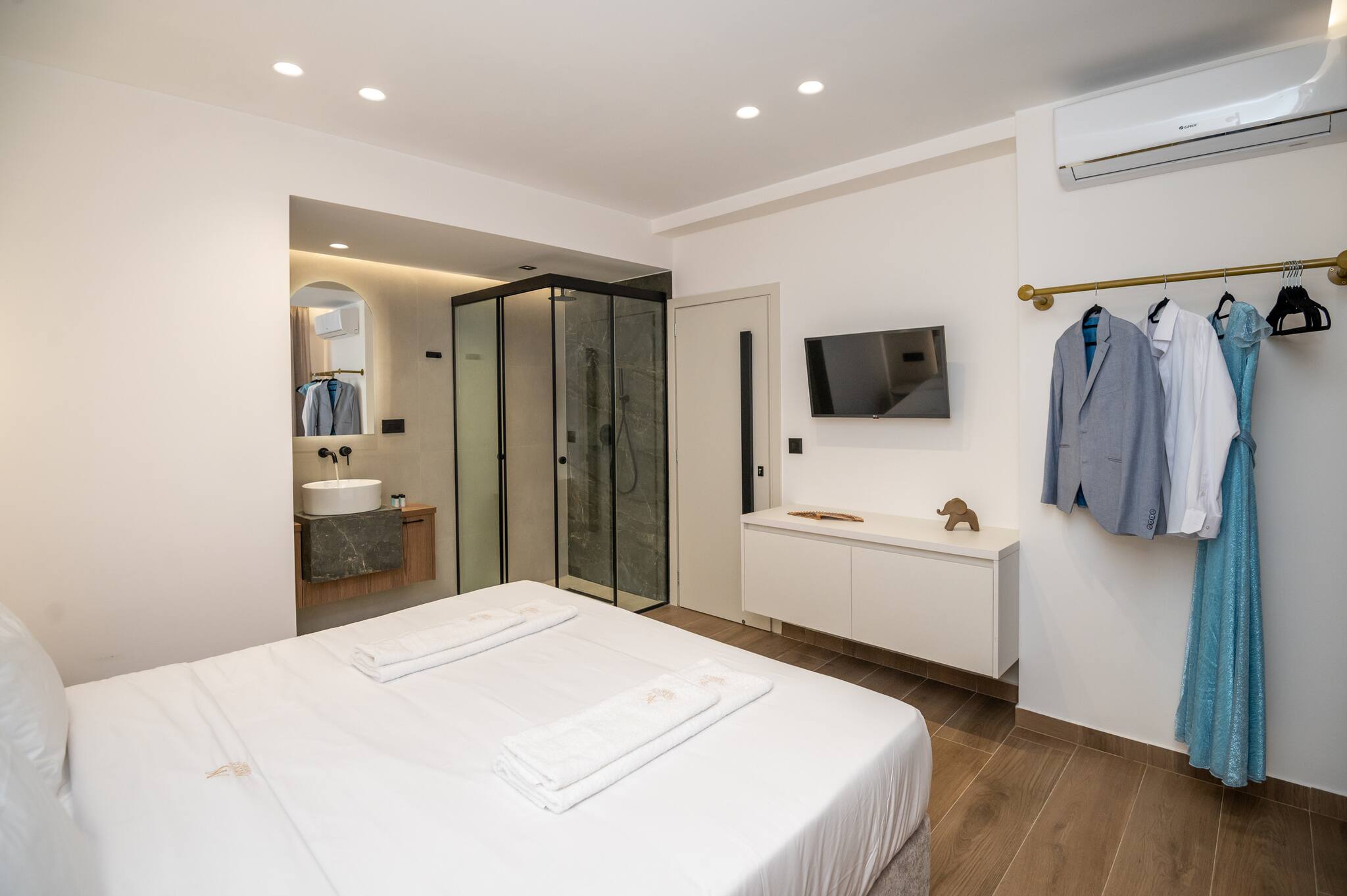 The villa features three elegantly designed bedrooms, each one a peaceful retreat. All bedrooms are equipped with high-quality linens, beautiful décor, blackout curtains, and sea views, ensuring that every guest feels pampered and relaxed. Each bedroom also includes a 32-inch smart TV with access to Greek and international channels. One of the bedrooms features a king-size bed (180x200) that can be converted into two single beds, while the other two bedrooms offer queen-size beds (160x200).