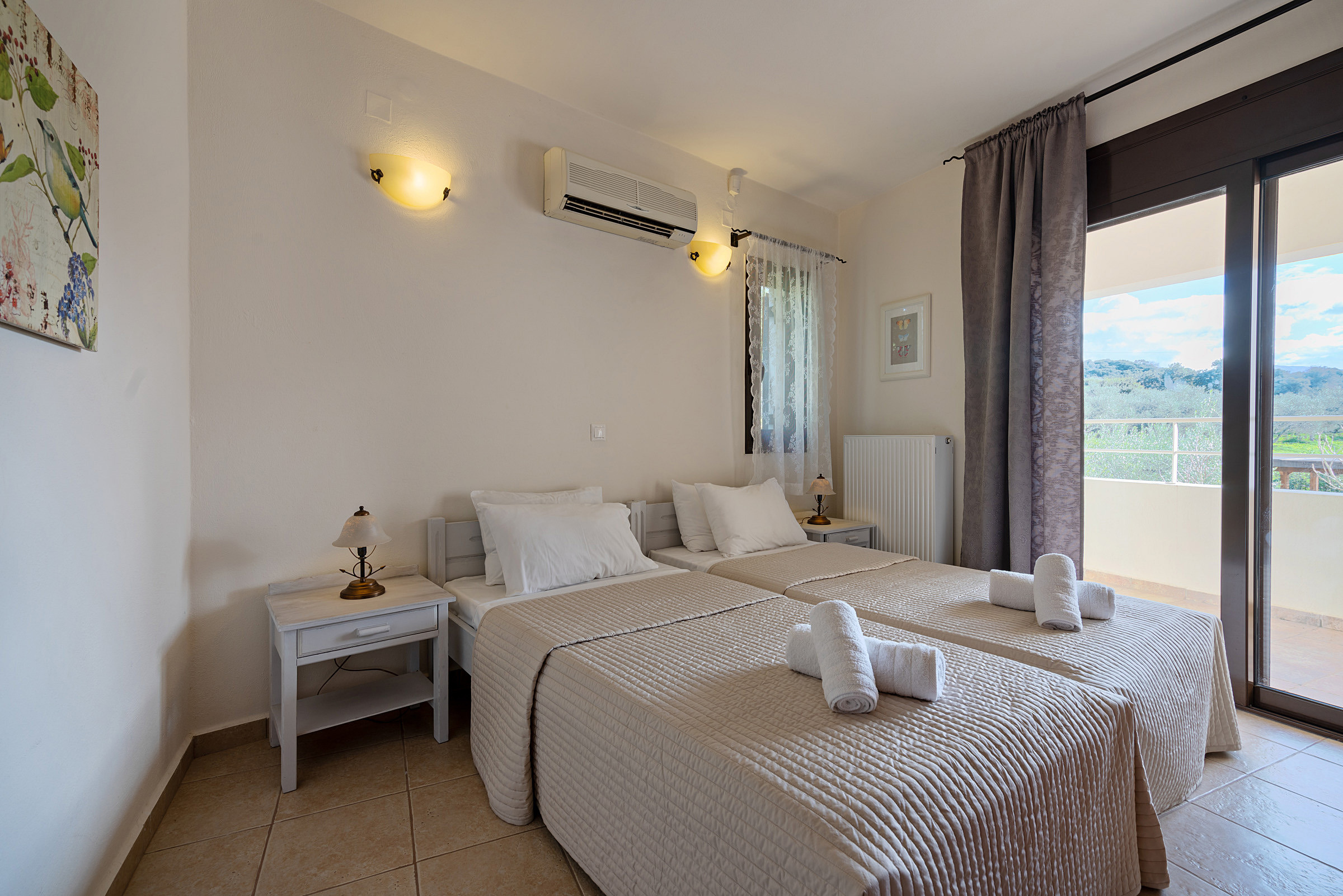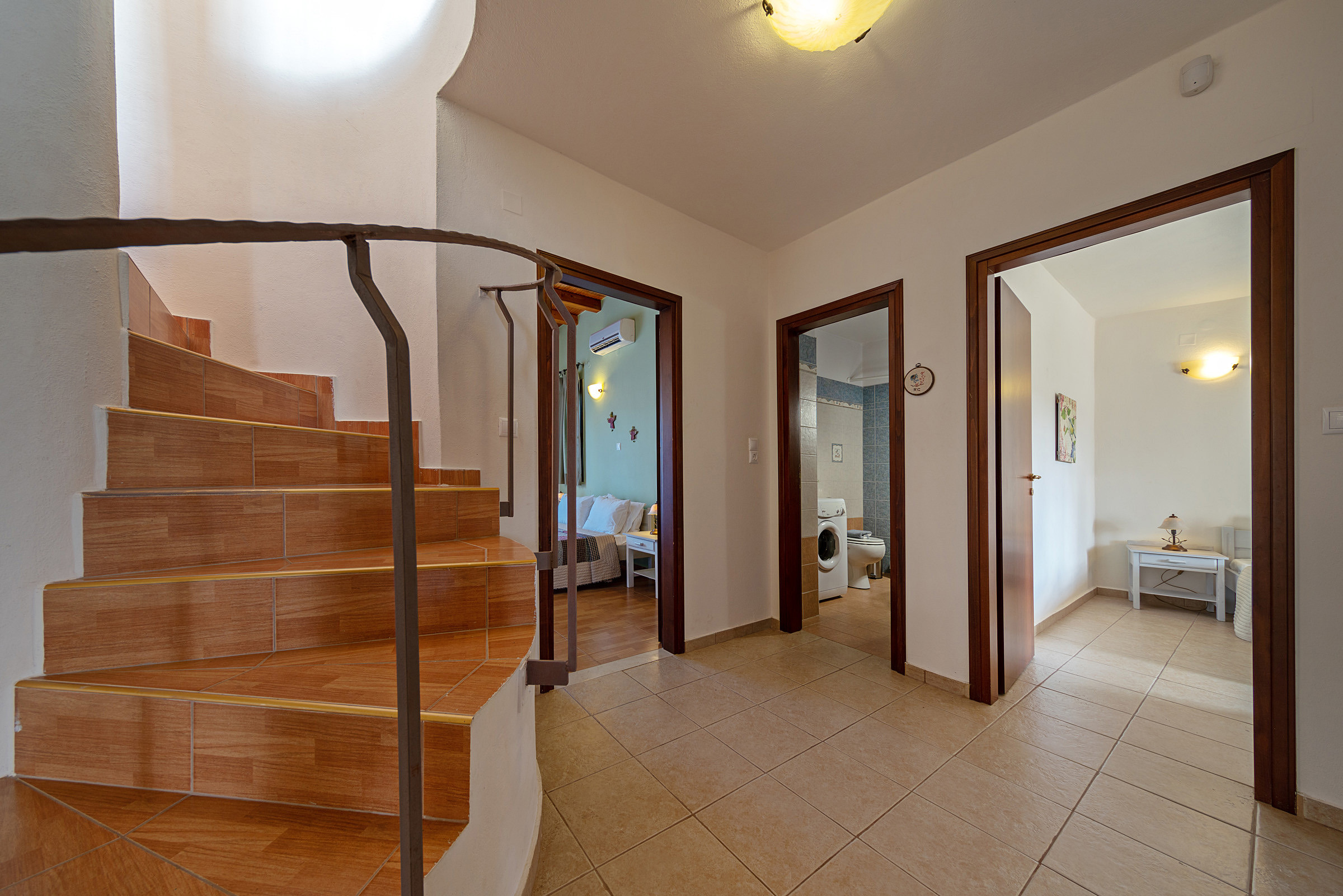 Villa Nostos comfortably accommodates up to 11 guests. On the ground floor, there are four bedrooms: one with a double bed and an en-suite bathroom, and three with twin beds (one of which can be converted into a double bedroom). There is also a guest bathroom and a separate shower room. The large living area, fully equipped kitchen, and dining space provide the perfect setting for shared meals and gatherings. Each bedroom opens onto a private balcony with lovely views.