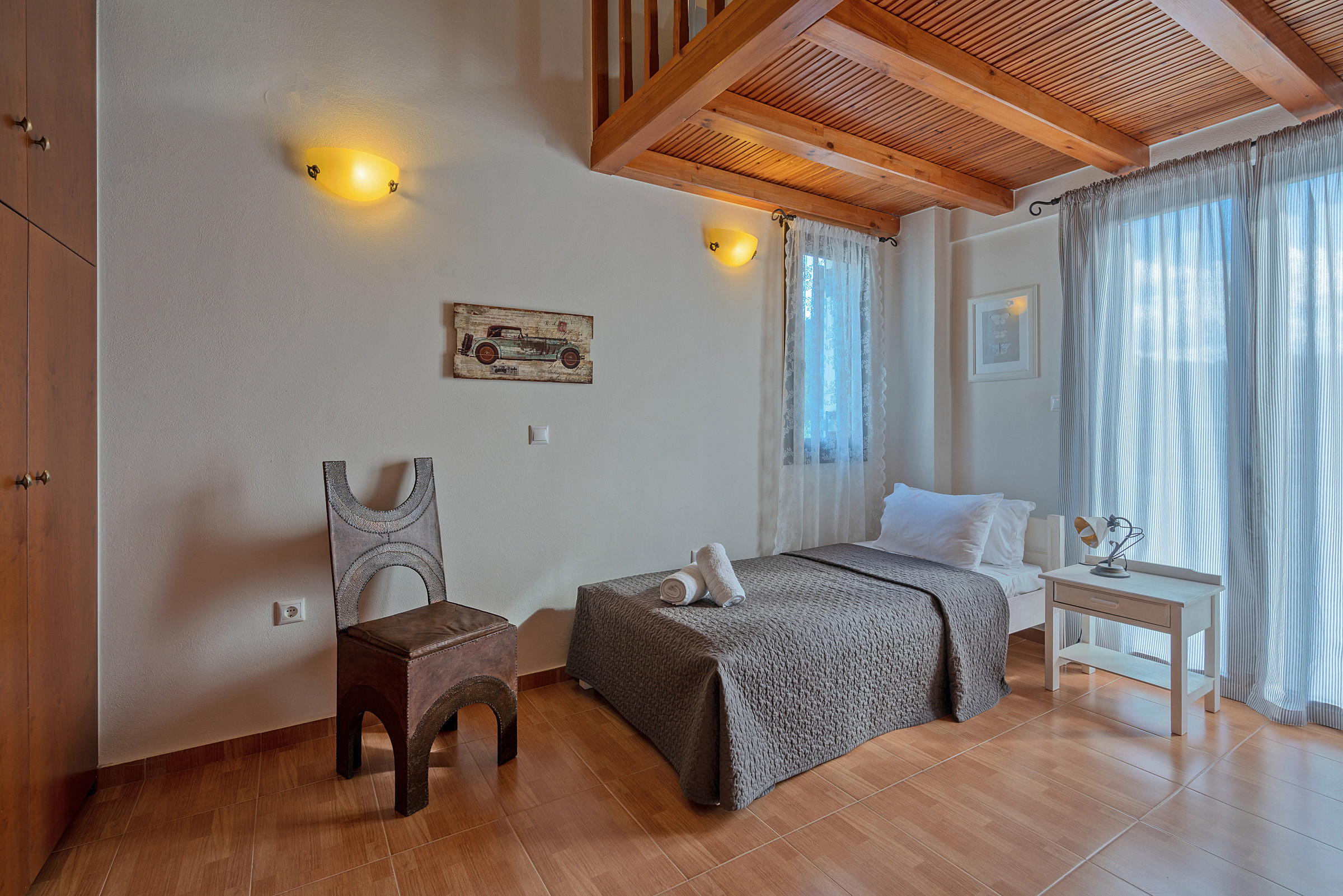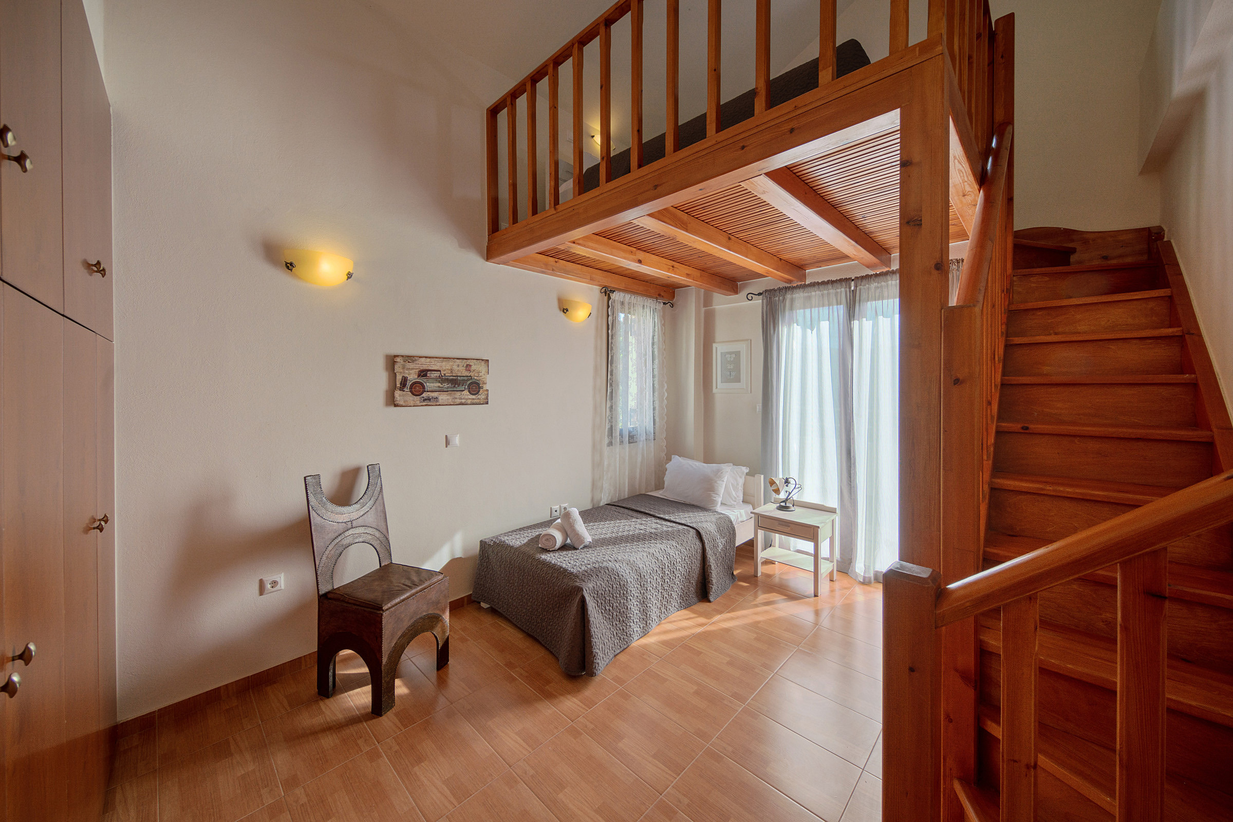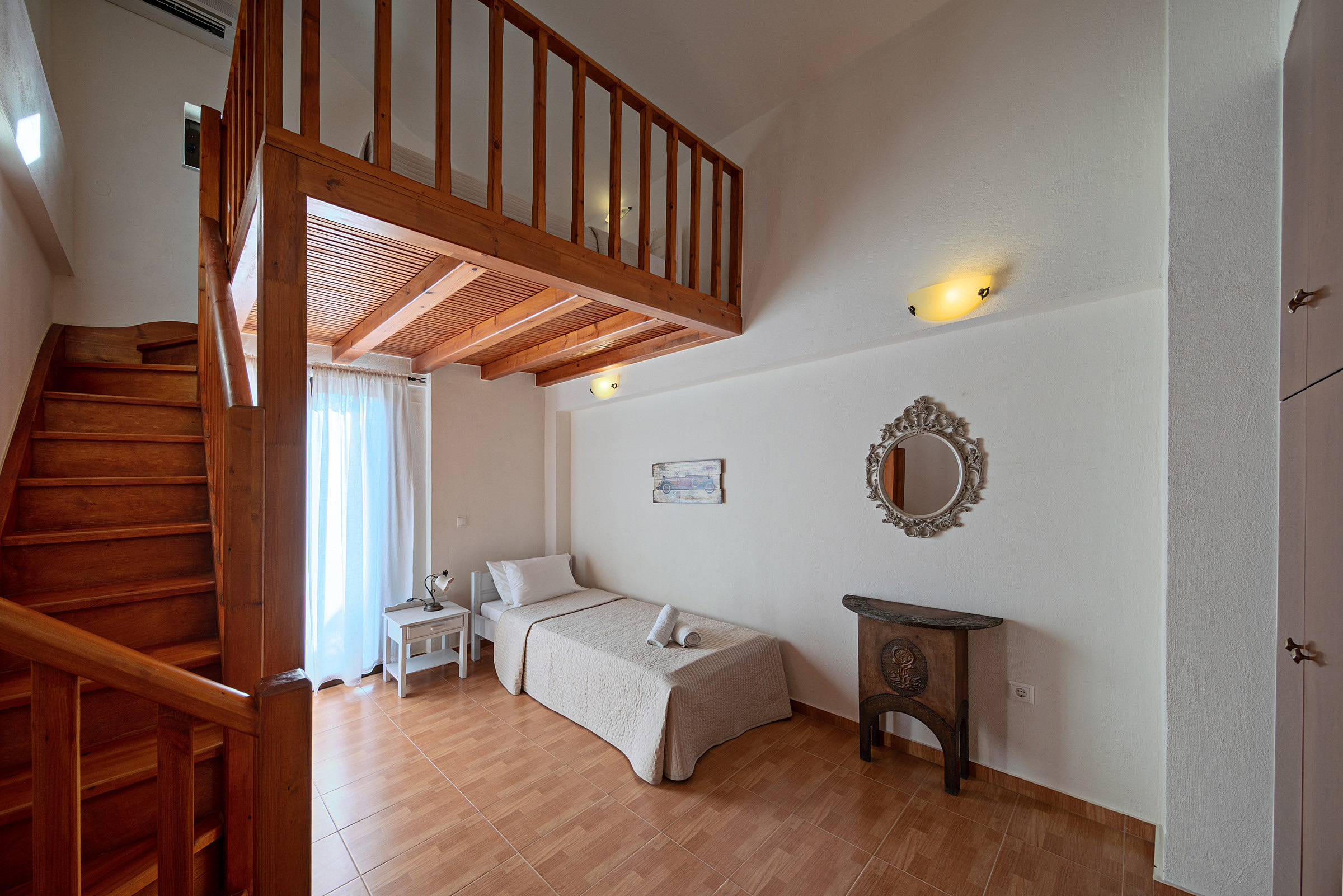 On the first floor, you will find an open-plan space featuring a double bed and an additional balcony. An extra guest can be accommodated comfortably on a folding or air bed.