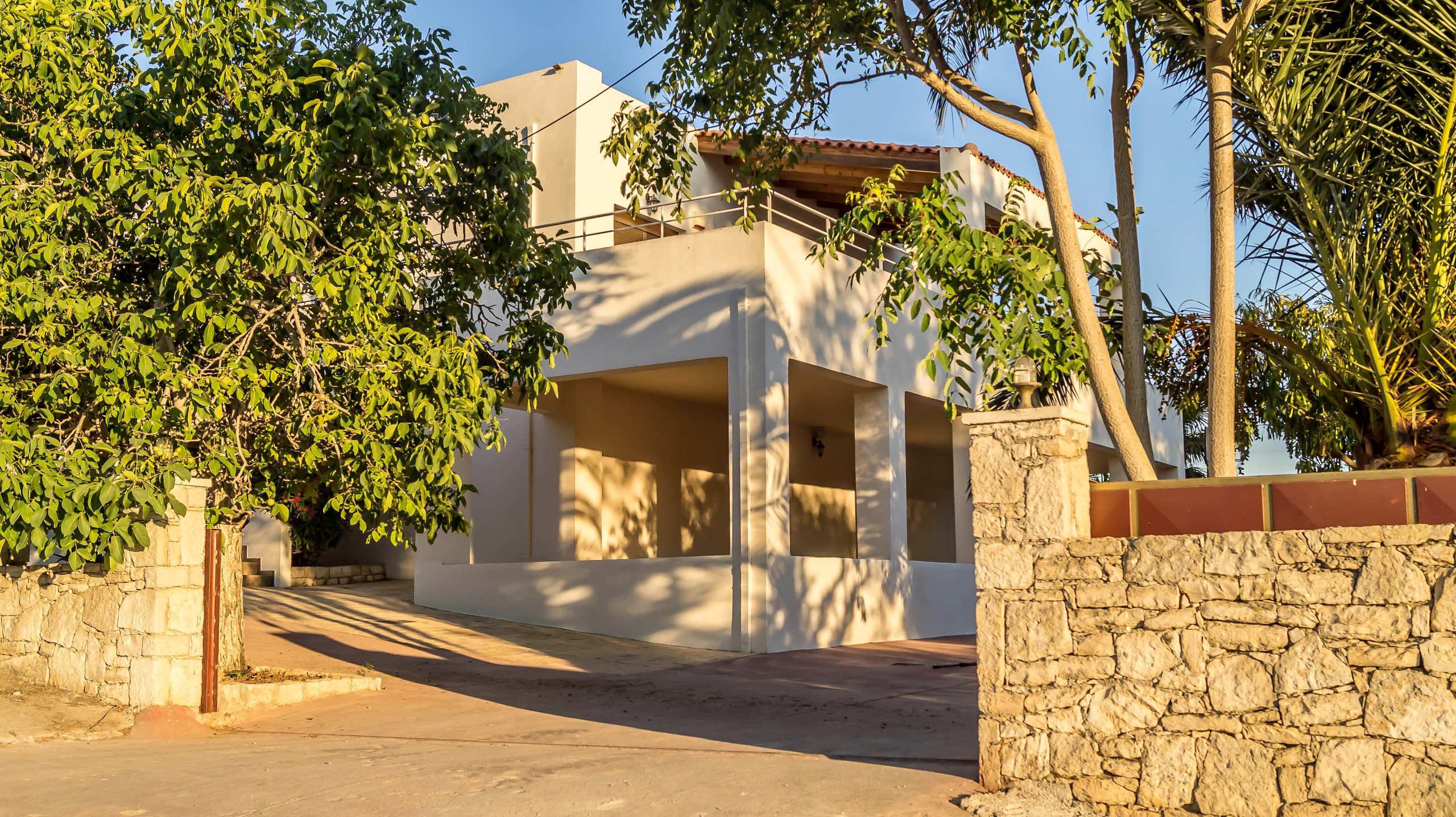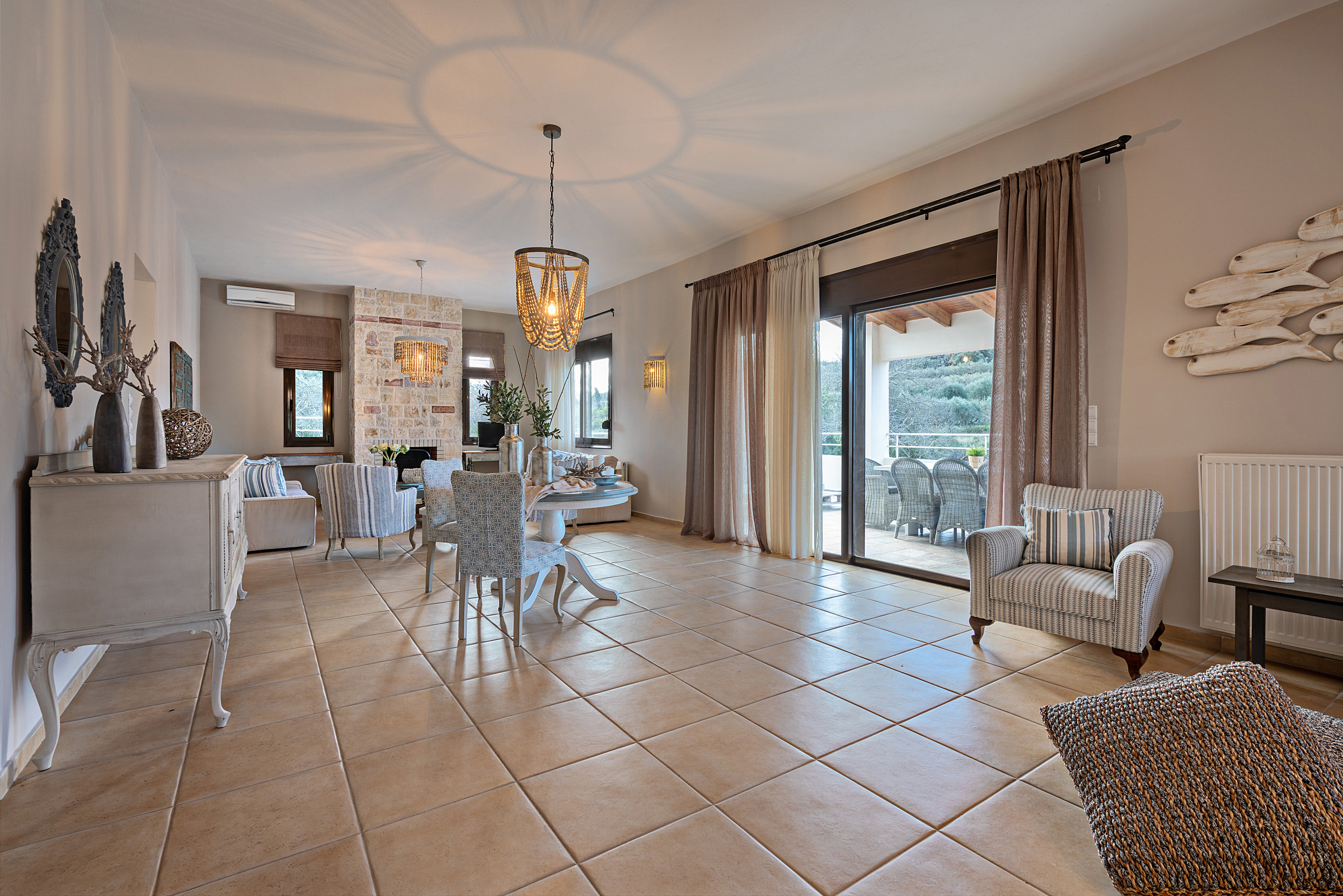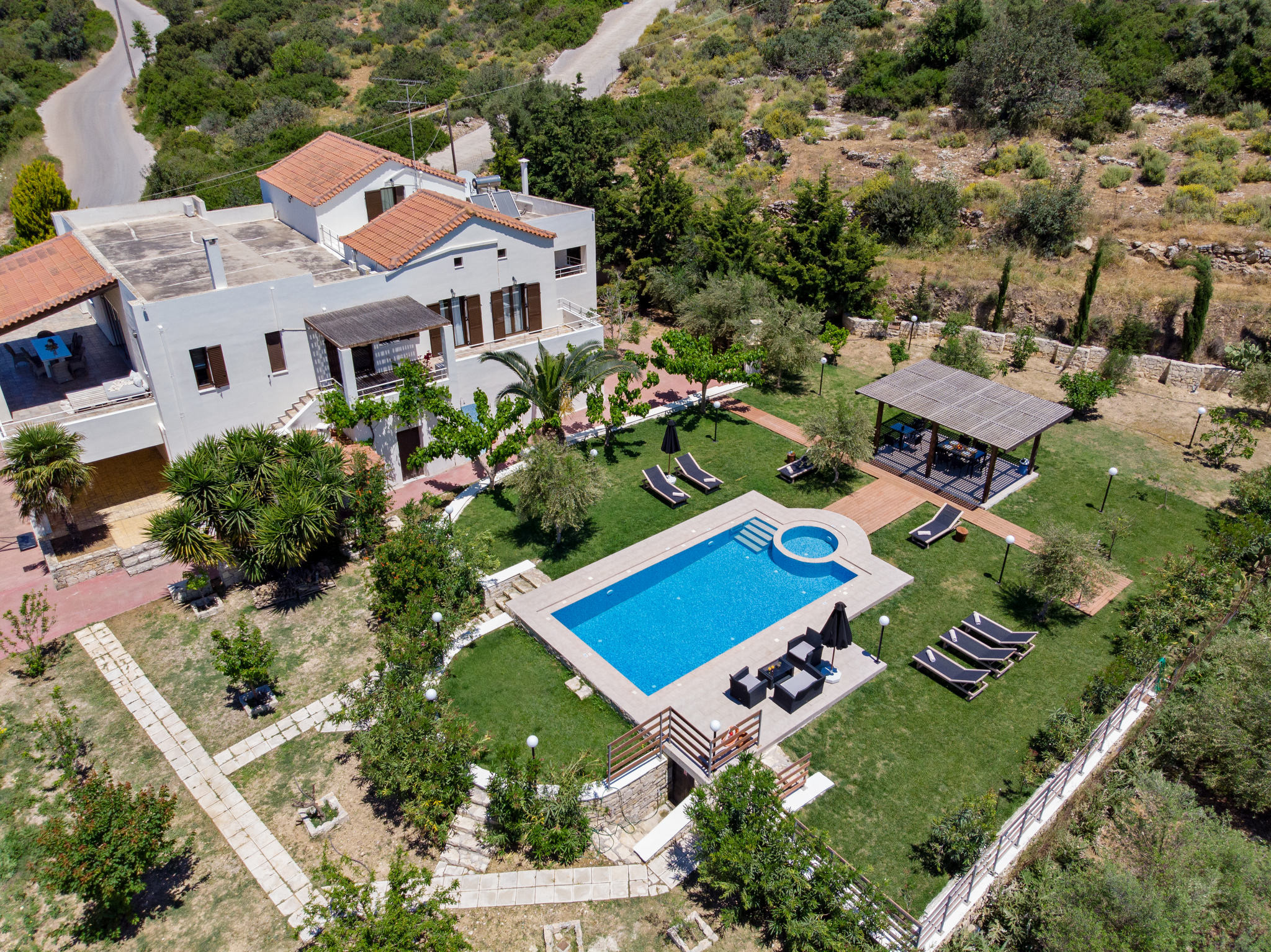 The villa’s expansive outdoor areas are a true highlight. With multiple terraces, a generous lounge area, a shaded outdoor dining space, a welcoming swimming pool, and barbecue facilities, Villa Nostos offers endless opportunities to relax, socialize, and enjoy outdoor living. Set on four acres of land, the property ensures complete privacy and ample space for everyone to unwind.
