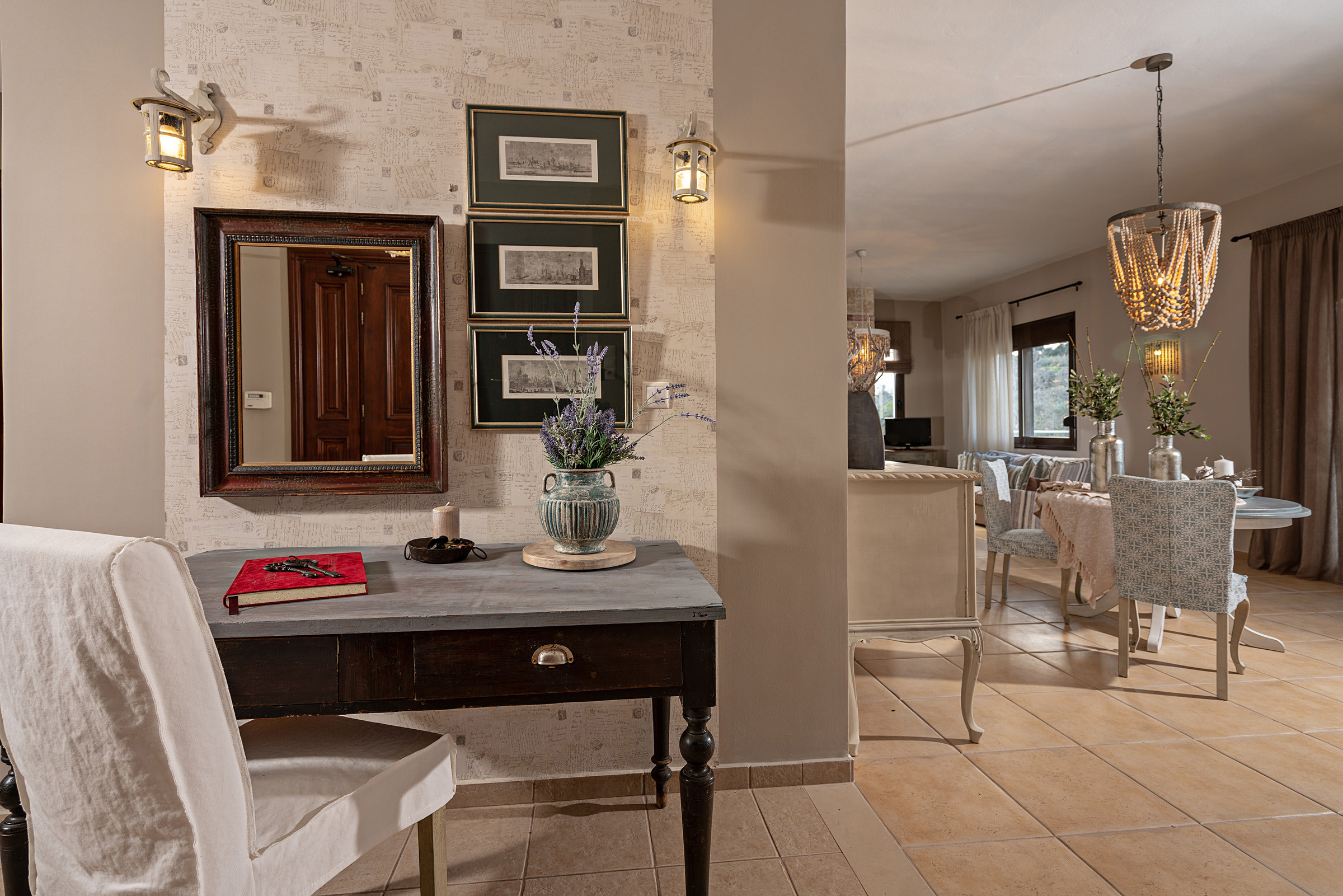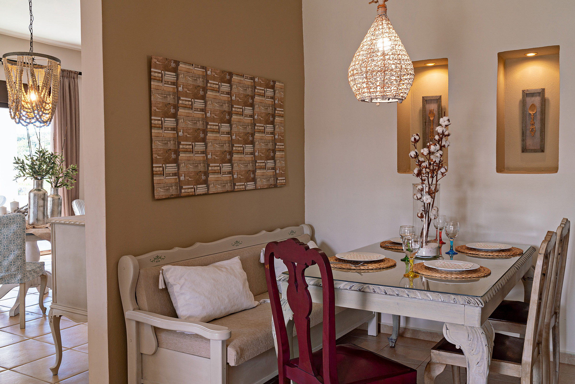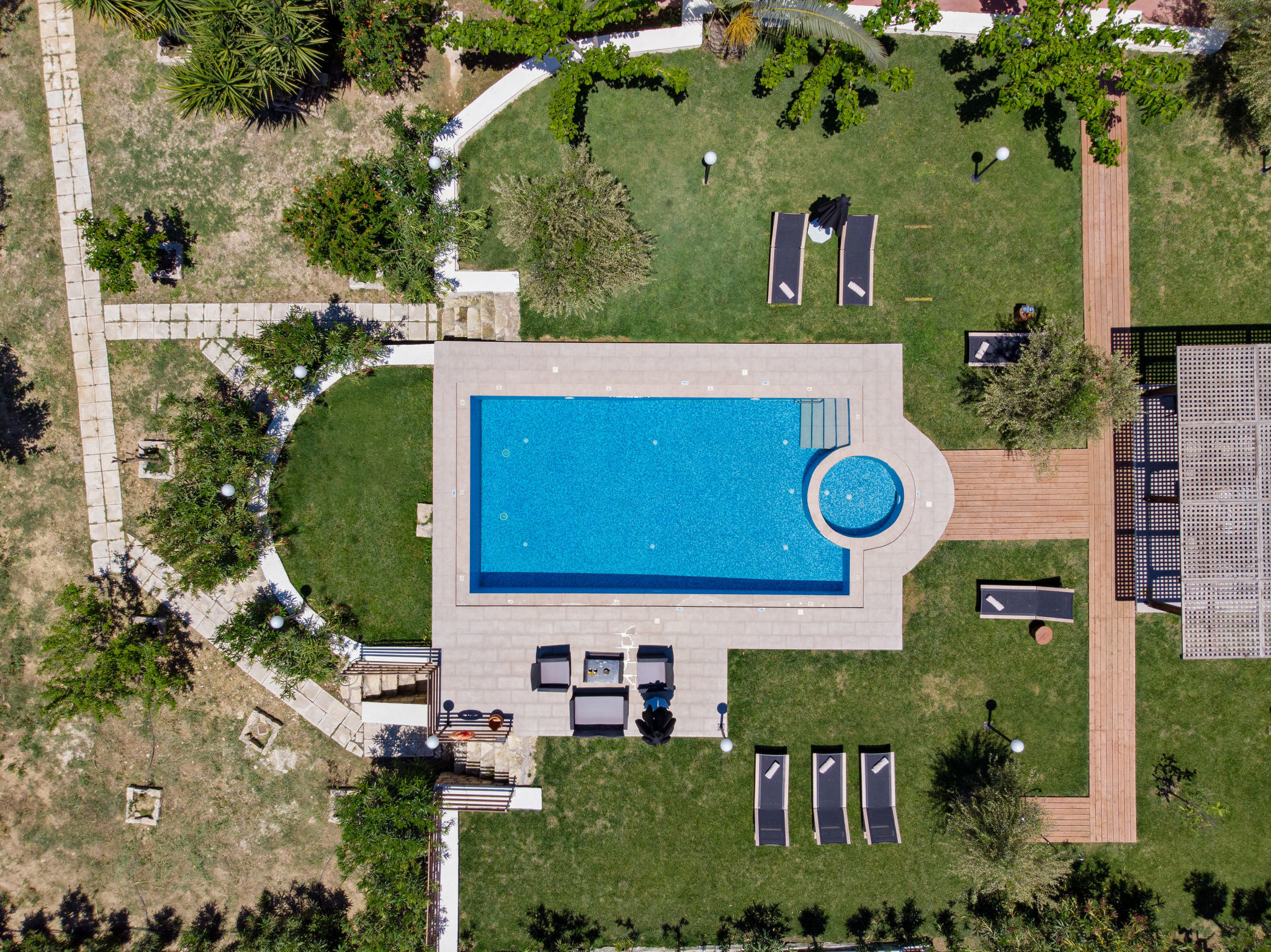 The villa’s expansive outdoor areas are a true highlight. With multiple terraces, a generous lounge area, a shaded outdoor dining space, a welcoming swimming pool, and barbecue facilities, Villa Nostos offers endless opportunities to relax, socialize, and enjoy outdoor living. Set on four acres of land, the property ensures complete privacy and ample space for everyone to unwind.