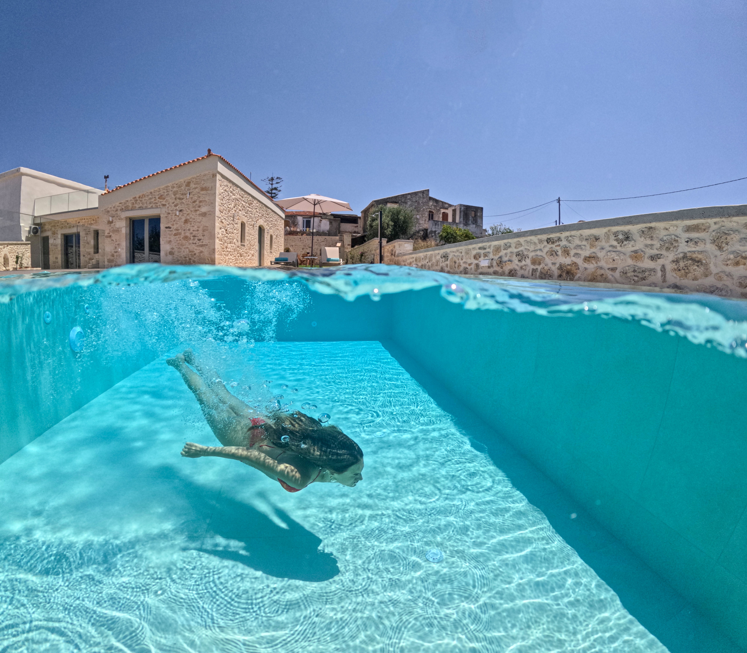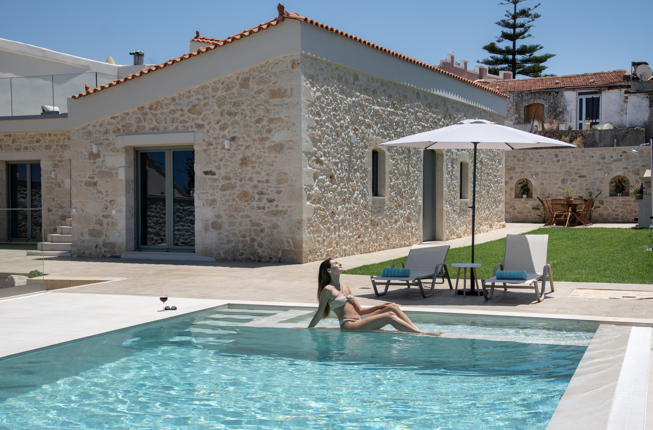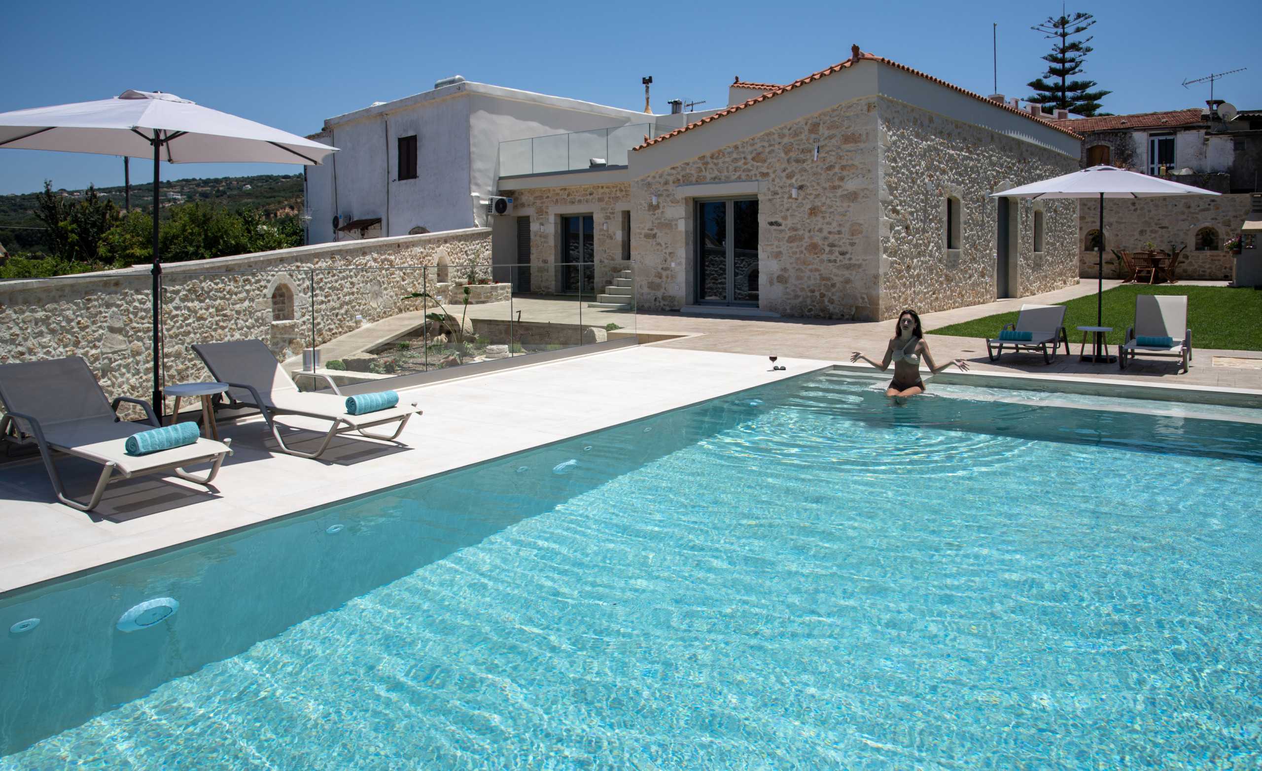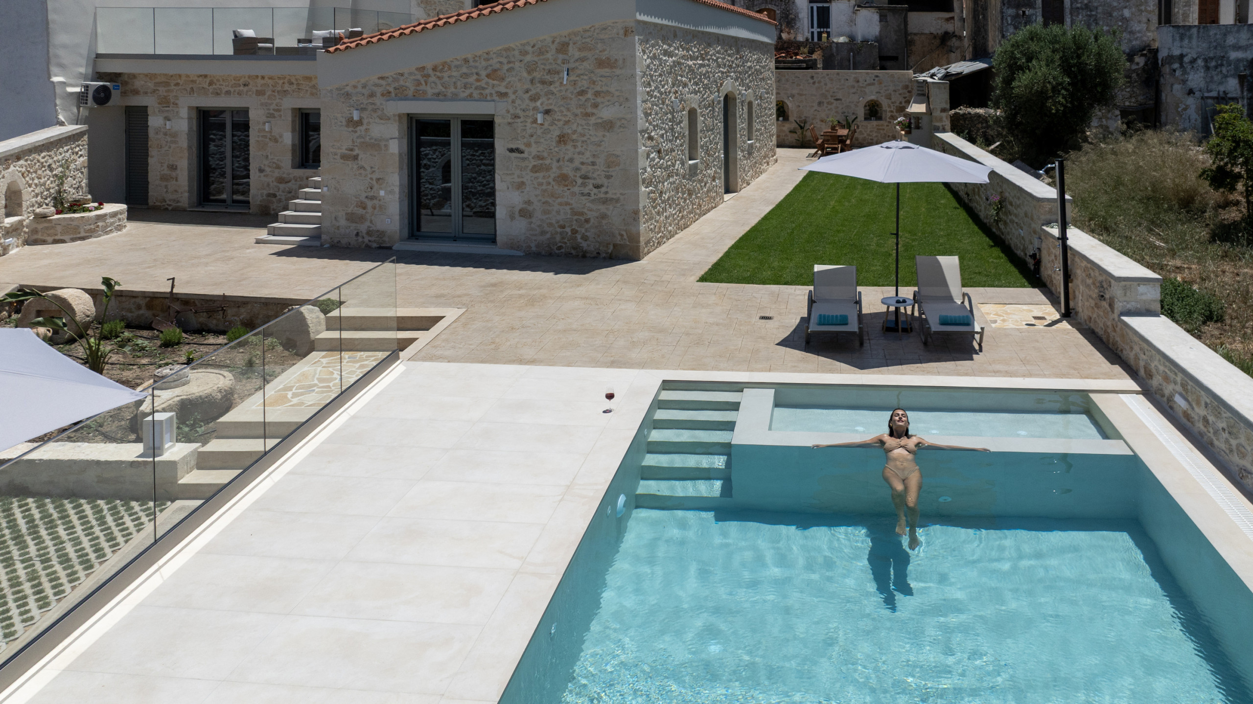Unwind by the 9.3 × 4.5 m pool (1.5 m deep) and the adjoining children’s pool, both offering panoramic sea views and surrounded by the serene Cretan landscape. The pool area is equipped with 10 sunbeds and 5 umbrellas, providing ample space for all guests to relax comfortably under the Cretan sun. Enjoy peaceful evenings dining alfresco by the charcoal BBQ, stargazing under clear night skies, and embracing the quiet, relaxing atmosphere that makes Fabrica Villa a true sanctuary.