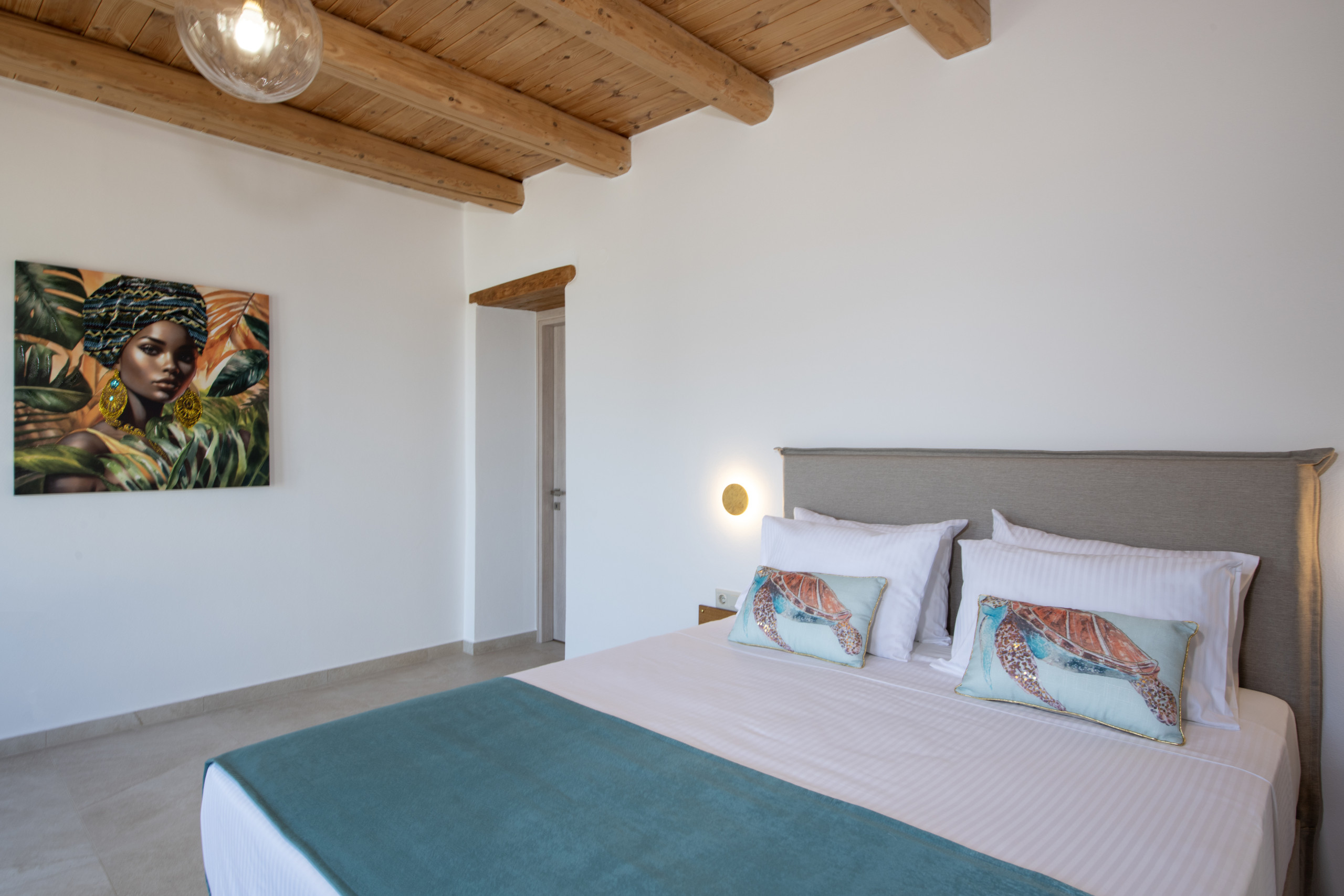 The villa features four spacious bedrooms, each with its own en suite bathroom, shower, air conditioning, Wi-Fi, hairdryer, and TV. One bedroom has a queen-size bed (160x200) and a sofa that can be converted into a double sofa-bed, another bedroom has a queen-size bed (160x200) and one single bed (90x200), a third bedroom has a queen-size bed (160x200), while the fourth bedroom features two twin beds (90x200) that can be joined into a king-size bed along with one more single bed (90x200). Two bedrooms connect directly to the open-plan living area, one upstairs has a private balcony with seating, and the fourth offers a separate entrance leading to the barbecue patio. Baby cots and highchairs are available for families.