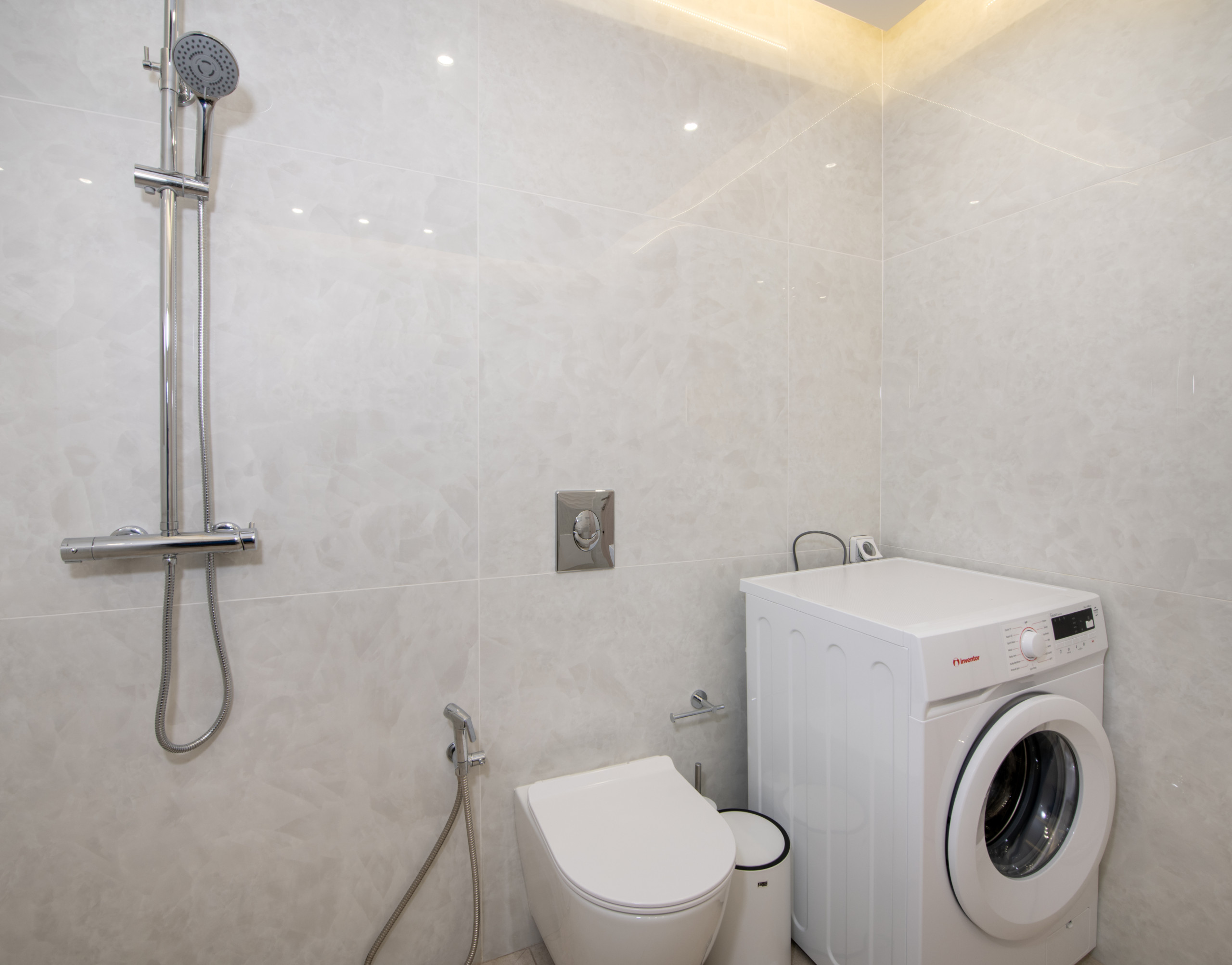 The open-plan lounge, equipped with a TV, combines comfort and style, while the fully equipped kitchen includes espresso and filter coffee machines, dishwasher, microwave, and an additional WC with a washing machine.