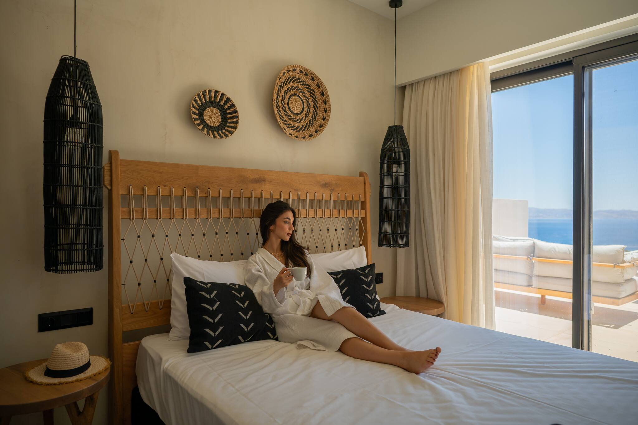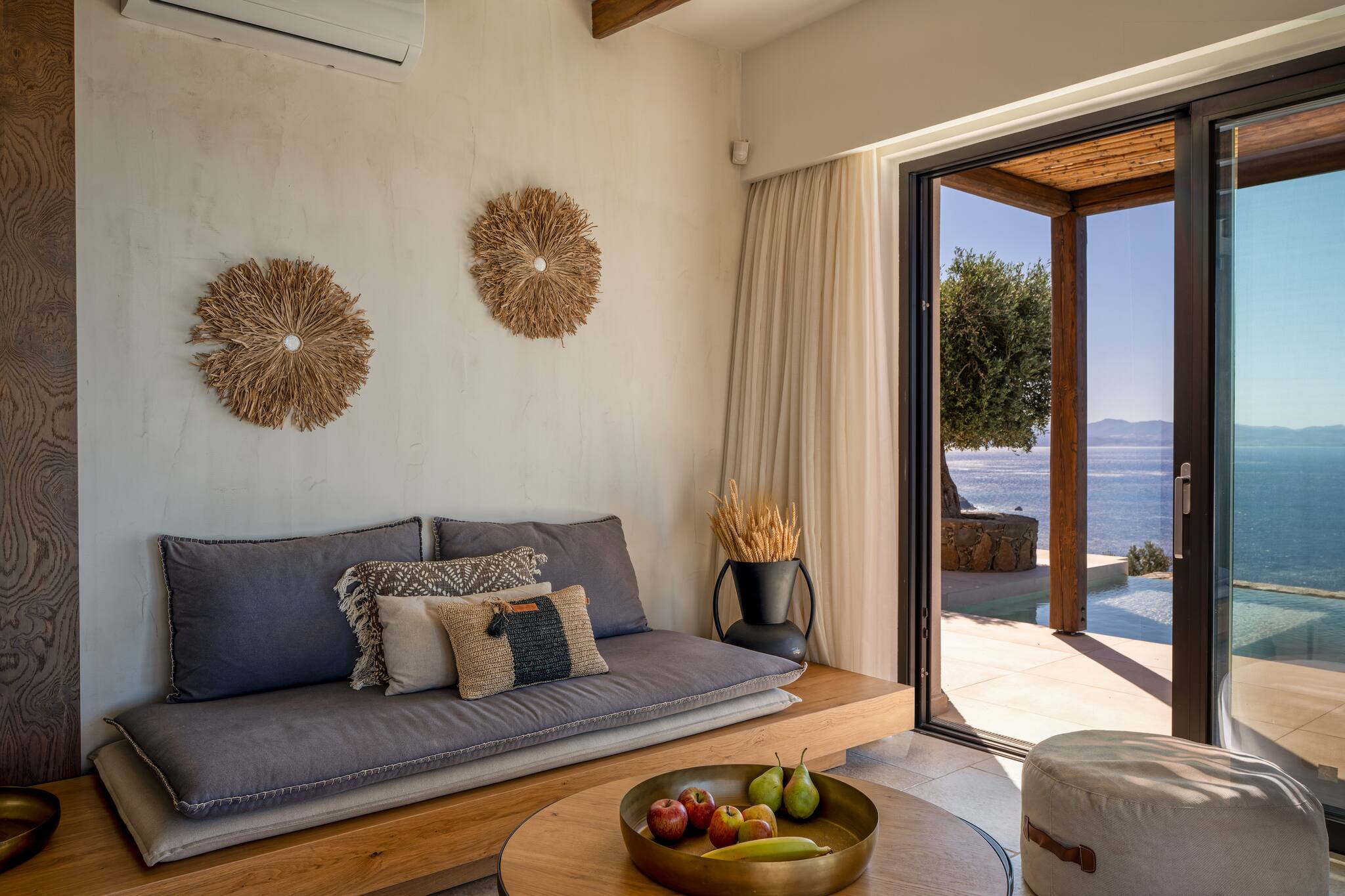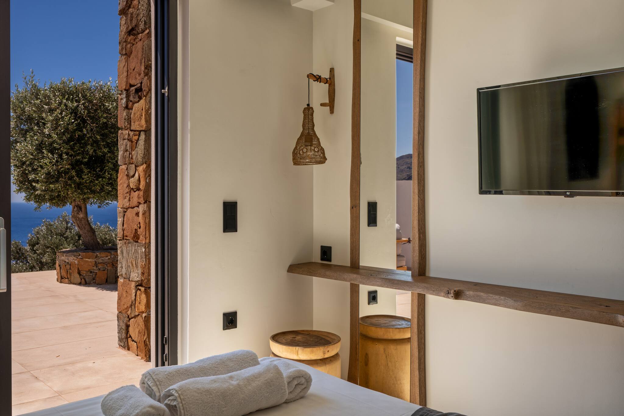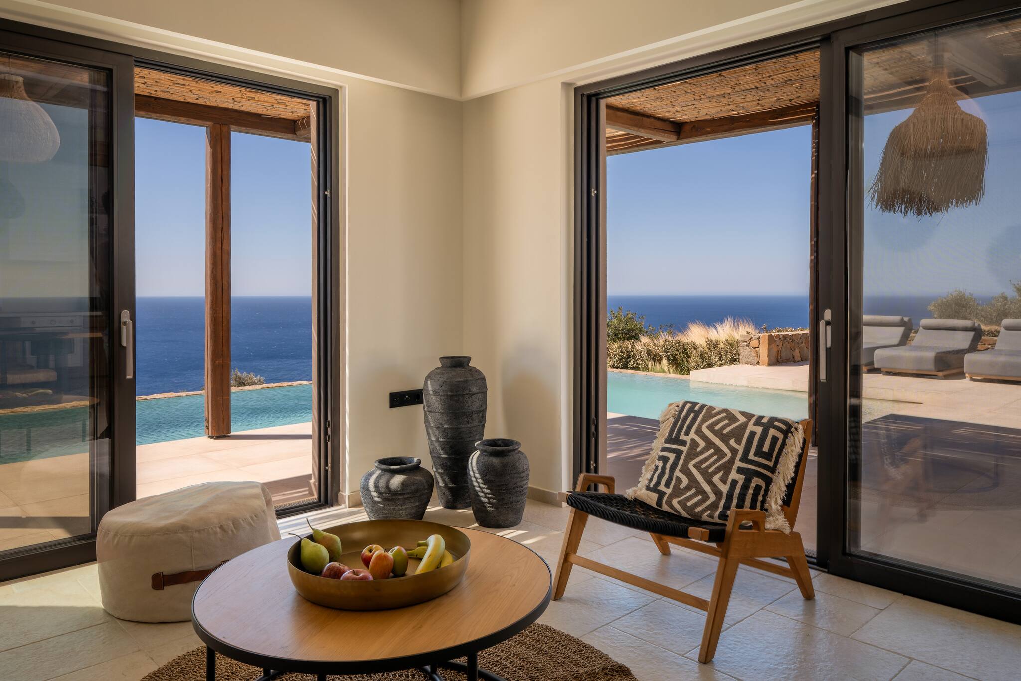 Thalassa Villa accommodates up to four guests and combines contemporary design with touches of Cretan tradition. The interior features a spacious living room with large windows framing the sea, seamlessly connected to a fully equipped open-plan kitchen and dining area. The villa has two double bedrooms and two bathrooms, thoughtfully designed for comfort and privacy.