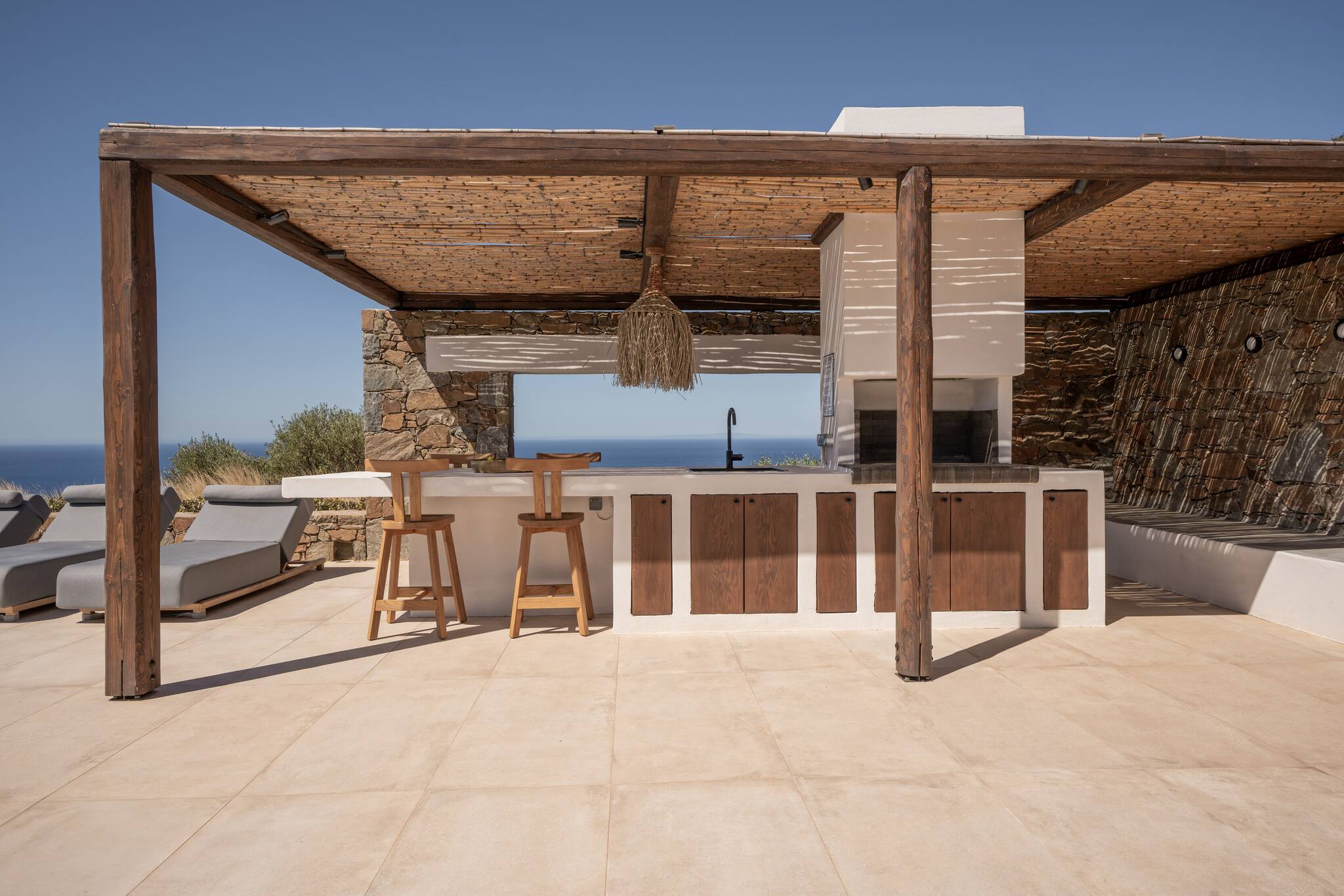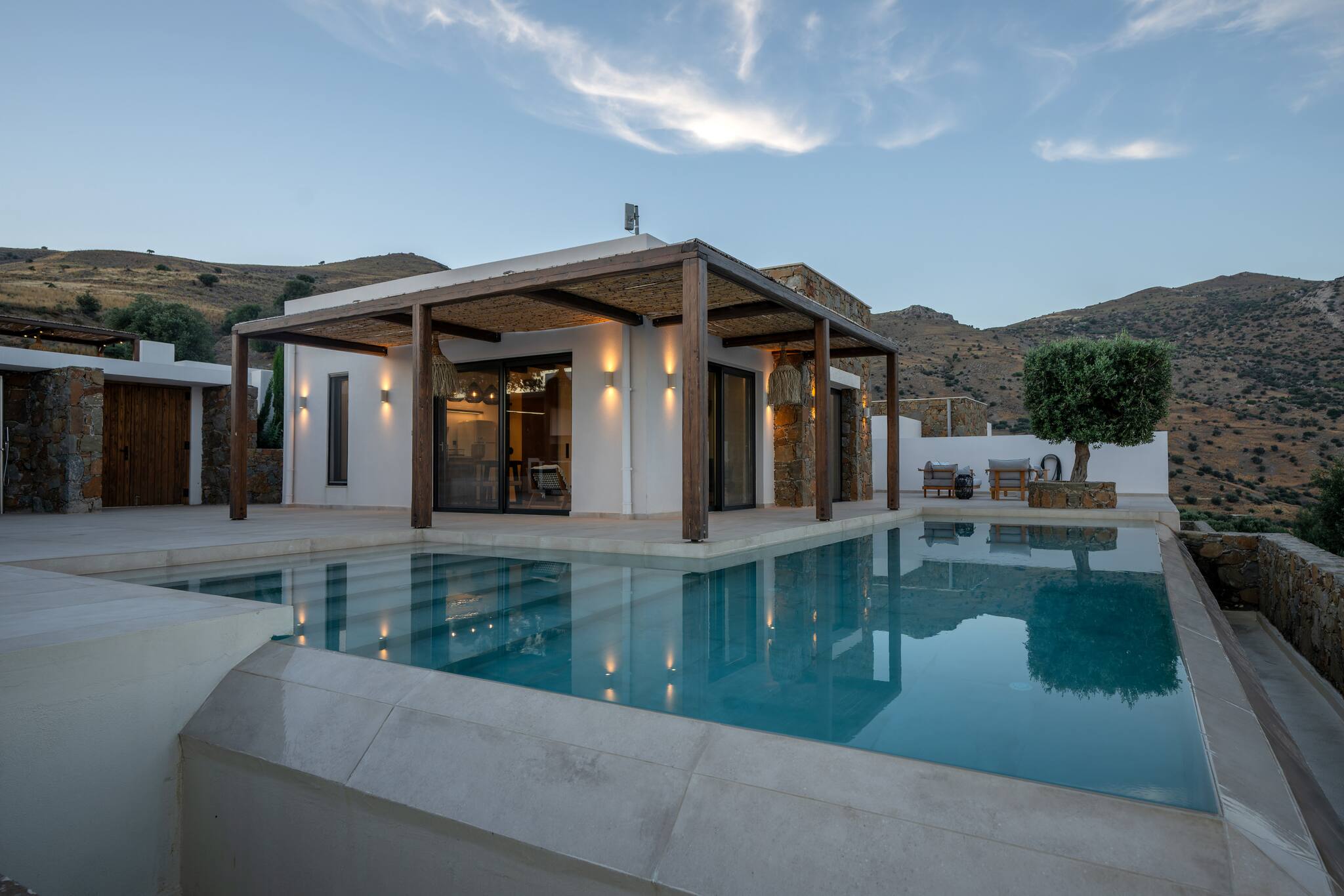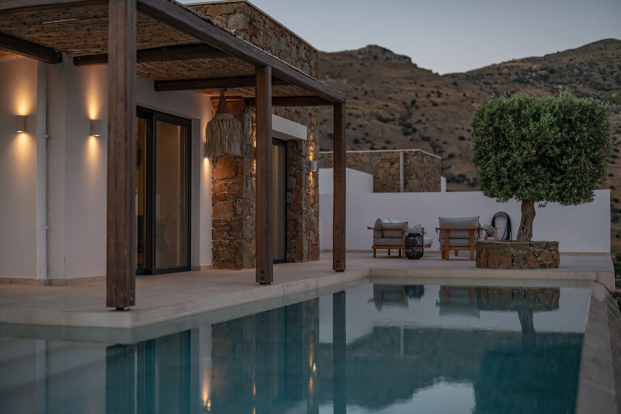 Outdoors, the private pool is surrounded by sunbeds and lounge areas, while a terrace with a dining table and electric grill provides the perfect setting for alfresco meals. Indoor and outdoor spaces flow seamlessly, allowing guests to fully enjoy the Cretan lifestyle.