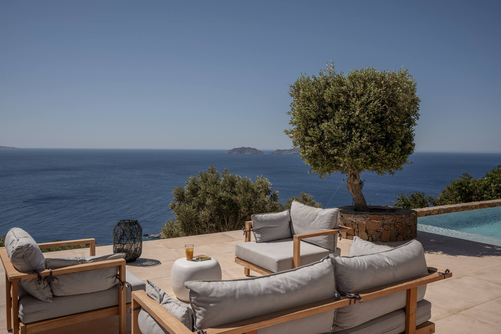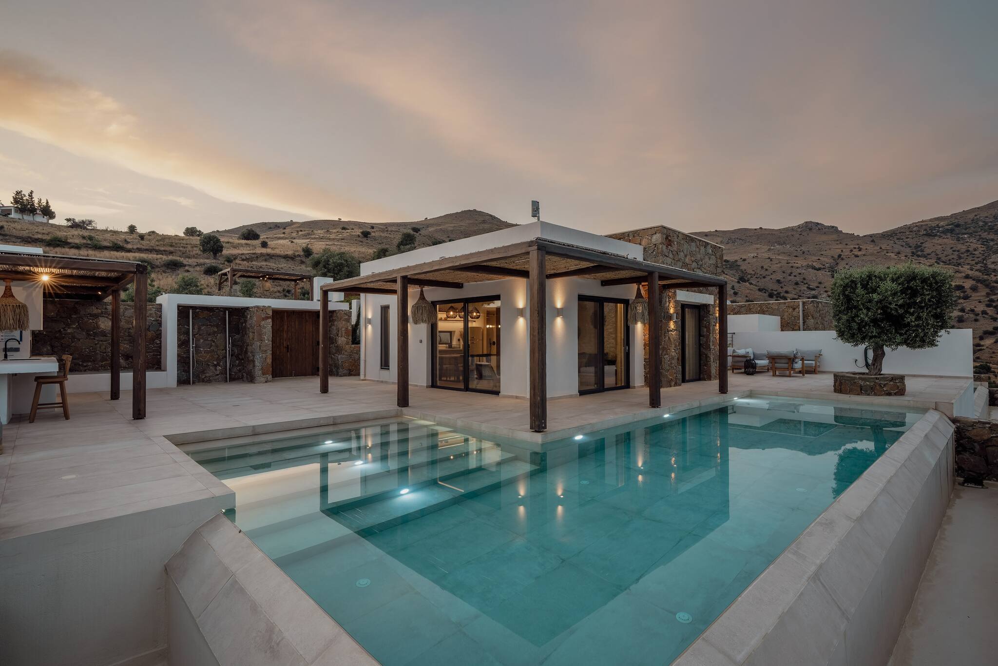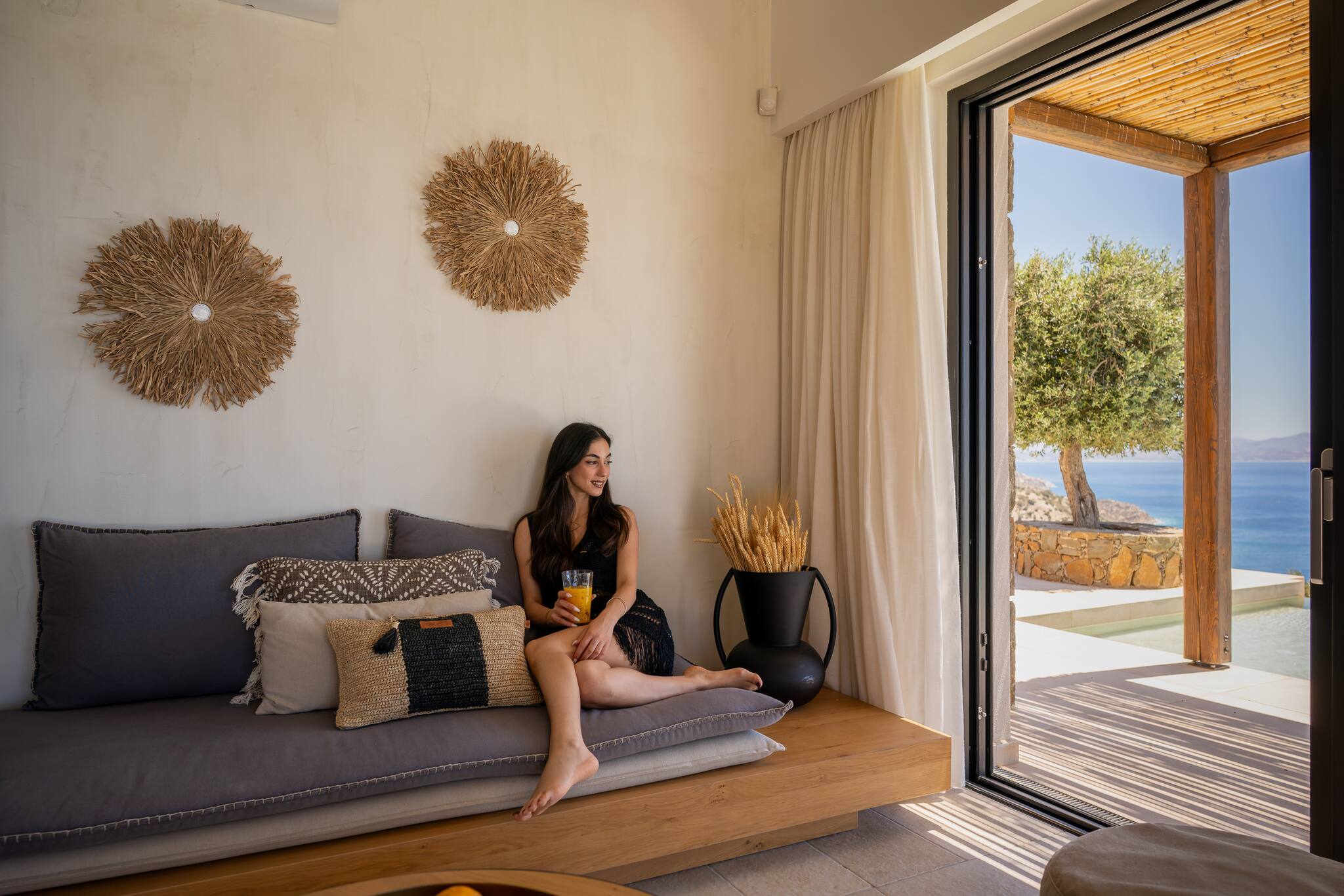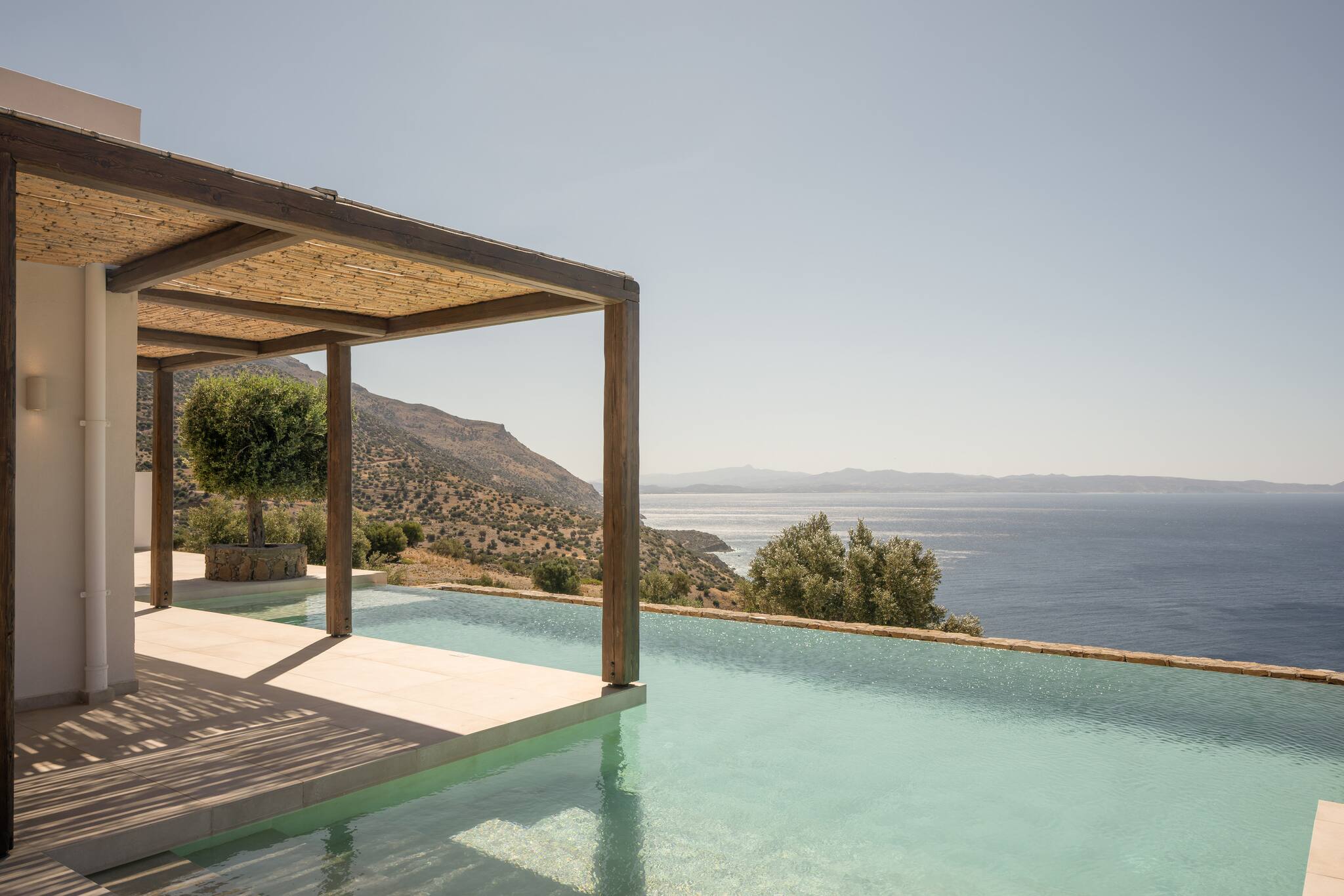 Outdoors, the private pool is surrounded by sunbeds and lounge areas, while a terrace with a dining table and electric grill provides the perfect setting for alfresco meals. Indoor and outdoor spaces flow seamlessly, allowing guests to fully enjoy the Cretan lifestyle.