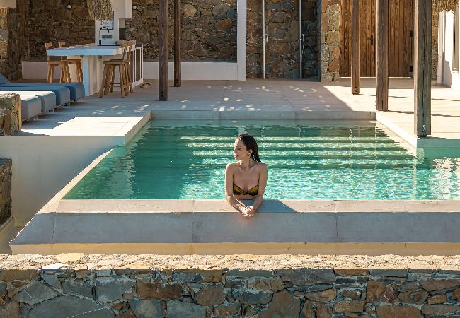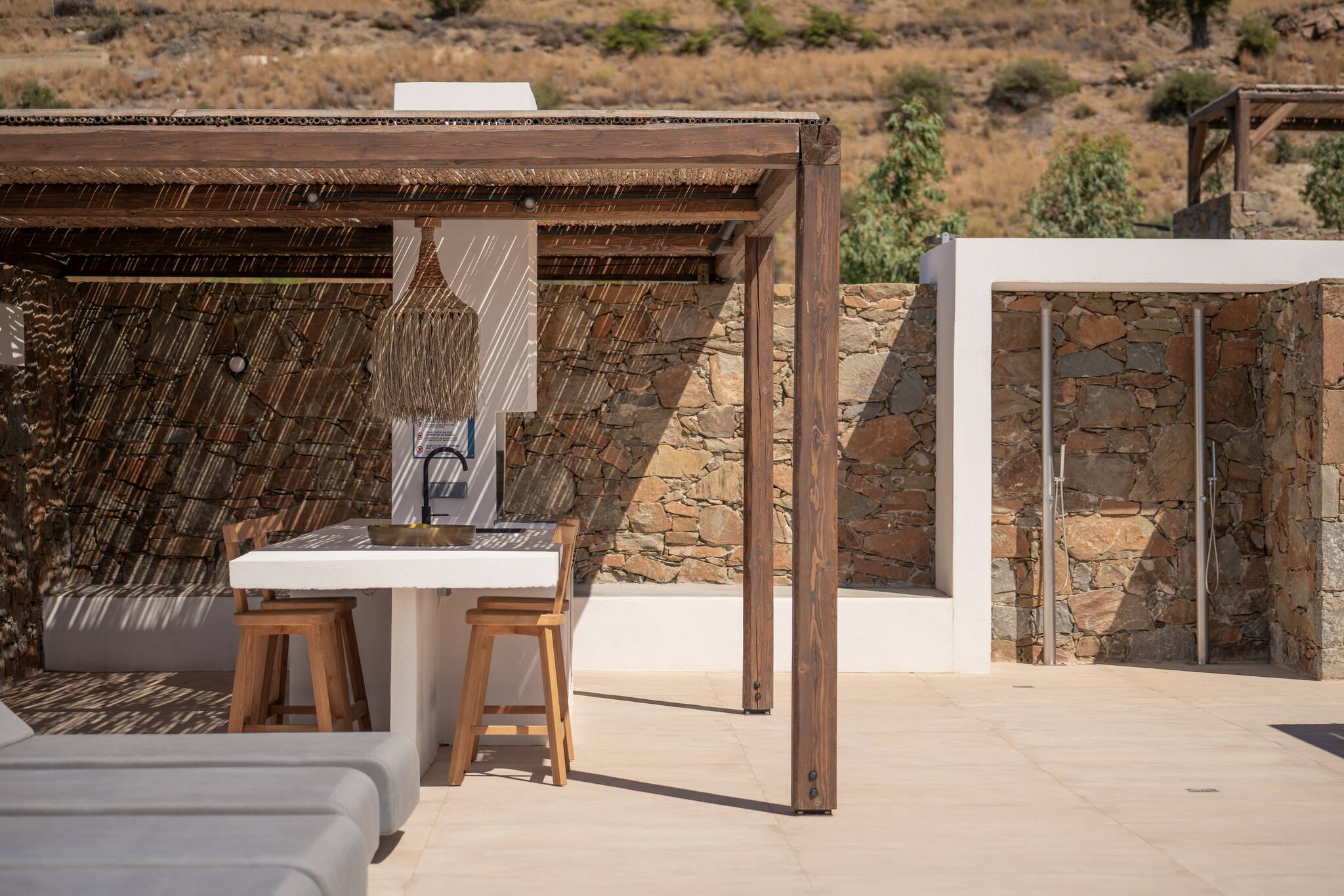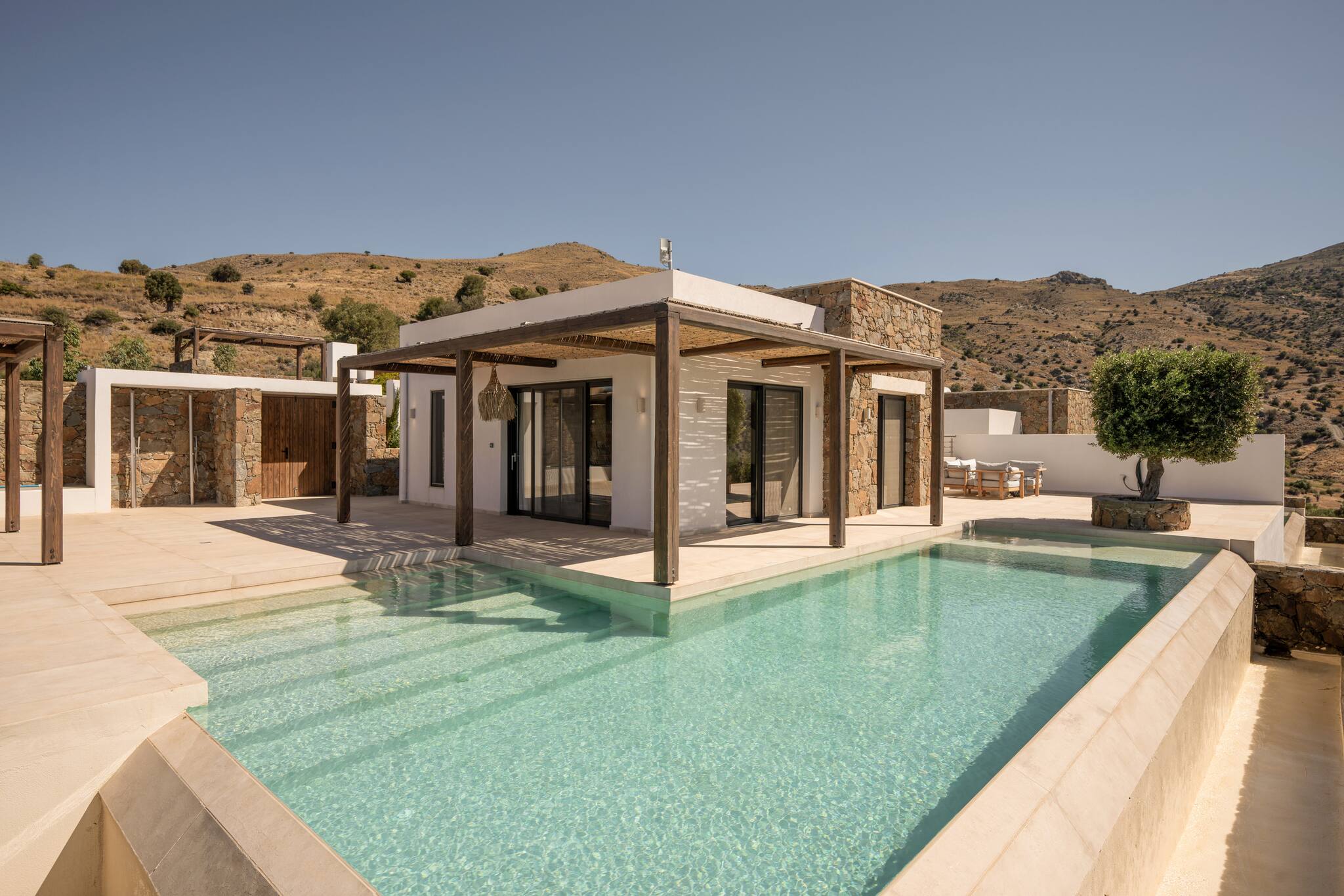 Ammos Villa accommodates up to four guests, blending modern design with subtle traditional touches. The villa features a light-filled open-plan living area, a fully equipped kitchen, and a dining space. There are two double bedrooms and two bathrooms, all thoughtfully designed for comfort and privacy.
