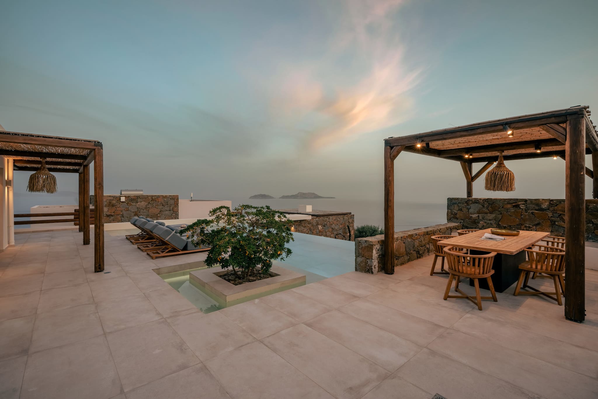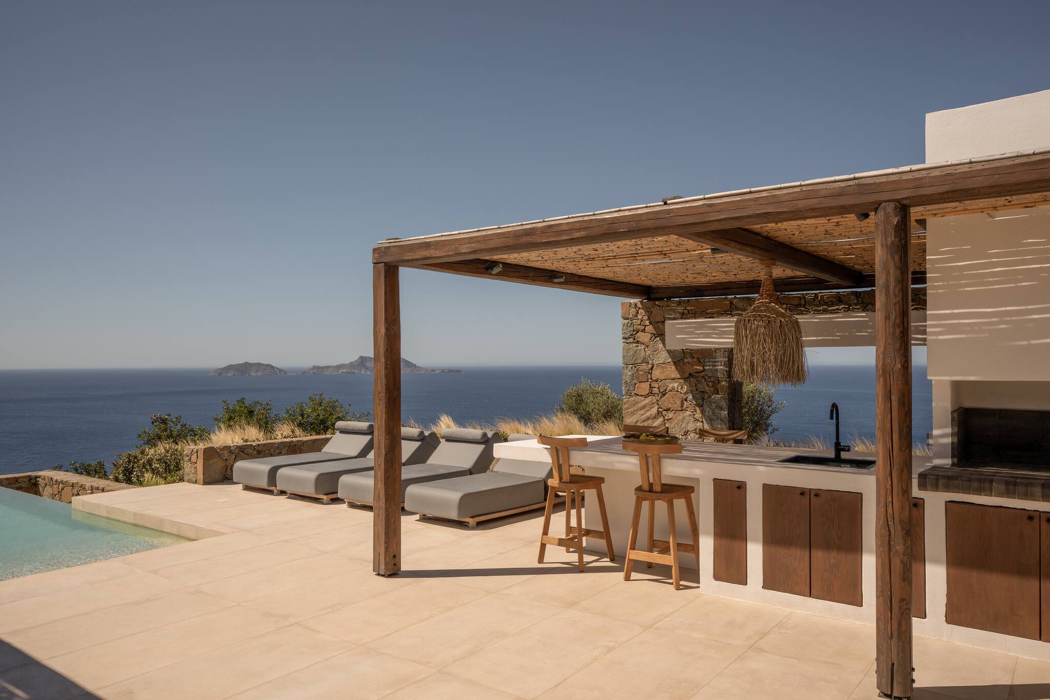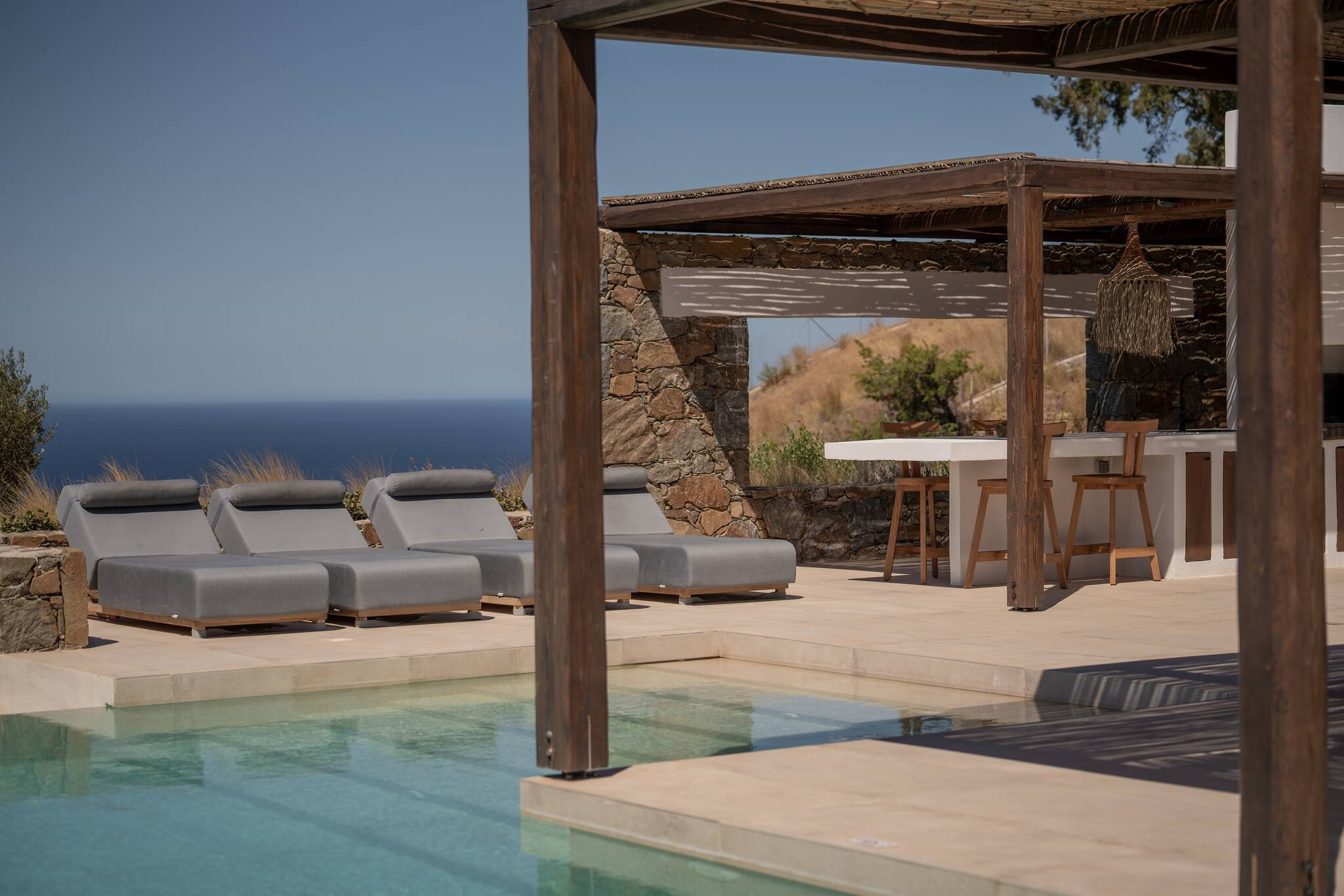 Each villa features a private pool, spacious terraces, and expansive verandas with sea views. The pool area includes sunbeds, lounge spots, a large dining table, and an electric grill, perfect for alfresco meals and social gatherings. Indoor and outdoor spaces flow seamlessly, creating an immersive Mediterranean living experience.