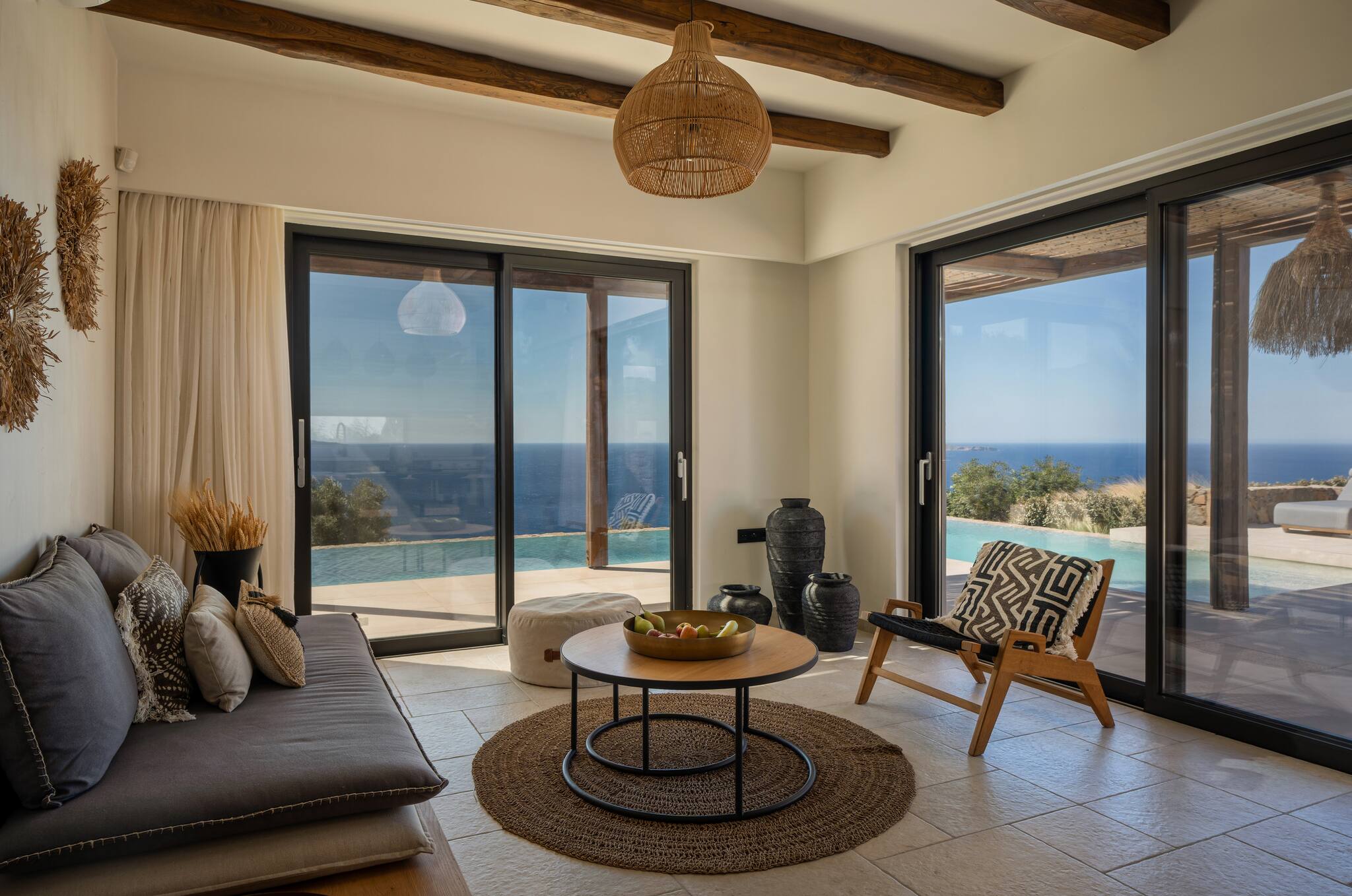 Ilios Villa accommodates up to 6 guests with 3 double bedrooms and 2 bathrooms. Ammos Villa is ideal for 4 guests, featuring 2 double bedrooms and 2 bathrooms. Both villas offer spacious, fully furnished living areas, modern fully equipped kitchens, and open dining areas. Large windows frame stunning sea views throughout the interiors.