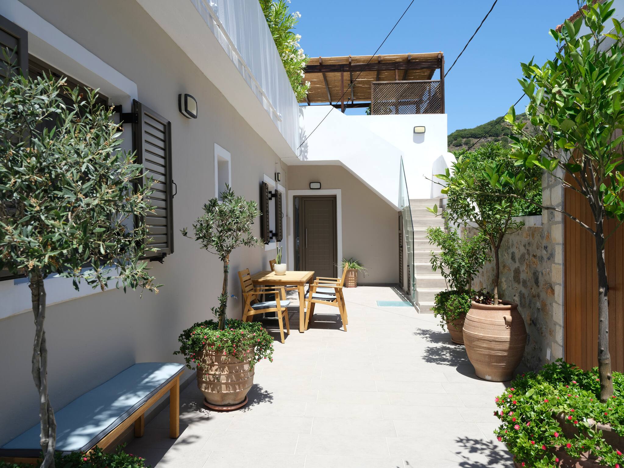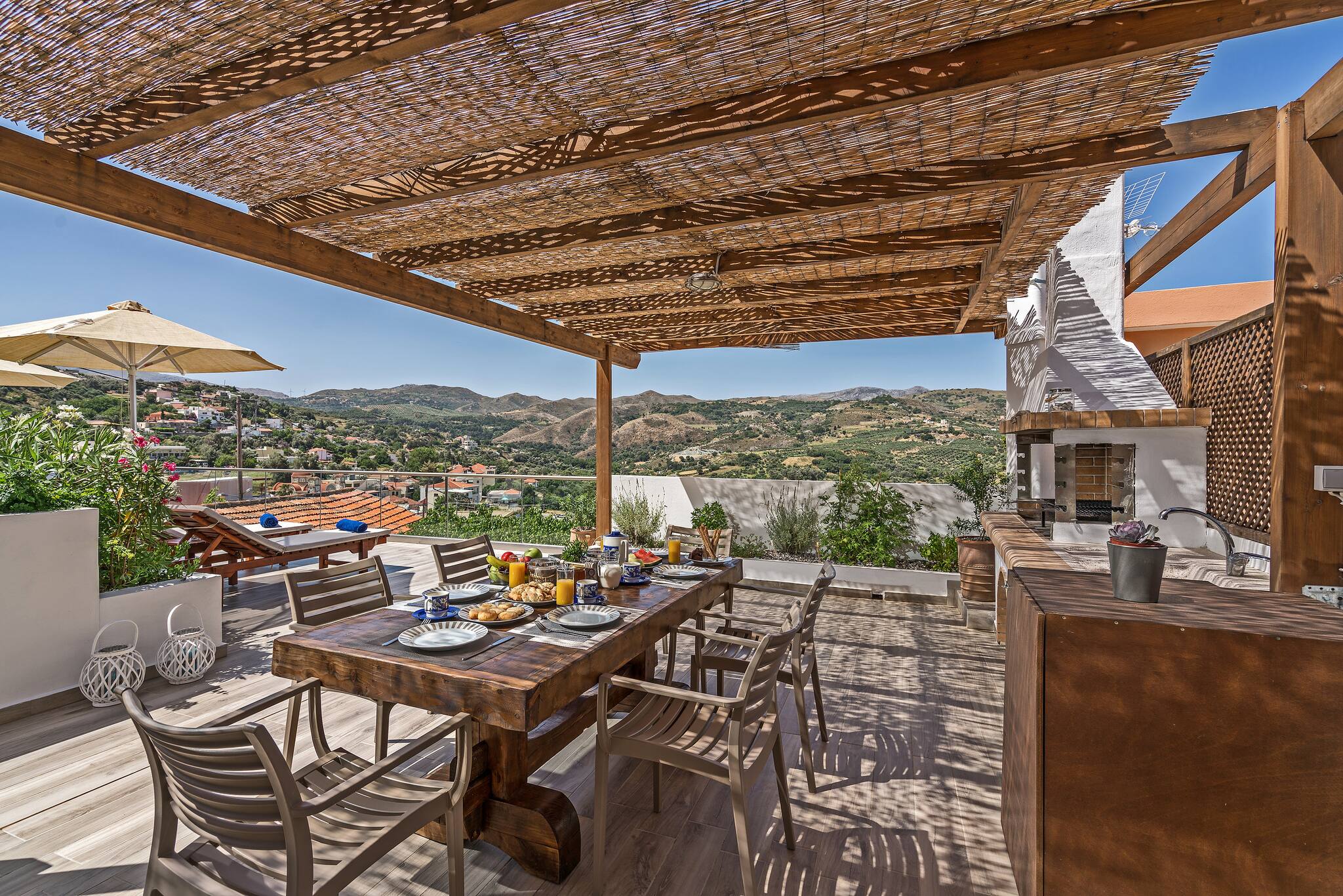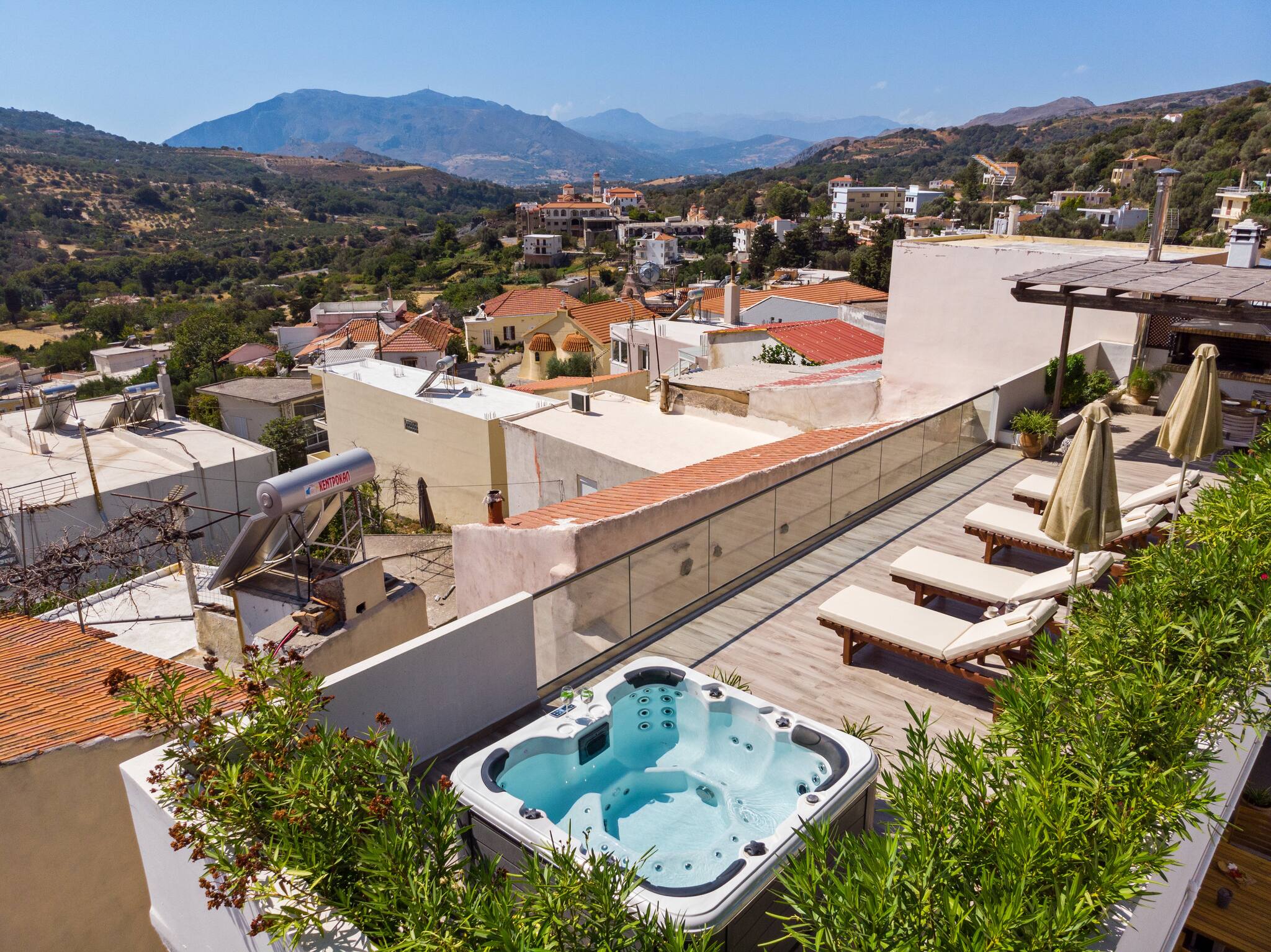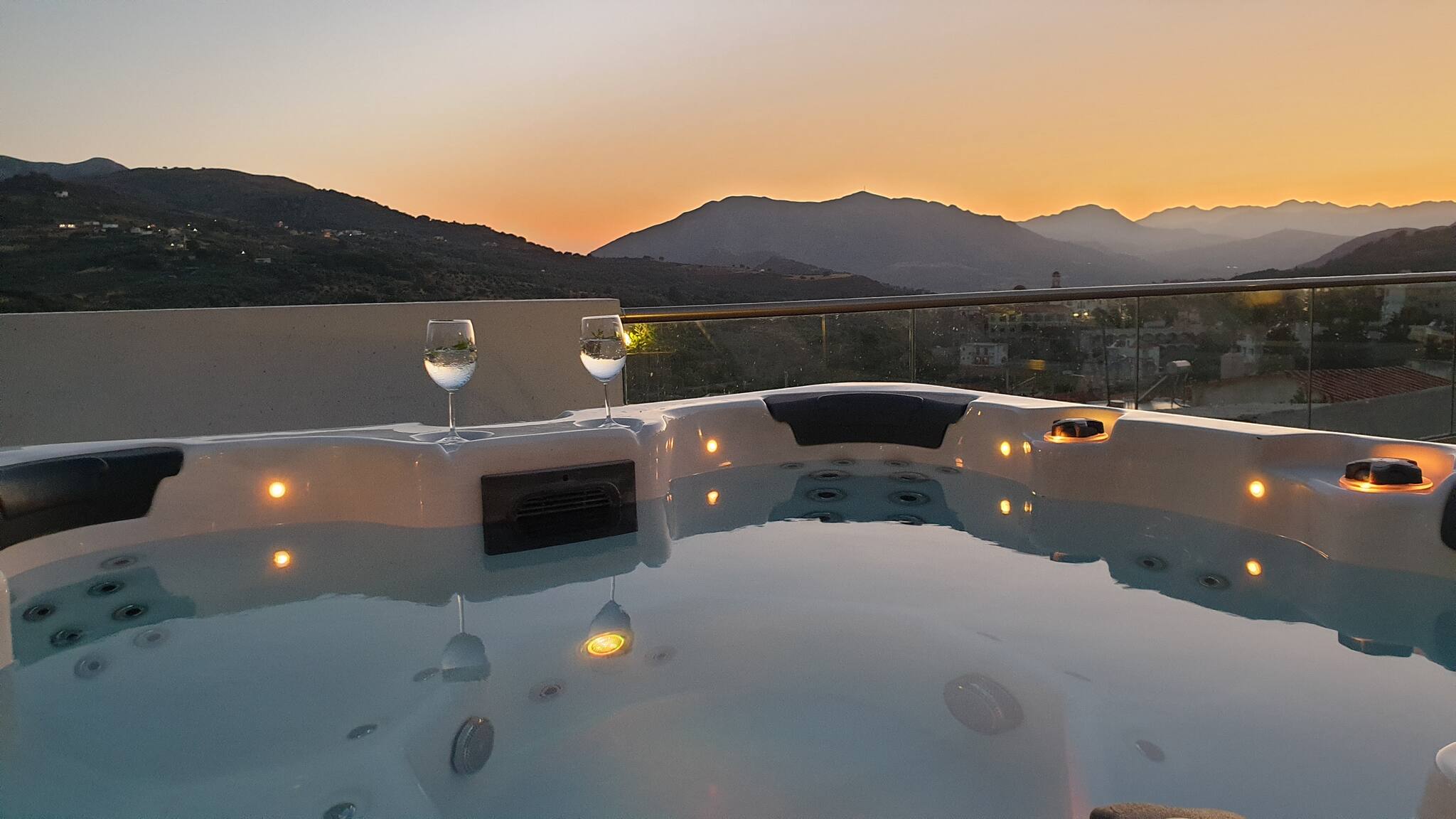 Enjoy the beautiful panoramic views from the rooftop terrace, where you’ll find a Jacuzzi — perfect for romantic moments — and a barbecue area ideal for gatherings with family or friends. You can also unwind by the private plunge pool in the backyard, surrounded by sunbeds, local flowers, herbs, and vegetables, while soaking up the Cretan sun.