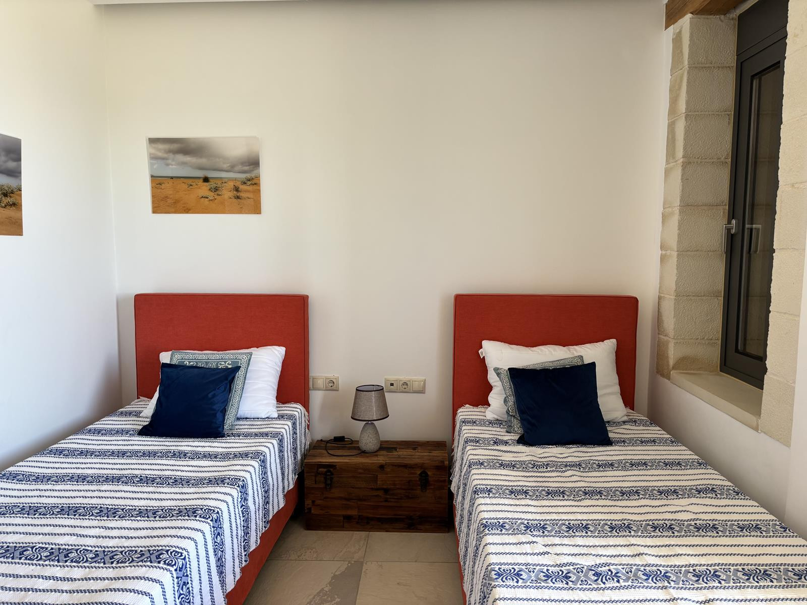 The upper floor hosts two additional bedrooms: one with a double bed and one with two twin beds, along with access to a balcony where guests can enjoy the stunning views.